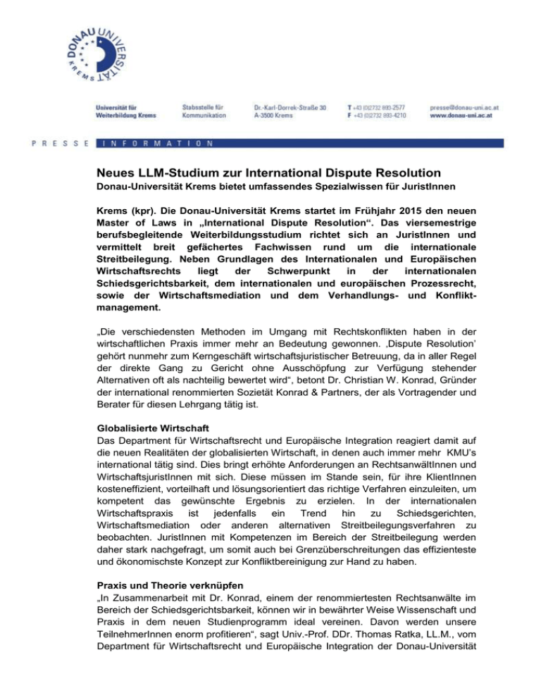 Neues LLM-Studium zur International Dispute Resolution Donau-Universität Krems bietet umfassendes Spezialwissen für JuristInnen Krems (kpr). Die Donau-Universität Krems startet im Frühjahr 2015 den neuen Master of Laws in „International Dispute Resolution“. Das viersemestrige berufsbegleitende Weiterbildungsstudium richtet sich an JuristInnen und vermittelt breit gefächertes Fachwissen rund um die internationale Streitbeilegung. Neben Grundlagen des Internationalen und Europäischen Wirtschaftsrechts liegt der Schwerpunkt in der internationalen Schiedsgerichtsbarkeit, dem internationalen und europäischen Prozessrecht, sowie der Wirtschaftsmediation und dem Verhandlungs- und Konfliktmanagement. „Die verschiedensten Methoden im Umgang mit Rechtskonflikten haben in der wirtschaftlichen Praxis immer mehr an Bedeutung gewonnen. ‚Dispute Resolution’ gehört nunmehr zum Kerngeschäft wirtschaftsjuristischer Betreuung, da in aller Regel der direkte Gang zu Gericht ohne Ausschöpfung zur Verfügung stehender Alternativen oft als nachteilig bewertet wird“, betont Dr. Christian W. Konrad, Gründer der international renommierten Sozietät Konrad & Partners, der als Vortragender und Berater für diesen Lehrgang tätig ist. Globalisierte Wirtschaft Das Department für Wirtschaftsrecht und Europäische Integration reagiert damit auf die neuen Realitäten der globalisierten Wirtschaft, in denen auch immer mehr KMU’s international tätig sind. Dies bringt erhöhte Anforderungen an RechtsanwältInnen und WirtschaftsjuristInnen mit sich. Diese müssen im Stande sein, für ihre KlientInnen kosteneffizient, vorteilhaft und lösungsorientiert das richtige Verfahren einzuleiten, um kompetent das gewünschte Ergebnis zu erzielen. In der internationalen Wirtschaftspraxis ist jedenfalls ein Trend hin zu Schiedsgerichten, Wirtschaftsmediation oder anderen alternativen Streitbeilegungsverfahren zu beobachten. JuristInnen mit Kompetenzen im Bereich der Streitbeilegung werden daher stark nachgefragt, um somit auch bei Grenzüberschreitungen das effizienteste und ökonomischste Konzept zur Konfliktbereinigung zur Hand zu haben. Praxis und Theorie verknüpfen „In Zusammenarbeit mit Dr. Konrad, einem der renommiertesten Rechtsanwälte im Bereich der Schiedsgerichtsbarkeit, können wir in bewährter Weise Wissenschaft und Praxis in dem neuen Studienprogramm ideal vereinen. Davon werden unsere TeilnehmerInnen enorm profitieren“, sagt Univ.-Prof. DDr. Thomas Ratka, LL.M., vom Department für Wirtschaftsrecht und Europäische Integration der Donau-Universität Krems. „Damit beweist das Department, welches auf 20 Jahre Erfahrung zurückblicken kann, einmal mehr seine Vorreiterrolle in der juristischen Weiterbildung.“ Das aktuelle Angebot speziell für JuristInnen umfasst neben „Dispute Resolution“ Universitätslehrgänge zum Versicherungsrecht, Vertragsrecht und Vertragsgestaltung sowie zum Bank- und Kapitalmarktrecht. Umfassendes Spezialwissen erwerben Der neue berufsbegleitende Master-Lehrgang „International Dispute Resolution“ zeichnet sich durch namhafte ExpertInnen aus Wissenschaft und Praxis aus, welche als Vortragende in Krems tätig sind. Das LL.M.-Programm versteht sich somit als vertiefte, spezialisierte und anwendungsorientierte juristische Weiterbildung im Bereich der Streitbeilegung. Zudem wird die für eine erfolgreiche Karriere notwendige interdisziplinäre Kompetenz vermittelt. Nach Einführung in das Internationale und Europäische Wirtschaftsrecht werden neben den klassischen Gerichtsverfahren im internationalen Kontext auch die internationale Schiedsgerichtsbarkeit und Wirtschaftsmediation, aber auch Verhandlungsmanagement und Conflict Management vermittelt, und JuristInnen damit zu kompetenten ExpertInnen für Konfliktlösungen im internationalen Bereich ausgebildet. JuristInnen als Zielgruppe Der Lehrgang startet im März 2015 und richtet sich an JuristInnen mit Interesse an International Dispute Resolution, vor allem an RechtsanwältInnen, RechtsanwaltsanwärterInnen (KonzipientInnen), WirtschaftsjuristInnen sowie AbsolventInnen rechtswissenschaftlicher Studien. Er schließt mit dem Master of Laws (LL.M.) ab. Die einzelnen Unterrichtsmodule werden berufsbegleitend in Krems absolviert. 90 ECTS, Kosten: 11.900 Euro. Nähere Informationen unter: www.donau-uni.ac.at/dispute (16.05.16) 4.279 Zeichen (inkl. Leerzeichen) Bild: Spezielle Rechtskompetenzen vermittelt ein neuer Lehrgang ab 2015 an der Donau-Universität Krems: Univ.-Prof. DDr. Thomas Ratka, Donau-Universität Krems, (li.) und Dr. Christian W. Konrad, Konrad & Partners. (Foto: Konrad & Partners) Das Bild darf ausschließlich in redaktionellen Medienberichten über die Donau-Universität Krems verwendet werden. Die Veröffentlichung ist unter Angabe des Fotonachweises honorarfrei. Rückfragen und Kontakt Kornelia Schock Donau-Universität Krems Department für Wirtschaftsrecht und Europäische Integration Tel. 02732/893-2403 [email protected] www.donau-uni.ac.at