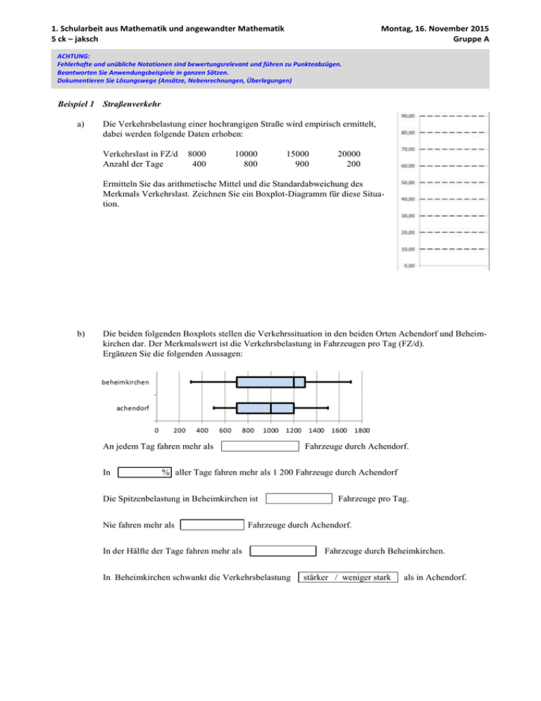 1. Schularbeit aus Mathematik und angewandter Mathematik 5 ck – jaksch Montag, 16. November 2015 Gruppe A ACHTUNG: Fehlerhafte und unübliche Notationen sind bewertungsrelevant und führen zu Punkteabzügen. Beantworten Sie Anwendungsbeispiele in ganzen Sätzen. Dokumentieren Sie Lösungswege (Ansätze, Nebenrechnungen, Überlegungen) Beispiel 1 Straßenverkehr a) Die Verkehrsbelastung einer hochrangigen Straße wird empirisch ermittelt, dabei werden folgende Daten erhoben: Verkehrslast in FZ/d Anzahl der Tage 8000 400 10000 800 15000 900 20000 200 Ermitteln Sie das arithmetische Mittel und die Standardabweichung des Merkmals Verkehrslast. Zeichnen Sie ein Boxplot-Diagramm für diese Situation. b) Die beiden folgenden Boxplots stellen die Verkehrssituation in den beiden Orten Achendorf und Beheimkirchen dar. Der Merkmalswert ist die Verkehrsbelastung in Fahrzeugen pro Tag (FZ/d). Ergänzen Sie die folgenden Aussagen: An jedem Tag fahren mehr als In Fahrzeuge durch Achendorf. % aller Tage fahren mehr als 1 200 Fahrzeuge durch Achendorf Die Spitzenbelastung in Beheimkirchen ist Nie fahren mehr als Fahrzeuge pro Tag. Fahrzeuge durch Achendorf. In der Hälfte der Tage fahren mehr als In Beheimkirchen schwankt die Verkehrsbelastung Fahrzeuge durch Beheimkirchen. stärker / weniger stark als in Achendorf. c) In den letzten zehn Jahren stieg die Verkehrsbelastung durch das Rampitschtal mit einer Wachstumsrate von durchschnittlich 3 %. Berechnen Sie die Verdopplungszeit für die Verkehrsbelastung. Im Jahr 2014 war die Belastung durchschnittlich 12 000 FZ/d. Berechnen Sie den Zeitpunkt, an dem die Belastung auf 30 000 FZ/d steigt. Argumentieren Sie, warum ein exponentielles Modell auf lange Sicht für diese Situation nicht aufrecht zu halten ist. d) In einer Gemeinde verläuft die Verkehrsbelastung auf der Hauptstraße nach einer logistischen Funktion G(t) = Error!. t ist dabei die Zeit in Jahren nach 2000, G(t) die Verkehrsbelastung in Fahrzeugen pro Tag (FZ/d). Der Funktionsgraph ist in folgendem Diagramm dargestellt. Lesen Sie aus der Graphik den Wert M ab und interpretieren Sie diesen Wert. Lesen Sie aus dem Graphen die Verkehrsbelastung zum Zeitpunkt 0 ab und ermitteln Sie daraus die Größe des Parameters b. Berechnen Sie aus einem weiteren Punkt den Parameter k. Beispiel 2 Straßenverkehr a) Der zeitliche Verlauf der Verkehrsbelastung eines Straßenstückes wird durch die Funktion B(t) = 290 + 340 t – 55 t2 + 3,35 t3 – 0,07t4 modelliert. Dabei ist t die Uhrzeit in Stunden und B die Verkehrsdichte in Fahrzeugen pro Stunde (KFZ/h). Stellen Sie die Funktion im Bereich 0 bis 24 Uhr grafisch dar. Berechnen Sie die Verkehrsspitzen mit Uhrzeit und Verkehrsbelastung und die Zeiten mit dem schwächsten Verkehrsaufkommen (mit den Verkehrsbelastungen). b) Auf einem Straßenstück ist die Verkehrsbelastung mit B(t) = 12(t – 13)2 + 200 für t ∈ [6; 20], wobei t die Uhrzeit bedeutet. B ist die Verkehrsbelastung in Fahrzeugen pro Stunde (FZ/h). Berechnen Sie die Gesamtbelastung zwischen 6:00 Uhr und 20:00 Uhr. Argumentieren Sie, warum man mit diesem Modell die Gesamtbelastung über einen Tag (also von 0:00 Uhr bis 24:00 Uhr) nicht ausrechnen kann. c) Das Verkehrsaufkommen auf einer Straße wird durch Zählung während eines Tages ermittelt. Es ergeben sich folgende Werte: Uhrzeit t Verkehrsdichte V 6 200 9 700 11 600 14 500 18 300 Uhr in Fahrzeugen pro Stunde Rechnen Sie mit Excel eine möglichst gut passende Funktion der Form V(t) = at 4 + bt3 + ct2 + dt + f d) Nehmen Sie an, dass das Ergebnis von Aufgabe 2.c) V(t) = –0,5t4 + 27t3 – 500t2 + 4 000t – 11 000 lautet. Berechnen Sie das Verkehrsaufkommen zu den Zeiten 15:00 Uhr, 8:30 Uhr, 23:00 Uhr. Interpretieren Sie diese Werte auf ihre Validität (wissenschaftliche Wertigkeit). Beispiel 3 Umwelt a) Bei der Verbrennung von Müll entstehen, abhängig von der Verbrennungstemperatur T Schadstoffmengen M. Der Zusammenhang sollte so aussehen: M(T) = a T b. T in Kelvin (K), M in g/h. Berechnen Sie die Parameter a und b durch die Methode der kleinsten Quadrate mit Technologie. Benutzen Sie das richtige Modell. Die gemessenen Zahlen sind: T M b) 300 500 350 450 400 380 500 360 in K in g/h Drei Modelle (linear, exponentiell, potenzbasiert) zeigen folgende Graphen: Die Punktmarkierungen entsprechen den gemessenen Werten. Argumentieren Sie, welches der drei Modelle A, B und C im Sinne der Methode der kleinsten Quadrate am besten passt. Ordnen Sie den Funktionen A, B und C die entsprechenden Formeln zu. Berechnen Sie mit allen Modellen den Wert an der Stelle x = 0. Berechnen Sie um welchen Prozentsatz sich der gerechnete exponentielle Wert vom Messwert an der Stelle 5 unterscheidet. Lesen Sie dazu den Messwert möglichst genau ab. c) Die Leistung einer Windkraftanlage ist proportional zur dritten Potenz der Windgeschwindigkeit, also P = k v3. P in Kilowatt (kW), v in Meter pro Sekunde (m/s). Berechnen Sie den Faktor v durch Regression aus folgenden Daten: v P d) 5 240 10 1900 15 4600 Eine Firma möchte eine Windkraftanlage errichten und finanziert mit einem Kredit über € 30 Mio. das Bauvorhaben. Die Rückzahlungen erfolgen mit 25 Jahresraten. Die erste Rate ist ein Jahr nach Kreditauszahlung fällig. Berechnen Sie die Höhe der Raten bei einem Zinssatz von 4 % dek. p.a.. Beispiel 4 Volkswirtschaft a) In der Population des Staates Bukististan gibt es folgende Einkommensverteilung: Einkommen in GE Anteil in Prozent 10 20 20 40 30 33 40 7 Berechnen Sie, welchen Teil des Volkseinkommens die reichsten 10 % der Bevölkerung erhält. b) Die Armutsgrenze ist folgendermaßen definiert: als arm gilt, der weniger als 60 % des Medians des Volkseinkommens verdient. In der folgenden Tabelle wird die Einkommenstabelle von zwei fiktiven Staaten A und B dargestellt. Berechnen Sie in beiden Staaten die Armutsgrenze und den Anteil der Armen. Einkommen in GE Anteil Staat A in % Anteil Staat B in % 6 30 0 10 35 20 20 30 65 30 5 10 40 0 5 c) Mit der Tabelle von 4.b): Ber