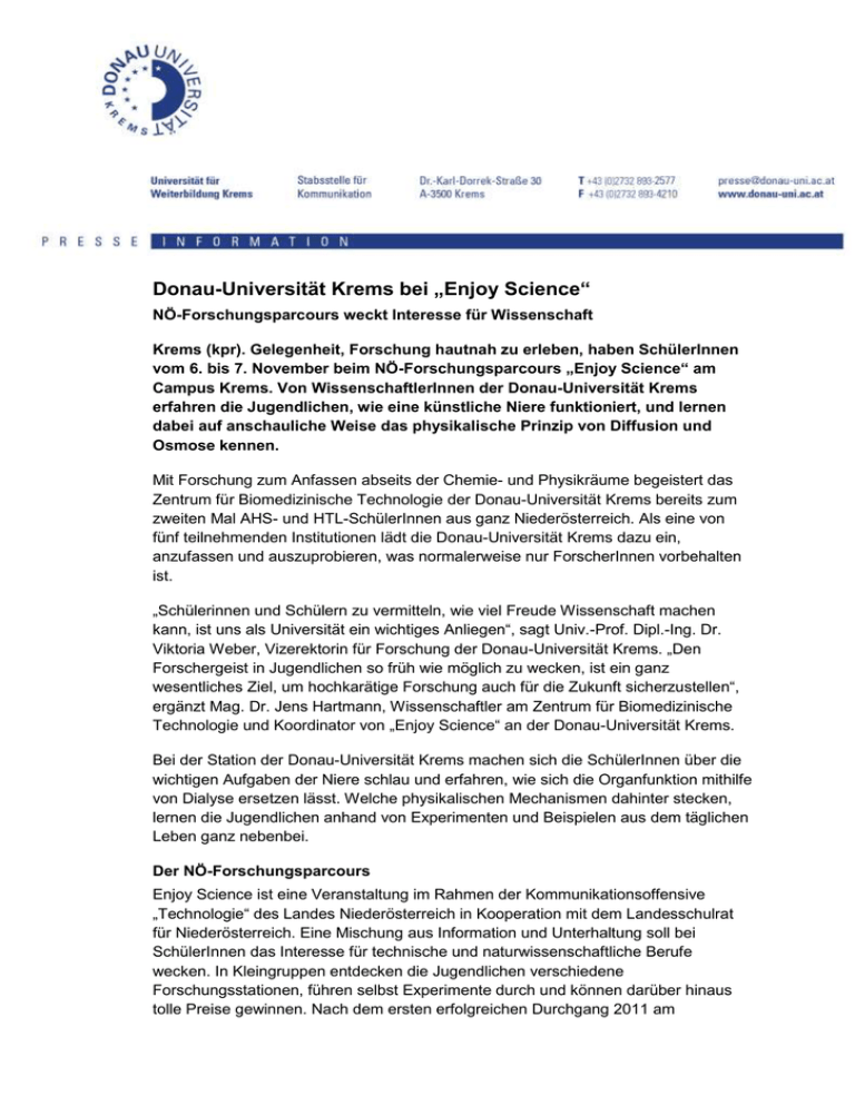 Donau-Universität Krems bei „Enjoy Science“ NÖ-Forschungsparcours weckt Interesse für Wissenschaft Krems (kpr). Gelegenheit, Forschung hautnah zu erleben, haben SchülerInnen vom 6. bis 7. November beim NÖ-Forschungsparcours „Enjoy Science“ am Campus Krems. Von WissenschaftlerInnen der Donau-Universität Krems erfahren die Jugendlichen, wie eine künstliche Niere funktioniert, und lernen dabei auf anschauliche Weise das physikalische Prinzip von Diffusion und Osmose kennen. Mit Forschung zum Anfassen abseits der Chemie- und Physikräume begeistert das Zentrum für Biomedizinische Technologie der Donau-Universität Krems bereits zum zweiten Mal AHS- und HTL-SchülerInnen aus ganz Niederösterreich. Als eine von fünf teilnehmenden Institutionen lädt die Donau-Universität Krems dazu ein, anzufassen und auszuprobieren, was normalerweise nur ForscherInnen vorbehalten ist. „Schülerinnen und Schülern zu vermitteln, wie viel Freude Wissenschaft machen kann, ist uns als Universität ein wichtiges Anliegen“, sagt Univ.-Prof. Dipl.-Ing. Dr. Viktoria Weber, Vizerektorin für Forschung der Donau-Universität Krems. „Den Forschergeist in Jugendlichen so früh wie möglich zu wecken, ist ein ganz wesentliches Ziel, um hochkarätige Forschung auch für die Zukunft sicherzustellen“, ergänzt Mag. Dr. Jens Hartmann, Wissenschaftler am Zentrum für Biomedizinische Technologie und Koordinator von „Enjoy Science“ an der Donau-Universität Krems. Bei der Station der Donau-Universität Krems machen sich die SchülerInnen über die wichtigen Aufgaben der Niere schlau und erfahren, wie sich die Organfunktion mithilfe von Dialyse ersetzen lässt. Welche physikalischen Mechanismen dahinter stecken, lernen die Jugendlichen anhand von Experimenten und Beispielen aus dem täglichen Leben ganz nebenbei. Der NÖ-Forschungsparcours Enjoy Science ist eine Veranstaltung im Rahmen der Kommunikationsoffensive „Technologie“ des Landes Niederösterreich in Kooperation mit dem Landesschulrat für Niederösterreich. Eine Mischung aus Information und Unterhaltung soll bei SchülerInnen das Interesse für technische und naturwissenschaftliche Berufe wecken. In Kleingruppen entdecken die Jugendlichen verschiedene Forschungsstationen, führen selbst Experimente durch und können darüber hinaus tolle Preise gewinnen. Nach dem ersten erfolgreichen Durchgang 2011 am Universitäts- und Forschungszentrum Tulln findet die Veranstaltung heuer am Campus Krems, an der IMC Fachhochschule Krems, statt. Blutreinigung als Forschungsschwerpunkt Die Forschungsarbeiten am Zentrum für Biomedizinische Technologie der DonauUniversität Krems stehen ganz im Zeichen der extrakorporalen Blutreinigung. Im Zusammenspiel verschiedener wissenschaftlicher Disziplinen werden Technologien zur unterstützenden Behandlung von PatientInnen, vor allem bei Leberversagen und Sepsis, entwickelt. Nähere Informationen zum NÖ-Forschungsparcours: www.enjoy-science.at Nähere Informationen zum Zentrum für Biomedizinische Technologie: www.donau-uni.ac.at/biomed (16.05.16) 2.825 Zeichen (inkl. Leerzeichen) Bild „Enjoy Science“: Donau-Universität Krems zeigt SchülerInnen bei "Enjoy Science" wie Dialyse funktioniert. (Foto: DUK/Andrea Reischer) Das Bild darf ausschließlich in redaktionellen Medienberichten über die Donau-Universität Krems verwendet werden. Die Veröffentlichung ist unter Angabe des Fotonachweises honorarfrei. Rückfragen Mag. Dr. Jens Hartmann Zentrum für Biomedizinische Technologie Donau-Universität Krems Tel. +43 (0)2732 893-2623 [email protected] www.donau-uni.ac.at/biomed
