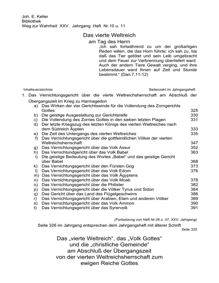 Joh. E. Keller Bibliothek Weg zur Wahrheit XXV. Jahrgang Heft Nr.10 u. 11 Das vierte Weltreich am Tag des Herrn „Ich sah fortwährend zu um der großartigen Reden willen, die das Horn führte; ich sah zu, bis daß das Tier getötet und sein Leib umgebracht und dem Feuer zur Verbrennung überliefert ward. Auch der andern Tiere Gewalt verging, und ihre Lebensdauer ward ihnen auf Zeit und Stunde bestimmt.“ (Dan.7,11-12) Inhaltsverzeichnis Seitenzahl im Jahrgangsheft 1. Das Vernichtungsgericht über die vierte Weltreichsherrschaft am Abschluß Übergangszeit im Krieg zu Harmagedon a) Das Wirken der vier Gerichtswinde für die Vollendung des Zorngerichts Gottes b) Die geistige Ausgestaltung zur Gerichtsreife c) Die Vollendung des Zornes Gottes in den sieben letzten Plagen d) Der letzte Kriegszug des letzten Königs des vierten Weltreiches nach dem Südreich Äypten e) Die Zeit des Untergangs des vierten Weltreiches f) Das Vernichtungsgericht über die gottfeindlichen Völker der vierten Weltreichsherrschaft g) Das Vernichtungsgericht über das Volk Assur h) Das Vernichtundgericht über das Volk Babel i) Die geistige Bedeutung des Wortes „Babel“ und das geistige Gericht über Babel k) Das Vernichtungsgericht über den Fürsten Gog l) Das Vernichtungsgericht über das Volk Edom m) Das Vernichtungsgericht über das Volk Ägyptens n) Das Vernichtungsgericht über das Volk Moab o) Das Vernichtungsgericht über die Philister p) Das Vernichtungsgericht über die Völker Tyrus und Sidon q) Das Gericht über das Land des Flügelgeschwirrs r) Das Vernichtungsgericht über Arabien, Elam und anderen Völker s) Das Vernichtungsgericht über das Volk Ammon t) Das Vernichtungsgericht über das Syrervolk der 325 330 331 333 335 347 352 363 368 373 376 378 382 384 386 389 390 391 (Fortsetzung von Heft Nr.06 u. 07, XXV. Jahrgang) Seite 326 im Jahrgang entsprechen dem Jahrgangsheft mit älterer Schrift Seite 325 Das „vierte Weltreich“, das „Volk Gottes“ und die „christliche Gemeinde“ am Abschluß der Übergangszeit von der vierten Weltreichsherrschaft zum ewigen Reiche Gottes Jahrgang XXV/10-11 -2- 1. Das Vernichtungsgericht über die vierte Weltreichsherrschaft am Abschluß der Übergangszeit im Krieg zu Harmagedon a. Das Wirken der vier Gerichtswinde für die Vollendung des Zorngerichtes Gottes 1. Das Nordreich Syrien – Vorbild und Erfüllung Die Übergangszeit von der vierten Weltreichsherrschaft zum ewigen Reich Gottes ist eine an Ereignissen reich ausgefüllte Zeit, wie es vordem, seitdem Menschen auf der Erde wohnen, keine solche gegeben hat. Dieser Abschnitt der letzten dreieinhalb Jahre dieser Weltzeit hat als Abschluß der Übergangszeit besonders darum so große Bedeutung, weil in demselben sich alle Gerichte auswirken, die von den Propheten, Jesus und den Aposteln für das Ende der Weltzeit geweissagt wurden. Diese Übergangszeit hat Gott in erster Linie zu dem Zweck bestimmt, daß in dieser letzten Epoche der Herrschaftszeit des vierten Weltreiches die Völker dieses Reiches, sowie das im Götzendienst abgefallene Volk Gottes und der fleischlich gesinnte Teil der christlichen Gemeinde sich bis zur vollen Gerichtsreife entwickeln sollen. Nach Gottes Ratschluß ist es aber auch die Zeit, in der sich an allen Völkern der vier Weltreiche alle Gerichte auswirken müssen, die einerseits zur Vernichtung alles gottlosen Wesens dienen und anderseits zur Aufrichtung des ewigen Reiches Gottes mitwirken müssen. Seite 326 Wir kommen darum in der Weiterbetrachtung zu den Schriftzeugnissen, in denen dieses Gericht Gottes ausführlich geweissagt ist. Nach einer Erklärung über die Bedeutung der vier Winde für diese Gerichtszeit ist das Gericht über das vierte Weltreich, als über das Tier mit sieben Häuptern und zehn Hörnern und alle übrigen Völker behandelt. Über die Machtstellung des kleinen Hornes und Tieres bezeugt der Prophet Daniel in Kap.8,9: „Das (kleine Horn) tat außerordentlich groß gegen den Süden und gegen den Aufgang und gegen das herrliche Land.“ Derselbe Prophet schildert in Kapitel 11 das Ereignis des „Endes“ als Kampf des südlichen mit dem nördlichen König in unmittelbarem Anschluß an die Schilderung der Zerteilung des Reiches Alexanders des Großen in vier Teile und des Weiterbestehens von zwei derselben, dem des Nordens (Dan.11,40) und dem des Südens (Dan.11,25.29.40). Man kann die Verse 21-35 vorbildlicherweise in Antiochus Epiphanes, dem syrischen König, erfüllt sehen; zugleich ist man aber genötigt, die Ereignisse in der letzten Zeit erst in ihrer Erfüllung zu sehen, schon darum, weil mit dem Greuel der Verwüstung auf die letzte Jahrwoche von Dan.9,27 hingewiesen ist. Von Vers 36 ab haben wir es aber unzweideutig nur mit dem letzten Weltherrscher des letzten Weltreiches zu tun; denn das dort Gesagte steht in direktem Zusammenhang mit dem in Kapitel 12 geschilderten Ereignis, wenn sich der Fürst Michael zur Wiederherstellung des Volkes Gottes erhebt. Jahrgang XXV/10-11 -3- Dieser Übergang von dem syrischen zum letzten Herrscher des vierten Weltreichs wundert uns nicht, wenn wir sehen, wie Israel in der Endzeit im „Lande des Nordens bei der Tochter Babel“ wohnt (Sach.2,11; Mich.4,10; Jes.48,20; Jer.50,8). Auch das syrische Nordreich besteht eben in den Völkern Assur-Babel-Chaldäa des römischen Reiches weiter. Wenn Israel in den germanischen Völkern Europas vorhanden ist, dann muß seine Verwandtschaft auch in der syrisch-assyrisch-chaldäischen Völkergruppe der romanischen Völker Europas erkannt werden. 2. Das Nordreich Syrien und das Südreich Ägypten am Ende des vierten Weltreiches Wie aber im alten römischen Reich die syrischen und römischen Länder eine Auflockerung ihrer Macht bedingten, die dann in der Teilung in West- und Ostrom zutage trat, so daß das Reich von Anfang an in der Zweiteilung der Schenkel dastand – so birgt die letzte Fassung desselben in der Form der sieben Häupter und zehn Hörner noch viel mehr der z