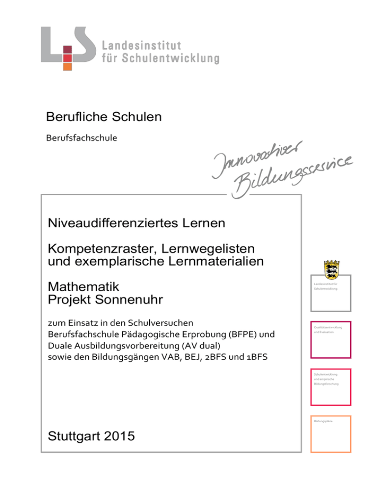 Berufliche Schulen Berufsfachschule Niveaudifferenziertes Lernen Kompetenzraster, Lernwegelisten und exemplarische Lernmaterialien Mathematik Projekt Sonnenuhr zum Einsatz in den Schulversuchen Berufsfachschule Pädagogische Erprobung (BFPE) und Duale Ausbildungsvorbereitung (AV dual) sowie den Bildungsgängen VAB, BEJ, 2BFS und 1BFS Landesinstitut für Schulentwicklung Qualitätsentwicklung und Evaluation Schulentwicklung und empirische Bildungsforschung Bildungspläne Stuttgart 2015 Redaktionelle Bearbeitung Redaktion Tanja Rieger, Ministerium für Kultus, Jugend und Sport Sören Finkbeiner, Landesinstitut für Schulentwicklung, Stuttgart Autor/in Florian Nonnenmann, Gewerbliche Schule, Crailsheim Karl-Heinz Roller, Kaufmännische Schulen, Waldshut Roman Schlosser, Kaufmännische Schule, Crailsheim Stand November 2015 Impressum Herausgeber Landesinstitut für Schulentwicklung (LS) Heilbronner Straße 172, 70191 Stuttgart Telefon: 0711 6642-0 Telefax: 0711 6642-1099 E-Mail: [email protected] www.ls-bw.de Druck und Vertrieb Landesinstitut für Schulentwicklung (LS) Heilbronner Straße 172, 70191 Stuttgart Telefon: 0711 6642-1204 www.ls-webshop.de Urheberrecht Inhalte dieses Heftes dürfen für unterrichtliche Zwecke in den Schulen und Hochschulen des Landes Baden-Württemberg vervielfältigt werden. Jede darüber hinausgehende fotomechanische oder anderweitig technisch mögliche Reproduktion ist nur mit Genehmigung des Herausgebers möglich. Soweit die vorliegende Publikation Nachdrucke enthält, wurden dafür nach bestem Wissen und Gewissen Lizenzen eingeholt. Die Urheberrechte der Copyrightinhaber werden ausdrücklich anerkannt. Sollten dennoch in einzelnen Fällen Urheberrechte nicht berücksichtigt worden sein, wenden Sie sich bitte an den Herausgeber. Bei weiteren Vervielfältigungen müssen die Rechte der Urheber beachtet bzw. deren Genehmigung eingeholt werden. © Landesinstitut für Schulentwicklung, Stuttgart 2015 Landesinstitut für Schulentwicklung Inhaltsverzeichnis Die Seiten sind als Kopiervorlagen angelegt und enthalten deshalb keine durchgängige Seitennummerierung. 1. Kompetenzraster Mathematik 2. Lernwegeliste M03 (projektabhängig) 3. Lernwegeliste M04 (projektabhängig) Lernmaterialien Lernprojekt M04 Projekt Sonnenuhr Advance Organizer Lernthema M03.01 M03.01.01 M03.01.02 Voraussetzungen für das Projekt Sonnenuhr Querschnitt/Längsschnitt Arbeiten mit dem Koordinatensystem Lernthema M04.02 Abbildungen der Normalparabel Infoblatt Verlaufsplanung/Inhalt/Methode/Materialien Abbildungen der Normalparabel/Herleitung der Scheitelform der Parabelgleichung (Stationen), A – C Abbildung der Normalparabel/Wissenssicherung (Placemat 1 und Placemat 2) Erarbeitung der Lösungsformel und Lösungsmengen quadratischer Gleichungen-Hinweise M04.02.01-.03 M04.02.04 M04.02.11 Infoblatt M04.03.01 Grafisches Lösen von linearen Gleichungen Lernthema M04.04 Erarbeitung der Lösungsformel und Lösungsmengen quadratischer Gleichungen – Hinweise für die Lehrperson Erarbeitung der Lösungsformel und Lösungsmengen quadratischer Gleichungen A – C Lösungen Nullstellen und Schnittpunkte – Test M04.04.01 M04.04.02 Lernthema M04.06 Darstellungsformen einer Parabel – Hinweise für die Lehrperson Darstellungsformen A – C Lösungen A – C Mögliche Gedächtniskarte Infoblatt Produktform Abschluss des Projekts – Hinweise für die Lehrperson Erstellung eines Modells der Sonnenuhr Lösung Post Organizer Funktionsgleichung und Form und Lage der Parabel M04.06.01 M04.06.02 M04.06.03 4. Projektunabhängige Lernwegelisten M03.01 M04.02 M04.04 M04.06 Raum und Form Funktionaler Zusammenhang Funktionaler Zusammenhang Funktionaler Zusammenhang M04.02.07 Projektunabhängiger Advance Organizer © Landesinstitut für Schulentwicklung 2015 Landesinstitut für Schulentwicklung Bedeutung der Icons Icon Beschreibung Icon Beschreibung Lernziel A Tipp/Hinweis, der zum Bearbeiten hilfreich ist Lernziel B Vorsicht/Achtung: wichtige Information/Hinweis. Genau lesen! Lernziel C Zeitvorgabe beachten Einzelarbeit Blätter/Materialien ablegen Partnerarbeit Blätter/Materialien holen Gruppenarbeit Lesen/Hilfsmittel/Quellenangabe: Buch oder eigene Aufschriebe Plenum Schreiben/Zeichnen/Malen/ Skizzieren Lehrer fragen/holen Rechnen/ Taschenrechner erlaubt Lehrervortrag Zeichnen/ Zeichenmaterial erforderlich Einzelvortrag, Präsentation Versuch Gruppenvortrag, Präsentation Werkstatt erledigt Beispiel/Vokabelhilfen nicht erledigt Hören Monologisches Sprechen Deutsch => Englisch Dialogisches Sprechen Englisch => Deutsch Gruppennummer, Teilthemen 1, 2 … Gruppennummer, Teilthemen 3, 4 … © Landesinstitut für Schulentwicklung 2015 LFS 1 LFS 2 LFS 3 LFS 4 LFS 5 1. Zahl Ich kann ganze Zahlen, Brüche und Dezimalzahlen nutzen, sie darstellen und mit ihnen rechnen. Ich kann Rechengesetze benennen und diese sicher anwenden. Ich kann Prozent- und Zinsrechnung sachgerecht anwenden. 2. Messen Ich kann mit den Einheiten von Zeit, Geld, Masse, Längen, Flächen und Volumen umgehen. Ich kann Umfang und Flächeninhalt von Dreiecken, Vierecken und daraus zusammengesetzten Figuren berechnen. Ich kann Umfang und FläIch kann die Oberfläche bei cheninhalt von Kreisen und Würfel, Quader, Prisma, Kreissegmenten bestimmen. Zylinder, Pyramide und Kegel bestimmen. 3. Raum und Form Ich kann geometrische Objekte erkennen, benennen und anhand ihrer Eigenschaften beschreiben. Ich kann Netze und Modelle von Würfel, Quader, Prisma, Zylinder, Pyramide und Kegel erstellen. Ich kann das kartesische Ich kann punkt- und achsen- Ich kann Schrägbilder geoKoordinatensystem für die symmetrische Figuren metrischer Körper anfertiDarstellung und Berechnung erkennen und erzeugen. gen. geometrischer Figuren nutzen. 4. Funktionaler Zusammenhang Ich kann Textaufgaben mit der Methode „Dreisatz“ lösen. Ich kann funktionale Zusammenhänge erkennen, beschreiben, grafisch darstellen und interpretieren. Ich kann lineare Gleichungen Ich kann quadratisc