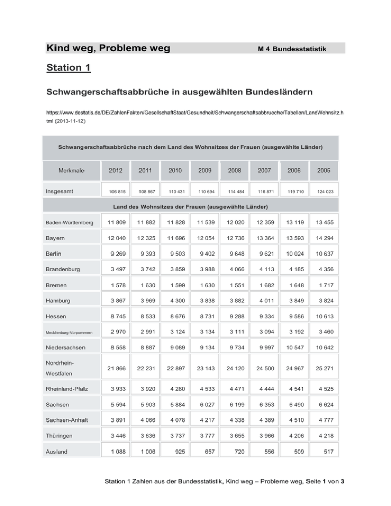 Kind weg, Probleme weg M 4 Bundesstatistik Station 1 Schwangerschaftsabbrüche in ausgewählten Bundesländern https://www.destatis.de/DE/ZahlenFakten/GesellschaftStaat/Gesundheit/Schwangerschaftsabbrueche/Tabellen/LandWohnsitz.h tml (2013-11-12) Schwangerschaftsabbrüche nach dem Land des Wohnsitzes der Frauen (ausgewählte Länder) Merkmale Insgesamt 2012 2011 2010 2009 2008 2007 2006 2005 106 815 108 867 110 431 110 694 114 484 116 871 119 710 124 023 Land des Wohnsitzes der Frauen (ausgewählte Länder) Baden-Württemberg 11 809 11 882 11 828 11 539 12 020 12 359 13 119 13 455 Bayern 12 040 12 325 11 696 12 054 12 736 13 364 13 593 14 294 Berlin 9 269 9 393 9 503 9 402 9 648 9 621 10 024 10 637 Brandenburg 3 497 3 742 3 859 3 988 4 066 4 113 4 185 4 356 Bremen 1 578 1 630 1 599 1 630 1 551 1 682 1 648 1 717 Hamburg 3 867 3 969 4 300 3 838 3 882 4 011 3 849 3 824 Hessen 8 745 8 533 8 676 8 731 9 288 9 334 9 586 10 613 Mecklenburg-Vorpommern 2 970 2 991 3 124 3 134 3 111 3 094 3 192 3 460 Niedersachsen 8 558 8 887 9 089 9 134 9 734 9 997 10 547 10 642 21 866 22 231 22 897 23 143 24 120 24 500 24 967 25 271 Rheinland-Pfalz 3 933 3 920 4 280 4 533 4 471 4 444 4 541 4 525 Sachsen 5 594 5 903 5 884 6 027 6 199 6 353 6 490 6 624 Sachsen-Anhalt 3 891 4 066 4 078 4 217 4 338 4 389 4 510 4 777 Thüringen 3 446 3 636 3 737 3 777 3 655 3 966 4 206 4 218 Ausland 1 088 1 006 925 657 720 556 509 517 NordrheinWestfalen Station 1 Zahlen aus der Bundesstatistik, Kind weg – Probleme weg, Seite 1 von 3 Schwangerschaftsabbrüche Quote je 1 000 Geborene https://www.destatis.de/DE/ZahlenFakten/GesellschaftStaat/Gesundheit/Schwangerschaftsabbrueche/Tabellen/LandWohnsitz.h tml (2013-11-12) Quote je 1000 Geborene1 Merkmale 2012 2011 2010 2009 2008 2007 2006 2005 Deutschland - 162,2 160,9 164,9 166,1 169,3 176,6 179,4 Baden-Württemberg - 133,3 130,0 128,3 130,3 132,7 142,2 142,2 Bayern - 118,5 110,7 115,8 119,4 124,7 129,3 132,8 Berlin - 282,8 293,2 291,8 300,9 307,5 337,1 365,6 Brandenburg - 203,8 202,6 214,1 215,3 220,6 232,7 242,1 Bremen - 300,9 284,7 296,6 277,6 299,5 298,4 311,7 Hamburg - 231,1 246,8 227,8 230,9 239,0 238,4 235,7 Hessen - 165,2 167,0 171,4 178,9 176,8 185,8 198,1 Mecklenburg-Vorpommern - 235,6 233,1 239,8 236,5 240,8 251,6 278,9 Niedersachsen - 144,5 143,5 146,3 149,5 152,5 160,9 158,3 Nordrhein-Westfalen - 154,8 154,8 159,0 160,2 161,5 165,9 164,1 Rheinland-Pfalz - 125,7 135,1 146,2 138,3 136,2 142,5 138,5 Saarland - 171,2 186,6 183,9 186,2 189,0 173,4 186,2 Sachsen - 170,8 167,0 176,2 179,5 187,0 198,6 202,7 Sachsen-Anhalt - 240,5 234,9 245,0 244,2 251,2 265,5 277,2 Thüringen - 212,4 212,5 223,3 210,2 230,3 255,5 251,4 1 Berechnung für 2012 noch nicht möglich, da die Geburtenzahlen 2012 noch nicht vorliegen. - = Nichts vorhanden Station 1 Zahlen aus der Bundesstatistik, Kind weg – Probleme weg, Seite 2 von 3 Kind weg, Probleme weg M6 Zahlen aus der Bundesstatistik Schwangerschaftsabbrüche nach rechtlicher Begründung und vorangegangene Lebendgeburten https://www.destatis.de/DE/ZahlenFakten/GesellschaftStaat/Gesundheit/Schwangerschaftsabbrueche/Tabellen/RechtlicheBegr uendung.html (2013-11-12) Merkmale 2012 Insgesamt 2011 2010 2009 2008 2007 2006 2005 106 815 108 867 110 431 110 694 114 484 116 871 119 710 124 023 Rechtliche Begründung Medizinische Indikation Kriminologische Indikation Beratungsregelung 3 326 3 485 3 077 3 200 2 989 3 072 3 046 3 177 27 25 24 14 21 25 28 21 103 462 105 357 107 330 107 480 111 474 113 774 116 636 120 825 Dauer der Schwangerschaft Dauer von ... bis ... vollendete Wochen unter 12 12 bis 21 22 und mehr 104 069 105 976 107 852 X X X X X 2 299 2 411 2 117 X X X X X 447 480 462 X X X X X vorangegangene Lebendgeborene Keine 42 616 43 937 44 525 44 703 46 683 47 943 48 760 50 357 1 27 914 28 126 28 429 28 864 29 961 30 342 31 055 32 657 2 24 387 24 724 25 082 25 191 25 798 26 519 27 726 28 629 3 8 355 8 508 8 792 8 429 8 626 8 730 8 776 8 911 4 2 409 2 437 2 438 2 373 2 322 2 298 2 344 2 394 5 und mehr 1 134 1 135 1 165 1 134 1 094 1 039 1 049 1 075 nach Familienstand ledig 60 993 61 634 verheiratet 40 742 42 153 43 588 44 661 47 147 48 786 51 119 54 257 verwitwet geschieden 61385 60 632 61 359 61 826 61 919 63 110 222 207 252 259 295 296 382 409 4 858 4 853 5 206 5 142 5 683 5 963 6290 6 247 Station 1 Zahlen aus der Bundesstatistik, Kind weg – Probleme weg, Seite 3 von 3