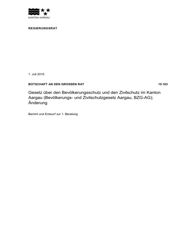 REGIERUNGSRAT 1. Juli 2015 BOTSCHAFT AN DEN GROSSEN RAT 15.163 Gesetz über den Bevölkerungsschutz und den Zivilschutz im Kanton Aargau (Bevölkerungs- und Zivilschutzgesetz Aargau, BZG-AG); Änderung Bericht und Entwurf zur 1. Beratung Inhaltsverzeichnis Zusammenfassung ............................................................................................................................... 4 Glossar inklusive Linkverzeichnis ..................................................................................................... 6 1. Ausgangslage ................................................................................................................................... 7 1.1 Änderung des Bundesgesetzes über den Bevölkerungsschutz und den Zivilschutz und der Zivilschutzverordnung per 1. Januar 2012 sowie Folgerevision per 1. Februar 2015 ...................... 7 1.1.1 Ausbildungsdienste im Zivilschutz ...................................................................................... 7 1.1.2 Schutzräume für die Bevölkerung ....................................................................................... 7 1.1.3 Schutzanlagen .................................................................................................................... 7 1.1.4 Kulturgüterschutz ................................................................................................................ 8 1.1.5 Weitere Änderungen ........................................................................................................... 8 1.2 Bereits vorgenommene Änderung der Verordnung über den Bevölkerungsschutz und den Zivilschutz im Kanton Aargau (BZV-AG) per 1. März 2012 .............................................................. 8 1.3 Festgestellte Vollzugsmängel in der Wirkungskontrolle zum BZG-AG ....................................... 8 1.4 Umsetzung der Konzeption Zivilschutz Aargau 2013 (Neuausrichtung auf elf ZSO-Regionen) ................................................................................................................................. 9 2. Handlungsbedarf .............................................................................................................................. 9 2.1 Revisionsbedarf aufgrund des im Jahr 2012 geänderten Bundesrechts .................................... 9 2.2 Behebung der in der Wirkungskontrolle festgestellten Vollzugsmängel ................................... 10 2.3 Revisionsbedarf aufgrund der Folgerevision im Jahr 2015 und Ausblick auf künftige Gesetzesänderungen ...................................................................................................................... 10 2.3.1 Folgerevision per 1. Februar 2015 .................................................................................... 10 2.3.2 Strategie "Bevölkerungsschutz und Zivilschutz 2015+" .................................................... 10 3. Umsetzung ...................................................................................................................................... 11 4. Auswertung des Anhörungsverfahrens ....................................................................................... 11 5. Erläuterungen zu einzelnen Paragrafen ....................................................................................... 13 6. Auswirkungen ................................................................................................................................. 40 6.1 Personelle und finanzielle Auswirkungen auf den Kanton ........................................................ 40 6.1.1 Ertrag aus Ersatzbeiträgen auf Stufe Kanton ................................................................... 40 6.1.2 Verwaltungsentschädigung aus der Verwaltung der Ersatzbeiträge ................................ 41 6.1.3 Verzinsung der Ersatzbeiträge .......................................................................................... 41 6.1.4 Kostentragung geschützte Spitäler ................................................................................... 42 6.1.5 Schutzanlagen und Kulturgüterschutzräume .................................................................... 42 6.1.6 Flexiblere Weiterverrechnung der Kosten des KKE an die Gemeinden ........................... 43 6.1.7 Entschädigung der Mitnutzung der zentralen Datenbank Zivilschutz (inklusive Materialliste) durch Gemeinden ................................................................................................. 43 6.1.8 Einbezug Dritter in den allgemeinen Kostentragungsgrundsatz ....................................... 43 6.1.9 Neuer Kurs für Kommandantinnen und Kommandanten .................................................. 43 6.1.10 Gesamtdarstellung der finanziellen Auswirkungen auf den Kanton ............................... 44 6.2 Auswirkungen auf die Wirtschaft ............................................................................................... 44 6.3 Auswirkungen auf die Gesellschaft ........................................................................................... 44 6.4 Auswirkungen auf die Umwelt ................................................................................................... 44 6.5 Auswirkungen auf die Gemeinden ............................................................................................ 44 6.5.1 Verwaltung und Verwendung der bis Ende 2011 erhobenen Ersatzbeiträge ................... 44 6.5.2 Reduktion auf elf ZSO und RFO Regionen ...................................................................... 45 6.5.3 Mehrausgaben der Gemeinden ........................................................................................ 45 6.6 Auswirkungen auf die Beziehungen zum Bund und zu anderen Kantonen .............................. 45 2 von 46 7. Weiteres Vorgehen ...........................................................................................................