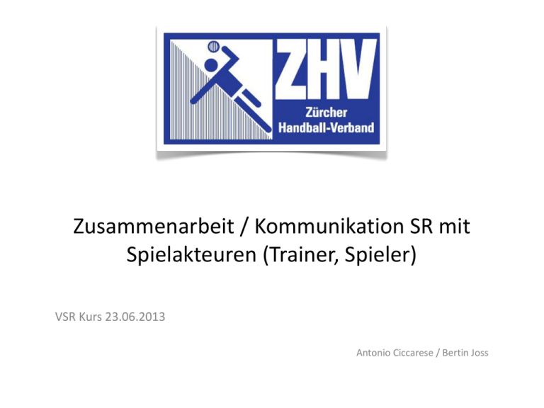 Zusammenarbeit / Kommunikation SR mit Spielakteuren (Trainer, Spieler) VSR Kurs 23.06.2013 Antonio Ciccarese / Bertin Joss Einleitung Ein Trainer des Gegners hat jeden 'Fehlentscheid' lauthals kommentiert und wurde praktisch nicht abgestellt. Es war sicher kein Nachteil für ihn, dass er dauernd gemotzt hat. Zum Teil etwas kleinlich bei 'Emotionen' bzw. reklamieren - vielleicht einmal weghören ;-) Somit wurde nur nach 'Ich glaube das gesehen zu haben' entschieden. Danach eine absolut übertriebene und unberechtigte Rote Karte gegen die Bank. …. einige der Zuschauer befanden sich wenige Meter hinter der Spielerbank. Anweisungen an Spieler und Schiedsrichterentscheidungen wurden natürlich von diesen immer wieder hörbar kommentiert. Das ist prinzipiell ok, aber die Nähe macht dies doch etwas unangenehm. Arrogantes Auftreten!! Liessen sich von der Auswechselbank beeinflussen. TOP! Die beiden sind für mich bezüglich Auftreten das Beste in der 2. Liga. (und das sage ich, obwohl ich letzte Saison einmal vom Platz geflogen bin – bei diesen beiden!) Leitet das Spiel souverän ohne aufzufallen! Zürcher Handball-Verband 23.06.2013 Grobablauf • 5 Minuten Einführung • 10 Minuten Gruppenarbeit • 15-20 Minuten Präsentationen / Diskussionen • 5-10 Minuten Präsentation Lösungsansätze SRO Talentförderung und Schlusswort Zürcher Handball-Verband 23.06.2013 Ziele • • • • SR wird sich bewusst, dass eigenes Verhalten die Zusammenarbeit erleichtern/erschweren kann. SR aufzeigen, wie durch verbale und nonverbale Kommunikation die Basis einer angenehmen Zusammenarbeit gelegt wird. SR darauf sensibilisieren, Emotionen zuzulassen, sich jedoch nicht auf überflüssigen Diskussionen einzulassen. Lösungsansätze zu Situationen aufzeigen, um Entscheidungen / Verhalten zu vereinheitlichen. Zürcher Handball-Verband 23.06.2013 Wird es heute einfach werden? Welche Kommunikationsstrategie? Zürcher Handball-Verband 23.06.2013 Regeln zur Kommunikation? Was steht in den Spielregeln betreffend Verhalten / Kommunikation mit Bank? Alle Beteiligten achten und respektieren sich gegenseitig und machen ihren Einfluss zum Wohle des Handballs geltend. Die SR sind sich ihrer Vorbildfunktion bewusst. ZHV-Verhaltenskodex Zürcher Handball-Verband 23.06.2013 Persönlichkeit • • • • Gelassenheit ist notwendig, aber stets Entscheidungsfreude zeigen Kritikfähig sein und es auch zeigen Eigene Fehler auch mal zugeben und nicht gleich Verteidigerrolle einnehmen Stets bemüht sein, gegenüber anderen Spielbeteiligten sich neutral zu verhalten. => Strafe sollte nicht als Rache erteilt werden bzw. vom Trainer / Spieler als solches interpretiert werden. Zürcher Handball-Verband 23.06.2013 Verhalten der SR Sich bewusst sein, dass es Widerspruch gegen Dich oder deine Entscheidung geben kann (Wahrnehmung ist subjektiv) Zürcher Handball-Verband 23.06.2013 Nonverbale Kommunikation Durch verbale und nonverbale Kommunikation Akzeptanz bei Spielern / Trainern fördern Zürcher Handball-Verband 23.06.2013 Gruppenarbeit A1 C1 SR entscheidet korrekt, Trainer ist unzufrieden, sucht Augenkontakt mit dem SR und schaut ihn fragend an. SR entscheidet falsch, Trainer ist unzufrieden, sucht Augenkontakt mit dem SR und schaut ihn fragend an. SR entscheidet korrekt, Trainer ist unzufrieden. Er sucht den Augenkontakt mit dem SR und manifestiert seine Unzufriedenheit mit langem provokativem Kopfschütteln. SR entscheidet falsch, Trainer ist unzufrieden. Er sucht den Augenkontakt mit dem SR und manifestiert seine Unzufriedenheit mit langem provokativem Kopfschütteln. SR entscheidet korrekt, Trainer ist unzufrieden. C2 Er wendet sich vom SR ab und spricht provokativ laut zu seinem Offiziellen / zum Tisch: „ Hast gesehen, wir werden schon wieder benachteiligt! Schon wieder gegen uns …“ SR entscheidet falsch, Trainer ist unzufrieden. A2 B1 B2 Er wendet sich vom SR ab und spricht provokativ laut zu seinem Offiziellen / zum Tisch: „ Hast gesehen, wir werden schon wieder benachteiligt! Schon wieder gegen uns …“ Aus Dokument von SRO Talentförderung Saison 2013-13 Gruppenarbeit Kommunikation, Konfrontation Zürcher Handball-Verband 23.06.2013 Lösungsansatz A1 SR entscheidet korrekt, Trainer ist unzufrieden, sucht Augenkontakt mit dem SR und schaut ihn fragend an. Wahrnehmung (Wer sieht die Aktion?) Kommunikation erfolgt auschliesslich zwischen Trainer und SR. Die Kommunikation ist für Dritte nicht sichtbar. Reaktion SR (Was wird erwartet?) Der SR sollte oder kann den Coach ignorieren. Entscheidungsgrundlage (Wieso / warum) Der SR hat aufgrund seines richtigen Entscheides keine zusätzlichen Informationen für den Trainer. Bei einer Kommunikation mit dem Trainer besteht die Gefahr, dass er im Anschluss an jeden Entscheid (ob richtig/falsch) stets den Kontakt mit dem SR sucht. Zürcher Handball-Verband 23.06.2013 Lösungsansatz A2 SR entscheidet falsch, Trainer ist unzufrieden, sucht Augenkontakt mit dem SR und schaut ihn fragend an. Wahrnehmung (Wer sieht die Aktion?) Kommunikation erfolgt auschliesslich zwischen Trainer und SR. Die Kommunikation ist für Dritte nicht sichtbar. Reaktion SR (Was wird erwartet?) Der SR sollte dem Coach ein Feedback in Form einer Entschuldigung geben. Das Feedback muss zwingend für den Trainer wahrnehmbar sein. Bsp. kurzes «Sorry» beim Vorbeilaufen oder nonverbal Entscheidungsgrundlage (Wieso / warum) Der SR hat aufgrund seines falschen Entscheides eine Information an den Trainer. Die Bestätigung des Fehlers ist kein Zeichen von Schwäche Die Kommunikation an den Trainer in einer solchen Situation (auf tiefem emotionalen Level) schafft eine gute Basis für die Kommunikation im weiteren Spielverlauf Zürcher Handball-Verband 23.06.2013 Lösungsansatz B1 SR entscheidet korrekt, Trainer ist unzufrieden. Er sucht den Augenkontakt mit dem SR und manifestiert seine Unzufriedenheit mit langem provokativem Kopfschütteln. Wahrnehmung (Wer sieht die Aktion?) Kommunikation erfolgt (zwar) zwis