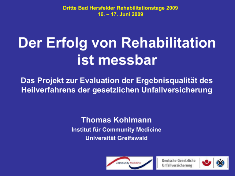 Dritte Bad Hersfelder Rehabilitationstage 2009 16. – 17. Juni 2009 Der Erfolg von Rehabilitation ist messbar Das Projekt zur Evaluation der Ergebnisqualität des Heilverfahrens der gesetzlichen Unfallversicherung Thomas Kohlmann Institut für Community Medicine Universität Greifswald Konzepte der Qualitätsentwicklung Wie ist Erfolg in der Rehabilitation messbar? Patientennahe Assessments Das Forschungsvorhaben der Deutschen Gesetzlichen Unfallversicherung Kontext Wachsende Bedeutung der Qualitätssicherung in der Medizin Effektivitäts- und Effizienznachweise bei enger werdenden ökonomischen Randbedingungen Patientenorientierung und Nutzertransparenz Anpassung an höhere Komplexität des Leistungsgeschehens Gesetzliche Regelungen (u.a. §20 SGB IX, §135a SGB V) Jäckel & Farin 2004 3-Ebenen-Modell nach Donabedian Strukturqualität Prozessqualität Ergebnisqualität z.B.: z.B.: z.B.: Ausstattung der Klinik Dokumentation Klinische Befunde Therapieplan Erwerbsfähigkeit Behandlungsstandards Subjektive Gesundheit / Zufriedenheit Personalschlüssel und Qualifikation Zwei „Idealtypen“ der Evaluation Formative Prozessevaluation Struktur Prozess Summative Ergebnisevaluation Struktur Ergebnis Prozess Ergebnis intern, kontinuierlich extern, episodisch Wie sind Ergebnisse bzw. der Erfolg messbar? Definition von Erfolgskriterien Klinische Ergebnisparameter - Klinische Befunde, Scores, klinische Funktionsmessung - Komplexe Funktionsmessung (z.B. EFL) - Komplikations- und Rehospitalisierungsraten Siegel et al. Back Performance Scale (BPS) Strand et al. (Nor) Spine 26,2001 Definition von Erfolgskriterien Klinische Ergebnisparameter - Klinische Befunde, Scores, klinische Funktionsmessung - Komplexe Funktionsmessung (z.B. EFL) - Komplikations- und Rehospitalisierungsraten Sozialmedizinische Ergebnisparameter - Dauer der Arbeitsunfähigkeit - Rückkehr an den alten / anderen Arbeitsplatz - Berentung - Inanspruchnahme medizinischer Leistungen Handreha-Management nach distaler Radiusfraktur Lohsträter, 2007 Dauer der Arbeitsunfähigkeit Mittelwert Std.-Abw. AU-Tage Gesamt KG IG 92,6 60,2 105,8 38,8 AU-Tage A-Frakturen KG IG 91,2 49,5 147,3 36,3 AU-Tage B-Frakturen KG IG 64,9 48,3 39,8 19,2 AU-Tage C-Frakturen KG IG 113,5 81,6 106,6 45,2 Lohsträter, 2007 Berufliche Situation nach der medizinischen Rehabilitation (Qualitätsgemeinschaft Schleswig-Holstein, N=1.268) 100 90 Prozent . 80 anderes Rentenantrag, Rente 70 60 50 40 Arbeitsplatz verloren, aufgegeben kürzere, angepasste Arbeitszeit neue Aufgabe / alter Arbeitgeber 30 20 Arbeitgeber gewechselt 10 keine Änderung 0 Deck 2007 Berufliche Situation nach der medizinischen Rehabilitation (Qualitätsgemeinschaft Schleswig-Holstein, N=1.268) 100 90 Prozent . 80 anderes Rentenantrag, Rente 70 60 50 40 Arbeitsplatz verloren, aufgegeben kürzere, angepasste Arbeitszeit neue Aufgabe / alter Arbeitgeber 30 20 Arbeitgeber gewechselt 10 keine Änderung 0 Deck 2007 Definition von Erfolgskriterien Klinische Ergebnisparameter - Klinische Befunde, Scores, klinische Funktionsmessung - Komplexe Funktionsmessung (z.B. EFL) - Komplikations- und Rehospitalisierungsraten Sozialmedizinische Ergebnisparameter - Dauer der Arbeitsunfähigkeit - Rückkehr an den alten / anderen Arbeitsplatz - Berentung - Inanspruchnahme medizinischer Leistungen Patientennahe Ergebnisparameter - Behandlungszufriedenheit - Subjektiver Gesundheitszustand und Lebensqualität -> präferenzbasiert (EQ-5D, QALYs) -> generisch (SF-36) -> krankheitsspezifisch (DASH, WOMAC, FFbH-R) Wie kann man subjektive Gesundheit messen? Methodische Zugänge telefonische Befragung Persönliches Interview Schriftlicher Fragebogen Lebensqualitätsbefragung PDA PC / Internet (Ausschnitt) In diesem Fragebogen geht es um die Beurteilung Ihres Gesundheitszustandes. Der Bogen ermöglicht es, im Zeitverlauf nachzuvollziehen, wie Sie sich fühlen und wie Sie im Alltag zurechtkommen. Bitte beantworten Sie jede Frage, indem Sie bei den Antwortmöglichkeiten die Zahl ankreuzen, die am besten auf Sie zutrifft. Ausgezeichnet Wie würden Sie Ihren Gesundheitszustand im Allgemeinen beschreiben? ................................ [1] Derzeit viel besser Im Vergleich zum vergangenen Jahr, wie würden Sie Ihren derzeitigen Gesundheitszustand beschreiben? ............................................ [1] Sehr gut Gut Weniger gut Schlecht [2] [3] [4] [5] Derzeit Etwa wie Derzeit Derzeit etwas vor einer etwas viel besser Woche schlechter schlechter [2] [3] [4] [5] Im folgenden sind einige Tätigkeiten aufgeführt, die Sie vielleicht an einem normalen Tag ausüben. Sind Sie durch Ihren derzeitigen Gesundheitszustand bei diesen Tätigkeiten eingeschränkt? Wenn ja, wie stark? viel besser Im Vergleich zum vergangenen Jahr, wie würden Sie Ihren derzeitigen Gesundheitszustand beschreiben? ............................................ [1] (Ausschnitt) etwas besser [2] vor einer etwas viel Woche schlechter schlechter [3] [4] [5] Im folgenden sind einige Tätigkeiten aufgeführt, die Sie vielleicht an einem normalen Tag ausüben. Sind Sie durch Ihren derzeitigen Gesundheitszustand bei diesen Tätigkeiten eingeschränkt? Wenn ja, wie stark? Ja, stark eingeschränkt Ja, etwas eingeschränkt Nein, überhaupt nicht eingeschränkt a. anstrengende Tätigkeiten, z.B. schnell laufen, schwere Gegenstände heben, anstrengenden Sport treiben ........................................................................[1] [2] [3] b. mittelschwere Tätigkeiten, z.B. einen Tisch verschieben, staubsaugen, kegeln, Golf spielen ..................[1] [2] [3] c. Einkaufstaschen heben oder tragen .................................[1] [2] [3] Struktur eines standardisierten Fragebogens nach Marquis et al. 1999 Fragebogen .... ITEMS SKALEN INDEX Skala 1 Skala 2 Skala 3 Skala 4 Skala 5 Gesamtwert 1 Gesamtwert 2 (z.B. physische Komponente) (z.B. psychische Komponente) .... Systematik patientenbezogener Assessments Profil generisch spezifisch Index Short-Form (SF-) 36 Frag