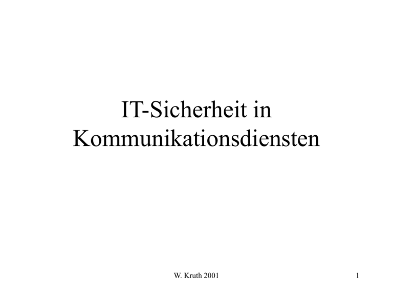 IT-Sicherheit in Kommunikationsdiensten W. Kruth 2001 1 Verbesserungsvorschläge werden gerne angenommen: Mail-Adresse: [email protected] Danke. W. Kruth 2001 2 Modulstruktur • 1 Datenschutz, Datensicherung, ITSicherheit • 2 Durchführung einer Bedrohungs-, Risiko- und Schadensanalyse • 3 Datenschutz- und Datensicherungskonzept • 4 Sicherheit im Intranet und Internet W. Kruth 2001 3 Modulstruktur • 5 Kryptografie und Digitale Signatur • 6 Sicherheit im E-Business • 7 Sicherheit von E-Government-Prozessen W. Kruth 2001 4 Modul 1 Datenschutz Datensicherung IT-Sicherheit W. Kruth 2001 5 Datenschutz • Datenschutz ist der normative Auftrag an juristische Personen des privaten und öffentlichen Rechts, das informationelle Selbstbestimmungsrecht des Einzelnen vor unzulässiger Beeinträchtigung zu schützen. W. Kruth 2001 6 Datenschutz • Die nicht-automatisierte und automatisierte – Erhebung – Speicherung – Verarbeitung – Übermittlung personenbezogener Daten ist nur zulässig, wenn dies durch Gesetz oder andere Rechtsvorschrift ausdrücklich bestimmt ist. W. Kruth 2001 7 Datenschutz • Personenbezogene Daten sind alle – Informationen bei nicht-automatisierter DV bzw. – Daten bei automatisierter DV, die direkt oder indirekt sich auf – Eigenschaften – wirtschaftliche und soziale Verhältnisse einer natürlichen Person beziehen. W. Kruth 2001 8 Datenschutz • Außerhalb der normativ geregelten Erlaubnistatbestände dürfen personenbezogene Daten nur mit einer auf Sacherkennung basierenden Einwilligung der betroffenen natürlichen Person erhoben werden. W. Kruth 2001 9 Datenschutz • Rechtsvorschriften zum Datenschutz sind zunächst lex specialis mit Anwendungsvorrang vor lex generalis. • Lex generalis wirken subsidiär. • Das Wissen über die infrage kommenden Rechtsvorschriften ist eine essentielle Voraussetzung für praktizierbaren Datenschutz. W. Kruth 2001 10 Datenschutz • Die Datenschutz-Kompetenz ist bei der Stelle oder Person angesiedelt, die nach den Organisationsregeln des Unternehmens die originäre Zuständigkeit für die Erhebung, Speicherung, Verarbeitung oder Übermittlung von definierten personenbezogenen Daten verliehen bekommt. W. Kruth 2001 11 Datenschutz • Diese „verantwortliche Stelle“ kann sich externer Unterstützung durch Outsourcing bedienen (Auftragsdatenverarbeitung). • Bei Auftragsdatenverarbeitung wird der Auftragnehmer aus datenschutzrechtlicher Sicht Bestandteil der verantwortlichen Stelle. W. Kruth 2001 12 Datenschutz • Werden personenbezogene Daten von einer verantwortlichen Stelle an eine andere Stelle innerhalb oder außerhalb des Unternehmens übermittelt, die ein legales und nachprüfbares Interesse bekundet, wird die empfangende Stelle ebenfalls „verantwortliche Stelle“ im Sinne der Datenschutzgesetze. W. Kruth 2001 13 Datenschutz • Beim gemeinsamen Zugriff mehrerer Stellen auf einen gemeinsamen Datenbestand mit personenbezogenen Daten müssen die Individualund Gruppenrechte exakt spezifiziert sein. • Verantwortliche Stelle für die einzelnen Daten ist jeweils die Organisationseinheit oder Person, der die Pflege der Daten obliegt. W. Kruth 2001 14 Datenschutz • Datenschutz ist insgesamt eine Aufgabe des Unternehmens, die in der Binnenorganisation auf die verantwortlichen Stellen im Wege der Aufgaben- und Zuständigkeitsverteilung übertragen wird. W. Kruth 2001 15 Datensicherung • Datensicherung als Normbegriff der Rechtsordnung ist die Summe aller technischen und organisatorischen Maßnahmen zur Gewährleistung des Datenschutzes. • Die Maßnahmen müssen in einem angemessenen Verhältnis zum angestrebten Schutzzweck stehen. W. Kruth 2001 16 Datensicherung • Datensicherung als technischer Begriff ist die Summe aller planenden, steuernden, verarbeitenden und kontrollierenden Maßnahmen zur Gewährleistung der Sicherheitsziele – Verfügbarkeit – Integrität der informationstechnischen Infrastruktur. W. Kruth 2001 17 Datensicherung • Datensicherung als antiquierter Begriff beschränkt sich auf alle Maßnahmen zur Kopieerstellung von Datenbeständen mit dem Ziel der Rekonstruktion bei Verlust der Verfügbarkeit und / oder der Integrität. W. Kruth 2001 18 Datensicherung • Datensicherung zur Gewährleistung der Verfügbarkeit und Integrität der informationstechnischen Infrastruktur ist im weiteren Sinne auch Voraussetzung für die Erzielung einer Gesamtsicherheit, die alle Komponenten der IT-Infrastruktur erfasst, die für die betrieblichen Wertschöpfungsprozesse relevant sind. W. Kruth 2001 19 Datensicherung • Das Interesse eines Unternehmens und seiner Leistungseinheiten ist primär auf die Sicherstellung der kontinuierlichen Bedürfnisbefriedigung und der Gewinnmaximierung ausgerichtet. • Das Interesse des Einzelnen fokussiert primär auf den Schutz seiner personenbezogenen Daten vor Missbrauch. W. Kruth 2001 20 IT-Sicherheit • Ein IT-System stellt die Zusammenfassung von – Objekten, – Subjekten, – möglichen Aktionen und – Umfeldbedingungen dar. W. Kruth 2001 21 IT-Sicherheit • Objekte eines IT-Systems sind alle aktiven und passiven Komponenten der – Hardware und Software und die – gespeicherten Daten. • Als IT-System im weiteren Sinne wird auch die informationstechnische Infrastruktur bezeichnet. W. Kruth 2001 22 IT-Sicherheit • Diese Objekte werden einzeln, in ihrer Ordnung nach Gruppen oder als Gesamtobjekte eines IT-Systems als „schutzwürdige Objekte“ bezeichnet. • Für jedes Objekt muss geregelt sein, welche Subjekte und welchen Voraussetzungen den Zugang und den Zugriff erhalten. W. Kruth 2001 23 IT-Sicherheit • Als Zugangsverfahren wird das Anmeldeverfahren von Subjekten zu IT-Systemen oder einzelnen Objekten bezeichnet. • Im Zugangsverfahren wird die Berechtigung von natürlichen oder technischen Subjekten durch technische oder logische Verfahren zur Identifizierung und / oder Authentifizierung überprüft. W. Kruth 2001 24 IT-Sicherheit •