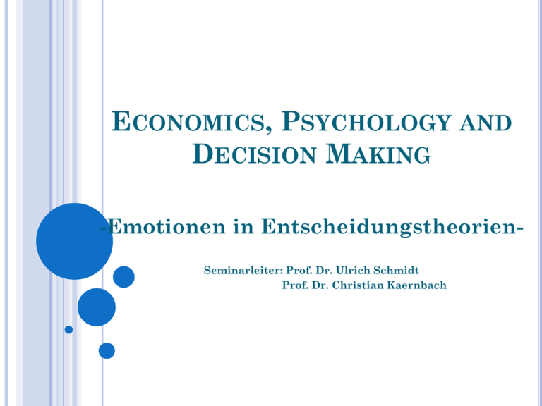 ECONOMICS, PSYCHOLOGY AND DECISION MAKING -Emotionen in EntscheidungstheorienSeminarleiter: Prof. Dr. Ulrich Schmidt Prof. Dr. Christian Kaernbach Warum käme es für manche Menschen nie in Frage, ein anderes Auto zu kaufen als einen VW? Warum neigen Frauen dazu, teure unbequeme Schuhe zu kaufen, obwohl sie wissen, dass sie diese nie tragen werden? Welche Rolle spielen Vertrauen, Fairness und Kooperationen für unser wirtschaftliches Verhalten? Emotionen in Entscheidungstheorien GLIEDERUNG Das ökonomische Verhaltensmodell Emotionen als Einflussfaktoren des Verhaltens Neuroökonomie Zusammenfassung Emotionen in Entscheidungstheorien DAS ÖKONOMISCHE VERHALTENSMODELL DAS MENSCHENBILD DES HOMO OECONOMICUS Ziel: Optimierung des persönlichen Nutzen trifft Entscheidungen rational und eigennützig Emotionen und Probleme der Selbstkontrolle spielen bei der Entscheidungsfindung keine Rolle verfügt über: vollständige Informationen vollständiger Voraussicht unerschöpfliche Kapazitäten Emotionen in Entscheidungstheorien DAS ÖKONOMISCHE VERHALTENSMODELL GRENZEN DES ÖKONOMISCHEN MENSCHENBILDES Begrenzte Rationalität kognitive und emotionale Beschränkungen Fehlen von klaren und wohlgeordneten Präferenzen Gewohnheiten Bsp.: Wahlverhalten in demokratischen Staaten Begrenzter Eigennutz Verhalten der Menschen entspricht häufig sozialen Normen wie Fairness und Reziprozität bisherige Annahme: Interessen werden egoistisch verfolgt Emotionen in Entscheidungstheorien DAS ÖKONOMISCHE VERHALTENSMODELL GRENZEN DES ÖKONOMISCHEN MENSCHENBILDES Vertrauen Vertrauen vor allem dann von erheblicher Bedeutung, wenn die Annahme unvollständiger Informationen vorliegt Emotionen Entscheidungsfindung wird in vielen Situationen durch Emotionen geprägt Bsp.: Impulshandlung Emotionen in Entscheidungstheorien EMOTIONEN ALS EINFLUSSFAKTOREN DES VERHALTENS EMOTIONEN = „als ein komplexes Muster körperlicher und mentaler Veränderungen, darunter physiologische Erregung, Gefühle, kognitive Prozesse und Reaktionen im Ver-halten als Antwort auf eine Situation, die als per- sönlich wahrgenommen wird“ definiert bedeutsam (Quelle: Zimbardo, Gerrig (2008), S. 454) Emotionen in Entscheidungstheorien EMOTIONEN ALS EINFLUSSFAKTOREN DES VERHALTENS EINFLUSS VON EMOTIONEN IN SPIELTHEORETISCHEN ANSÄTZEN Fairness Bsp.: Ultimatum-Spiel Person A erhält 100,- € und soll sich diese mit einer unbekannten Person teilen rational handelnder Mensch würde den kleinstmöglichen Betrag anbieten Angebote liegen zwischen 40 % und 50 % Verteilung wird für fair erachtet faires Verhalten ist eher auf moralische Gefühle als auf rationale Gründe zurückzuführen Emotionen in Entscheidungstheorien EMOTIONEN ALS EINFLUSSFAKTOREN DES VERHALTENS EINFLUSS VON EMOTIONEN IN SPIELTHEORETISCHEN ANSÄTZEN Vertrauen Bsp.: Interaktionen bei eBay Durchführung einer Vertrauenshandlung durch das Bezahlen der Ware und Transaktionskosten Vertrauen in eine Ausblendung andere Person weiterer führt zur möglicher Handlungsalternativen Ausblendung von latent Vorhandenem lässt wieder emotio- nale Einflüsse vermuten gegenseitige Vertrauensbeziehung resultiert aus den Emotionen Dankbarkeit oder Verpflichtung Emotionen in Entscheidungstheorien EMOTIONEN ALS EINFLUSSFAKTOREN DES VERHALTENS EINFLUSS VON EMOTIONEN IN SPIELTHEORETISCHEN ANSÄTZEN Auswirkung von „Negativ-Emotionen“ Bsp.: Power-to-take-Spiel (Experiment von Bosman und van Winden) Nachweis, dass es einen Zusammenhang zwischen evolutionär wichtigen Entscheidungen und Emotionen gibt Ergebnis: Probanden, die negative Emotionen empfunden haben, wählten eine Strategie, die zu beträchtlichen Effizienzver- lusten führte Emotionen in Entscheidungstheorien NEUROÖKONOMIE GRUNDVERSTÄNDNIS Teilgebiet der verhaltensorientierten Ökonomie Anwendung in der Entscheidungs- und Spieltheorie sowie in der Neurofinance und dem Neuromarketing nutzt Methoden der Neurowissenschaft Hypothese: ökonomische Entscheidungen folgen nicht nur Zweck- Mittel-Orientierungen, sondern werden auch durch Emoti- onen und Affekte geprägt Emotionen in Entscheidungstheorien NEUROÖKONOMIE GRUNDVERSTÄNDNIS Gründe für das Interesse der Ökonomen an der Neurowissenschaft Fehlen begründeter Aussagen in intra- und interpersonellen Entscheidungsprozessen Lieferung von Gründen für bestimmtes Verhalten Emotionen in Entscheidungstheorien NEUROÖKONOMIE GEGENSTAND NEUROÖKONOMISCHER UNTERSUCHUNGEN zentraler Gegenstand: Faktoren, die interpersonelle Entscheidungsprozesse der Subjekte beeinflussen Faktoren, die intrapersonelle Entscheidungsprozesse be- einflussen Emotionen in Entscheidungstheorien NEUROÖKONOMIE VERNETZUNG NEUROWISSENSCHAFTLICHER UND ÖKONOMISCHER UNTERSUCHUNGEN Ziel neuroökonomischer Studien: Antwort auf die Frage zu finden, wie Affekte und Emotionen auf Entscheidungen Einfluss nehmen neurowissenschaftliche Experimente genutzt untersuchen, welche Gehirnregionen aktiviert werden, wenn Menschen in bestimmten emotionalen Reizen ausgesetzt sind Emotionen in Entscheidungstheorien Situationen NEUROÖKONOMIE VERNETZUNG NEUROWISSENSCHAFTLICHER UND ÖKONOMISCHER UNTERSUCHUNGEN Studie von Alan Sanfey (2003) Ultimatum-Spiel (2 Varianten) 1. Versuch - unfaires Angebot vom Computer 2. Versuch – unfaires Angebot von einer anderen Person Messung der Gehirnaktivitäten mit dem fMRT Ergebnis: bei unfairen Angeboten, die von der Person kommen, ist die Intensität der negativen Emotionen stärker ausgeprägt Emotionen in Entscheidungstheorien NEUROÖKONOMIE NEUROÖKONOMISCHE STUDIE ZUM HOME-BIAS: WAS KOSTET DEN ANLEGERN ANGST? Untersuchung des Anlageverhalten von Menschen begehen dabei systematische Fehler präferieren eher inländische Wertpapiere, trotz Rendite- verlust Experiment: Befragung von 28 Probanden nach ihren Erfahrungen im Anlagebereich und ihrer Risikoeinstellung im MRT – Entscheidung zwischen inländischen und aus- ländischen Fondsgesellschaften Emotionen in Entscheidungstheorien NEUROÖKONOMIE NEUROÖKONOMISCHE