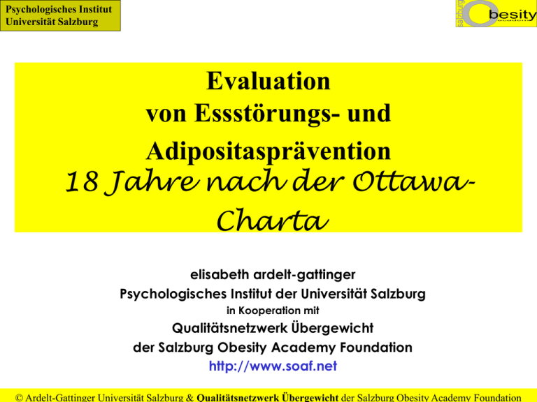 Psychologisches Institut Universität Salzburg Evaluation von Essstörungs- und Adipositasprävention 18 Jahre nach der OttawaCharta elisabeth ardelt-gattinger Psychologisches Institut der Universität Salzburg in Kooperation mit Qualitätsnetzwerk Übergewicht der Salzburg Obesity Academy Foundation http://www.soaf.net © Ardelt-Gattinger Universität Salzburg & Qualitätsnetzwerk Übergewicht der Salzburg Obesity Academy Foundation Psychologisches Institut Universität Salzburg Evaluation der Adipositas-und Essstörungs Prävention Bisherige Adipositas Prävention Bisherige Essstörungsprävention Folgerungen aus bisherigen Evaluationsergebnissen und dem Wissen über salutogene und pathogene Einflussfaktoren Was sollte evaluiert werden • 5 Disziplinen • Risken • Umwelt Methoden / Probleme © Ardelt-Gattinger Universität Salzburg & Qualitätsnetzwerk Übergewicht der Salzburg Obesity Academy Foundation Psychologisches Institut Universität Salzburg Präventionsprojekte (primäre) - hohe PR (Kosten???) Evaluiert??? •Ernährunsgerziehung in Kindergärten und Schulen - 150 Schulen •Aktion „5 am Tag für Kids“- Info& Besuch eines Supermarktes halbtägig •Jugendliche als „Ernährungserzieher“ - 450 Teams nur BRD •FIT KID - 80 Schulungen durch „Optimix“ für Erzieherinnen (Müller 2001) •Children‘s Health International Trial (CHILT) - vorw. Bewegung, 686 Kids, motorisch besser bedingt höhere Konzentration Evaluation: EK Ib - II •Kieler Adipositaspräventionsstudie (KOPS): © Ardelt-Gattinger Universität Salzburg & Qualitätsnetzwerk Übergewicht der Salzburg Obesity Academy Foundation Psychologisches Institut Universität Salzburg KOPS: „...die bisherigen Ergebnisse zeigen, dass Adipositasprävention sinnvoll und möglich ist...“ Veränderung schulische Intervention („primäre“), Elternabend (1), Ernährungsunterricht (8 Stunden), Fortbildung für Lehrer (1 Tag), Bewegte Pausen (6 Wo): Prä-Post Unterschiede 1 Jahr und 4 Jahre FU: • • Ernährungswissen …… der Oberschicht - Mädchen Änderungen am Fragebogen der Eltern (60% Antworter) bzgl. Spass an bewegten Pausen, geringerer TV-Konsum der Kids (40% von 60%!!!) bessere Konzentration (Mast et al 2000, Müller et al 2001, Mast et al 2003, Müller 2004) © Ardelt-Gattinger Universität Salzburg & Qualitätsnetzwerk Übergewicht der Salzburg Obesity Academy Foundation Psychologisches Institut Universität Salzburg Bisherige Präventionskampagnen Es gibt derzeit keine eindrucksvollen Gesundheitsförderungsprojekte im Bereich Adipositasprävention und Therapie (Zwiauer 2000, 2001) „...almost no research in this aerea...“ „...only few long term follow - up - data...“ „...non-understanding of obesity as a chronic,lifelong metabolic condition...“ (Müller et al 2001) © Ardelt-Gattinger Universität Salzburg & Qualitätsnetzwerk Übergewicht der Salzburg Obesity Academy Foundation Psychologisches Institut Universität Salzburg Präventionsprojekte - Evaluiert Langfristige Nachkontrollen fehlen! (Müller et al 2001) © Ardelt-Gattinger Universität Salzburg & Qualitätsnetzwerk Übergewicht der Salzburg Obesity Academy Foundation Psychologisches Institut Universität Salzburg Was evaluieren? Forderungen der DAG: Langfristige Änderungen > 48 Monate • • Senkung des BMI, Fettmasse etc. Verbesserung Risiko und Krankheiten • • • Verbesserung Gesundheitsverhalten Steigerung Lebensqualität Reduktion Arbeitsunfähigkeit ... (Schulprobleme?...) Ist das alles? © Ardelt-Gattinger Universität Salzburg & Qualitätsnetzwerk Übergewicht der Salzburg Obesity Academy Foundation Psychologisches Institut Universität Salzburg Mißerfolge und Risken aller bisherigen Kampagnen © Ardelt-Gattinger Universität Salzburg & Qualitätsnetzwerk Übergewicht der Salzburg Obesity Academy Foundation Psychologisches Institut Universität Salzburg Esstörungsprävention vorwiegend in Schulen u.ä. (vgl.u.a. Smolak 1998) Erste Generation Weitgehend edukativ: • Zunahme des Wissens und der Essstörungen (vgl.u.a Rathner 2002) bzw. der • vorklinischen Symptome (Bulik et al 2000) Zweite Generation Förderung der Salutogenen Faktoren mit unterschiedlichem Erfolg: (vgl.u.a:Rosenvinge1999) • Verbesserung des Essverhaltens (Baranowski & Heteherington 2001) • Verbesserung des Wissens und des weight related body esteem, • KEINE Änderung des EssVERHALTENS (DIETING, skipping meals...) (Steiner-Adair et al 2002, EK I-II!, Stewart et al 2001) Wenige akzeptable Evaluationen Gleiche Mängel wie bei Adipositasprävention © Ardelt-Gattinger Universität Salzburg & Qualitätsnetzwerk Übergewicht der Salzburg Obesity Academy Foundation Psychologisches Institut Universität Salzburg Risiko der Altersgruppe: Körperbilder von Jugendlichen zw. 9 und 18 Die Schönste im ganzen Land …ist die Dünnste - für alle Gewichtsstufen (Ardelt-Gattinger, Lechner & Ritter 2003) • Wunsch Fremdb. Schönste Hässlich Selbstb. Hocholdinger 2003) Negatives körperliches Selbstkonzept (Hocholdinger 2003) Adip ÜG Neg Körperbild sign.korr. mit Essstörungen (Cardill et al 1999) Adipositas: • KEIN durchgehend negatives Selbstkonzept, aber: Einschätzung der Attraktivität sowie athletischen Kompetenz negativ (Buchholz 1998, • NG 450 400 350 300 250 200 150 100 50 0 © Ardelt-Gattinger Universität Salzburg & Qualitätsnetzwerk Übergewicht der Salzburg Obesity Academy Foundation Psychologisches Institut Universität Salzburg Risiko: Die Angst der 9-18 Jährigen 120 80 INTERQ2 INTERQ2 70 100 morbid untergew 60 untergew ichtig 80 50 schlank 40 unteres Normalge 60 Normalgew icht 30 40 oberes Normalgew 20 10 0 gar nicht mäßig ein w enig ganz schw er schw er Angst vor Gewichtszunahme Percent Übergew icht 20 Adipositas 0 morbide Adip ja nein Gefühl zu dick zu sein © Ardelt-Gattinger Universität Salzburg & Qualitätsnetzwerk Übergewicht der Salzburg Obesity Academy Foundation Psychologisches Institut Universität Salzburg Risiko
