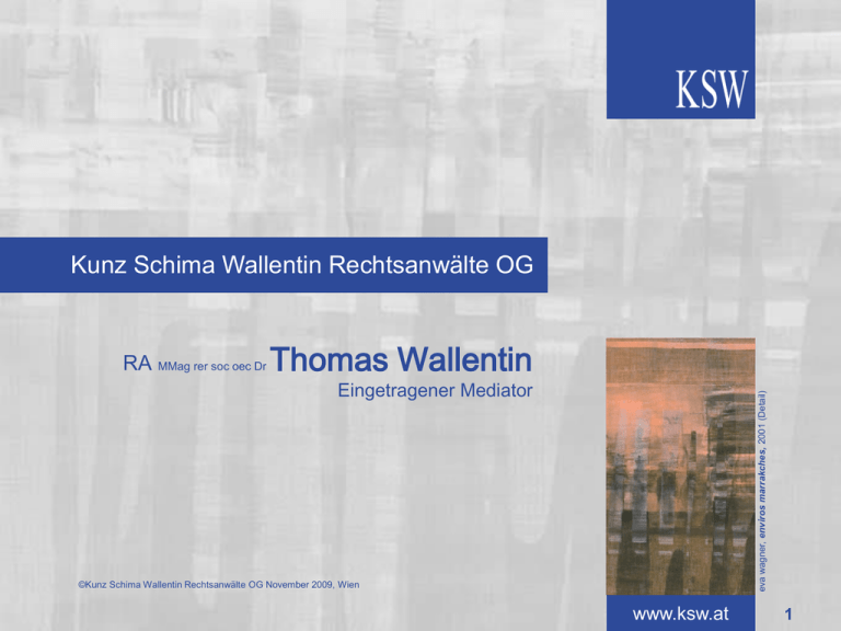 Kunz Schima Wallentin Rechtsanwälte OG RA MMag rer soc oec Dr Thomas Wallentin eva wagner, enviros marrakches, 2001 (Detail) Eingetragener Mediator ©Kunz Schima Wallentin Rechtsanwälte OG November 2009, Wien www.ksw.at 1 Film- und Musikproduktion auf glattem Eis Die Pflicht – Verwertungsgesellschaften Die Kür – Persönlichkeitsrechte Vortrag vom 26. November 2009 Eine Veranstaltung der Wirtschaftskammer Wien ©Kunz Schima Wallentin Rechtsanwälte OG November 2009, Wien www.ksw.at 2 I. Die Pflicht / Glatteis – Urheberrechte und Verwertungsgesellschaften II. Die Kür / Glatteis – Persönlichkeitsrechte in Film und Fernsehen III. Sicheres Terrain ? – Freie Werknutzungen ©Kunz Schima Wallentin Rechtsanwälte OG November 2009, Wien www.ksw.at 3 I. Verwertungsgesellschaften in Österreich ©Kunz Schima Wallentin Rechtsanwälte OG November 2009, Wien www.ksw.at 4 Verwertungsgesellschaften Allgemeines • Um ein Werk auch wirtschaftlich nutzen zu können, sichert das Urheberrecht den Berechtigten ausschließliche Nutzungsrechte und Vergütungsansprüche. • Verwertungsgesellschaften (VG) erfüllen vor allem die Aufgabe der Wahrnehmung von Rechten und Ansprüchen, die wegen der Vielzahl der Verwertenden, aber auch Nutzer, einzeln nicht wirksam geltend gemacht werden können (daher „kollektive Rechtewahrnehmung“). ©Kunz Schima Wallentin Rechtsanwälte OG November 2009, Wien www.ksw.at 5 Verwertungsgesellschaften • Verwerten nicht selbst • Erteilen den "eigentlichen“ Verwertenden Veranstaltern, Hörfunk- und Fernsehsendern, CD- und Videoproduzenten, Gastwirtschaften uvm • Lizenzen zur Nutzung einer Vielzahl von urheberrechtlich geschützten Werken / Leistungen ©Kunz Schima Wallentin Rechtsanwälte OG November 2009, Wien www.ksw.at 6 Verwertungsgesellschaften • Steigende Bedeutung und Fortentwicklung des Urheberrechts • seit den 1980er Jahren massive Ausweitung • pauschale Vergütungen (ua) Leerkassettenvergütung Integrales Kabelfernsehen Bibliothekstantieme Reprografievergütung Schulgebrauch künftig: für internetbezogene Nutzungen: „flat rate“ ? ©Kunz Schima Wallentin Rechtsanwälte OG November 2009, Wien www.ksw.at 7 Exkurs European Digital Agenda - Kommissarin Vivane Reading • Einheitliches Online-Recht für alle 27 Mitgliedstaaten • Einräumung eines einzigen Online-Verwertungsrechts in einem Mitgliedstaat für alle anderen • (auch) “Online-Erschöpfungsgrundsatz?” ©Kunz Schima Wallentin Rechtsanwälte OG November 2009, Wien www.ksw.at 8 Exkurs European Digital Agenda - Kommissarin Vivane Reading • Anderer Ansatz: Konsolidieren des Online-Rechts als eine Werknutzungsart • Weiterführung der Harmonisierung des europäischen Urheberrechts ©Kunz Schima Wallentin Rechtsanwälte OG November 2009, Wien www.ksw.at 9 Exkurs Creative Content in a European Digital Single Market • Audio-Medien • Vereinheitlichung von Digitalisierung und OnlineZurverfügungstellung • Traditionelle Struktur der kollektiven Rechtewahrnehmung durch dzt 152 VG soll vereinfacht werden ©Kunz Schima Wallentin Rechtsanwälte OG November 2009, Wien www.ksw.at 10 Exkurs Creative Content in a European Digital Single Market • Audiovisuelle Medien • Regelungen für Video-on-Demand • Berücksichtigung der Besonderheiten der (nationalen) Filmindustrie Keine Finanzierung von Filmen durch Online-Plattformen Lokale Filmförderung Beschränkungen für vertragliche und gesetzliche „Release Windows“ ©Kunz Schima Wallentin Rechtsanwälte OG November 2009, Wien www.ksw.at 11 Verwertungsgesellschaften • Treuhändige Wahrnehmung von Ausschließungsrechten Recht des öffentlichen Vortrags (Vorführung, Aufführung) Senderecht Kabelweitersenderecht Recht der Vervielfältigung und Verbreitung (auf Ton- und Bildträgern) • Geltendmachung von Ansprüchen für die Bezugsberechtigten aus gesetzlichen Lizenzen. ©Kunz Schima Wallentin Rechtsanwälte OG November 2009, Wien www.ksw.at 12 Verwertungsgesellschaften • Inkassogesellschaften für • Bereiche urheberrechtlicher Regelungen mit Entgeltansprüchen, in denen die Verwendung eines Werks nicht mehr im Einzelverkehr eines Urhebers mit einem Nutzer eines Werks überprüft und in jedem einzelnen Verwendungsfall abgerechnet werden kann. Leerkassettenvergütung für private Überspielungen von Ton- und Bildtonträgern Schulbuchtantieme für Abdrucke in Schul- und Lehrbüchern, Bibliothekstantieme für Entlehnungen in öffentlichen Büchereien und Bibliotheken Reprografievergütung für Vervielfältigungen zum eigenen bzw. privaten Gebrauch mittels reprografischer oder ähnlicher Verfahren. ©Kunz Schima Wallentin Rechtsanwälte OG November 2009, Wien www.ksw.at 13 Verwertungsgesellschaften • Einnahmen aus den Vergütungsansprüchen zum Teil sozialen und kulturellen Zwecken gewidmet zum Teil individuell an die Rechteinhaber ausgeschüttet. • Von den Einnahmen aus der Leerkassettenvergütung werden 50% den sozialen und kulturellen Zwecken dienenden Einrichtungen der Verwertungsgesellschaften zugeführt (§ 13 Abs 2 VerwGesG). ©Kunz Schima Wallentin Rechtsanwälte OG November 2009, Wien www.ksw.at 14 Verwertungsgesellschaften Bezugsberechtigte • Mitglied (≠ Bezugsberechtigte) • Wahrnehmungsvertrag • Meldeformulare • Verrechnung von Entgelten, die Verwertungsgesellschafte aus der Wahrnehmung der Rechte ihrer Mitglieder erzielen, erfolgt mit detaillierter Abrechnung ©Kunz Schima Wallentin Rechtsanwälte OG November 2009, Wien www.ksw.at 15 Verwertungsgesellschaften Überblick • die Staatlich genehmigte Gesellschaft der Autoren, Komponisten und Musikverleger (AKM) • die Literar-Mechana GmbH (LiMe) • die Austro-Mechana GmbH (AuMe) • die Verwertungsgesellschaft bildender Künstler GmbH (VBK) • die LSG – Wahrnehmung von Leistungsschutzrechten GmbH (LSG) • die Verwertungsgesellschaft Rundfunk GmbH (VGR) • die Verwertungsgesellschaft für audiovisuelle Medien GmbH (VAM) • die VDFS – Verwertungsgesell