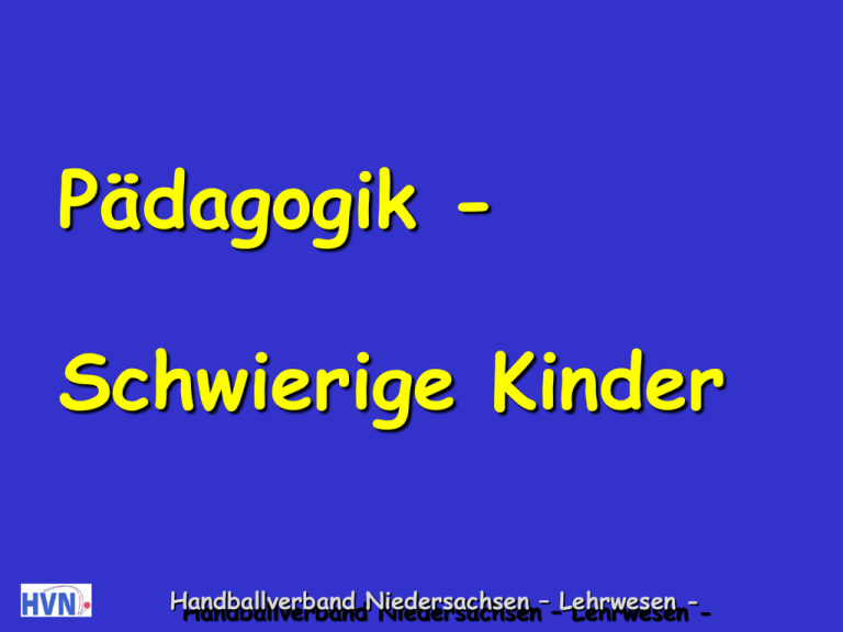 Pädagogik Schwierige Kinder Handballverband Niedersachsen – Lehrwesen - Prüfen Sie mal selbst, ob Sie die folgenden Ansprüche von Kindern an einen "guten" Übungsleiter" erfüllen! Handballverband Niedersachsen – Lehrwesen - Als Übungsleiter kann ich Kinder in ihrer spielerischen Entwicklung gezielt fördern! Mir ist jedes Kind gleich wichtig. Alle Kinder erhalten von mir in Training und Spiel die gleiche Aufmerksamkeit und Förderung. Handballverband Niedersachsen – Lehrwesen - Ich bin mir meiner fachlichen Verantwortung für eine gute sportliche Grundausbildung der mir anvertrauten Kinder jederzeit bewusst. Ich bin daher "up to date" in der Sportart, ich bilde mich ständig weiter und hole Rat bei Trainerkollegen. Handballverband Niedersachsen – Lehrwesen - Als Übungsleiter verfolge ich sportliche Zielsetzungen. Aber dahinter muss nicht alles zurückstehen. Sport ist für mich wichtig. Ich möchte Kindern eine gesunde Einstellung m sportlicher Leistung vermitteln. Trotzdem: Sport ist nicht alles. Gute menschliche Beziehungen sind wichtiger. Handballverband Niedersachsen – Lehrwesen - Als Übungsleiter bin ich auch Freund und Helfer der Kinder in allen Lebenslagen. Ich bringe Geduld und Verständnis auch für außersportliche Probleme der Kinder auf. Sie suchen bei mir Rat, sie können mir ihre Probleme anvertrauen, ich höre ihnen zu und helfe ihnen. Handballverband Niedersachsen – Lehrwesen - Als verantwortlicher Übungsleiter von Kindergruppen lebe ich sportliche wie soziale Werte vor. Ich lege Wert auf meinen Körper, ich ver- suche, fit zu bleiben. Ich halte mich bei Genussmitteln zurück. Ich akzeptiere Niederlagen und trete in allen Belangen für sportliche Fairness ein. Ich bin mir meiner Vorbildfunktion bewusst. Handballverband Niedersachsen – Lehrwesen - Als Übungsleiter kann ich Spaß und Freude glaubhaft vermitteln. Bei aller Gewissenhaftigkeit in der Vorbereitung und Durchführung von Spielen und Trainingsstunden prüfe ich meine Inhalte und mein Verhalten immer daraufhin, dass Kinder auch Anlass zu Spaß und Freude haben. Ich kann glaubhaft lachen, auch in „Stresssituationen“. Handballverband Niedersachsen – Lehrwesen - Ich stehe für mein sportliches und außersportliches Konzept ein und vertrete es konstruktiv und glaubhaft nach außen! Sportliche und außersportliche Betreuung kann ich begründen und auch gegen Kritik aus dem Umfeld (Vereinsfunktionäre, Eltern etc.) verteidigen. Ich nehme Rat und Hilfen gerne an, verwahre mich aber gegen Bevormundung und kurzsichtige, ausschließlich auf sportliche Ziele hin orientierte Jugend-Vereinsarbeit. Handballverband Niedersachsen – Lehrwesen - Handballverband Niedersachsen – Lehrwesen - Mit abwechslungsreichen Spiel- und Übungsformen Monotonie, Unterforderung und Konzentrations- probleme vermeiden! "Alte" Inhalte immer wieder "neu" verpacken: Kinder lieben immer wieder neue Herausforderungen! Der Neuigkeitswert von Spielen oder Geräten hat für Kinder einen hohen Aufforderungscharakter! Handballverband Niedersachsen – Lehrwesen - Die Kinder sollten genau wissen, was der Trainer sich für die jeweilige Spielstunde ausgedacht hat. Ziele und Ablauf vor Beginn erläutern einzelne Stundenabschnitte erklären Handballverband Niedersachsen – Lehrwesen - Immer positiv erklären oder korrigieren, auch wenn etwas falsch lief! Loben heißt: Den Lernzuwachs verstärken! Handballverband Niedersachsen – Lehrwesen - Kindern im Training Verantwortung übertragen! Prinzip: Alle Kinder helfen sich gegenseitig! Die Kinder sind mitverantwortlich für den Geräteauf- und -abbau. Die Kinder achten auf herumliegende Bälle! Handballverband Niedersachsen – Lehrwesen - Wünsche der Kinder in die Gestaltung von Spiel- und Übungsstunden mit einbeziehen Trainergespräch vor Beginn der Spielstunde, während der Trinkpause und am Ende der Spielstunde Handballverband Niedersachsen – Lehrwesen - Kindern im Training helfen – statt sie bloßzustellen! Gruppen nach Könnensstand einteilen! Aufgabenstellung differenzieren: für Ungeübte und Fortgeschrittene Prinzip: fortgeschrittene Kinder als "Co-Trainer" für Spielanfänger! Handballverband Niedersachsen – Lehrwesen - Handballverband Niedersachsen – Lehrwesen - Vor dem Spiel Handballverband Niedersachsen – Lehrwesen - Fahrt zum Spielort gut vorbereiten "Fahrplan" mit Eltern (Wer fährt wann?) über eine längere Zeit im Voraus erstellen, damit Familien sich abwechseln können. Eine Seniorenmannschaft ihres Vereins übernimmt die "Patenschaft" für die Minis. Handballverband Niedersachsen – Lehrwesen - Eltern informieren keine übertriebenen Ansprüche an die Kinder stellen keine Kritik während des Spiels Handballverband Niedersachsen – Lehrwesen - "Besprechung" vor dem Spiel zeitlich kurz halten (natürlicher Bewegungsdrang) pädagogisch, nicht taktisch ausrichten Der Ausgang des Spiels steht nicht im Vordergrund. Zuversicht und Freude ausstrahlen Ziel: Was im Training geübt wurde, im Spiel anwenden. Handballverband Niedersachsen – Lehrwesen - Kein systematisches Aufwärmen Die Kinder "beschäftigen" sich mit dem Ball (Prellen, Zuspielen, Werfen). Handballverband Niedersachsen – Lehrwesen - Während des Spiels Handballverband Niedersachsen – Lehrwesen - Beim Auswechseln das Rotationsprinzip bevorzugen! nicht nach Spielstand/Taktik auswechseln Alle Spieler sollten möglichst gleiche Spielanteile haben. Handballverband Niedersachsen – Lehrwesen - Betreuung von der Bank Vorbild bewusst sein! Anfeuern, ermutigen, loben und helfen Nicht kritisieren, sondern genau erklären, wie Kinder etwas besser machen können. Keine Kritik gegen den Spielleiter! Ehrliche Freude zeigen, sich mit den Kindern freuen! Handballverband Niedersachsen – Lehrwesen - Pädagogisch pfeifen! je nach Leistungsstand mehr oder weniger großzügige Regelauslegung bei Fehlern immer erläutern, wie die Kinder etwas besser machen können. Handballverband Niedersachsen – Lehrwesen 