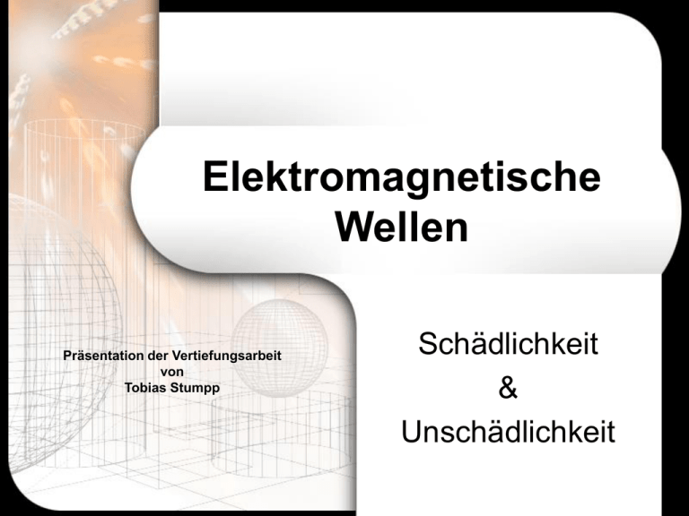 Elektromagnetische Wellen Präsentation der Vertiefungsarbeit von Tobias Stumpp Schädlichkeit & Unschädlichkeit Abgrenzung • Elektromagnetische Wellen bzw. Felder umgeben uns jeden Tag und überall: – – – – Radiowellen Stromleitungen Licht Röntgenstrahlung Abgrenzung • Mobilfunksystem – – Im Gigahertz-Bereich (1-2 GHz) Hochfrequente Felder Wellenlängen von einigen Zentimetern Kategorie der Mikrowellen Agenda 1. Geschichte 2. Wie funktioniert Mobilfunk? 3. Die „Strahlung“ 4. Biologische Wirkung 5. Grenzwerte 6. Fazit 1. Geschichte Geschichte Wie funktioniert Mobilfunk? Die „Strahlung“ Biologische Wirkung Grenzwerte • 1918 erste Tests der deutschen Reichsbahn 1926 erster Bahnreisender (1. Klasse) konnte mobil telefonieren 1958 A-Netz • • – – Fazit • 1968 Flächenabdeckung bei 80% 10.500 Teilnehmer 1972 B-Netz – – – 1977 Zurückgreifen auf Frequenzen des A-Netzes 1986 max. Teilnehmerzahl von 270.000 erreicht 1994 wurde der Betrieb eingestellt 1. Geschichte Geschichte Wie funktioniert Mobilfunk? • – – – – – Die „Strahlung“ Biologische Wirkung Grenzwerte Fazit 1986 C-Netz • Frequenzen bei 450 MHz teilweise digital Mobilfunknetz der „ersten Generation“ Max. Teilnehmerzahl: 800.000 Typische Netzstruktur Funkzellen 2000 wurde der Betrieb eingestellt 1992 D-Netze (D1 und D2) – – – – Deutsche Post und Mannesmann Digitale GSM-Mobilfunknetze Mobilfunknetze der „zweiten Generation“ Nahezu vollständige Netzabdeckung 1. Geschichte Geschichte Wie funktioniert Mobilfunk? Die „Strahlung“ Biologische Wirkung Grenzwerte • • • • 1994 E-Netz (E-plus) 1995 SMS-Versand möglich 1998 E-Netz (Viag Interkom heute O2) Ab 2002 Aufbau der UMTS-Netze – Mobilfunknetz der „dritten Generation“ Fazit In den letzten Jahren enormer Zuwachs Über 60 Millionen Handybesitzer in Deutschland Auch Zellenstruktur hat sich gewandelt 2. Wie funktioniert Mobilfunk? Geschichte Wie funktioniert Mobilfunk? Was sind elektromagnetische Wellen Das Netz Die Mobilfunkantenne Die Basisstation Die „Strahlung“ Biologische Wirkung Grenzwerte Fazit Was sind elektromagnetische Wellen? • • Elektrische + magnetische Felder Durchqueren den Raum (auch den luftleeren) wie Wasserwellen einen See Mit Lichtgeschwindigkeit Entsehen beim Beschleunigen elektrischer Ladung Elektronen durch Draht (Antenne) Brauchen keinen Träger: • • – – – Schall = Luft Wasserwellen = Wasser Elektromagnetische Wellen = Vakuum 2. Wie funktioniert Mobilfunk? Geschichte Wie funktioniert Mobilfunk? Was sind elektromagnetische Wellen Das Netz Die Mobilfunkantenne Die Basisstation Die „Strahlung“ Biologische Wirkung Das Netz • Die Idee: – – – Störungsfrei / abhörsicher Für viele Nutzer Wenig Strom verbrauchende Geräte mit geringer Sendeleistung Grenzwerte Fazit Digitale Funksignale auf hohen Frequenzen Bereich um 1 GHz (D-Netz) & 2 GHz (E-Netz) 2. Wie funktioniert Mobilfunk? Geschichte Wie funktioniert Mobilfunk? Was sind elektromagnetische Wellen Das Netz Die Mobilfunkantenne Die Basisstation Die „Strahlung“ Biologische Wirkung Grenzwerte Fazit Das Netz D-Netze • GSM 900 • 890 MHz – 960 MHz (Senden & Empfangen) • Wellenlänge ca. 30 cm E-Netze • GSM 1800 • 1717 MHz – 1880 MHz (Senden & Empfangen) • Wellenlänge ca. 15 cm 2. Wie funktioniert Mobilfunk? Geschichte Wie funktioniert Mobilfunk? Was sind elektromagnetische Wellen Das Netz Die Mobilfunkantenne Die Basisstation Die „Strahlung“ Biologische Wirkung Das Netz • Sehr geringe Wellenlänge bei Mobilfunk – • Kann nur eine „kleine“ (mehrere km) Fläche abdecken Mittelwellensender bei 1 MHz = 300m-Wellen – Kann über eine sehr weite Strecke senden Grenzwerte Fazit Flächendeckendes „Netz“ über das Land Maschen des Netzes = Funkzellen Jede Funkzelle hat eine Basisstation bzw. Antenne 2. Wie funktioniert Mobilfunk? Geschichte Wie funktioniert Mobilfunk? Was sind elektromagnetische Wellen Das Netz Die Mobilfunkantenne Die Basisstation Das Netz • Größe der Funkzelle abhängig von: – – Topographie Anzahl der Teilnehmer dieser Zelle Die „Strahlung“ Biologische Wirkung Grenzwerte • Früher mehrere große Zellen (10km Radius) – • Heute viele kleine Zellen (2km Radius) – Fazit Höhere Leistung der BTS nötig (30 – 50W) Leistung geringer (4 – 10W) Je kleiner Zelle, desto geringer die Leistung, die dort benötigt wird Strahlenbelastung auch geringer 2. Wie funktioniert Mobilfunk? Geschichte Wie funktioniert Mobilfunk? Was sind elektromagnetische Wellen Das Netz Die Mobilfunkantenne Die Basisstation Die „Strahlung“ Biologische Wirkung Grenzwerte Fazit Das Netz GSM-Netze zur Zeit: • D1, D2, E-Plus und O2 • Über 52.000 Basisstation mit rund 164.000 Antennen UMTS zukünftig: • Mehr Netze • Noch engere Zellenstruktur Mehr Basisstationen Noch einmal genau so viele neue BTS wie bereits vorhanden 2. Wie funktioniert Mobilfunk? Geschichte Wie funktioniert Mobilfunk? Was sind elektromagnetische Wellen Das Netz Die Mobilfunkantenne Die Basisstation Die „Strahlung“ Biologische Wirkung Grenzwerte Fazit Die Mobilfunkantenne • Verschiedene Antennentypen Verschieden große Zellen (z.B. Mikro-, Picozelle) • Stationär • Oft versteckt = „getarnt“ • Senden ständig BCCH Kanal = „Pilotton“ 2. Wie funktioniert Mobilfunk? Geschichte Wie funktioniert Mobilfunk? Was sind elektromagnetische Wellen Das Netz Die Mobilfunkantenne Die Basisstation Die „Strahlung“ Biologische Wirkung Grenzwerte Fazit Die Mobilfunkantenne Rundstrahler • Zentral gelegen • Strahlt rundum gleichmäßig • Zelle: wabenförmig • Größere Fläche mit mehr Leistung als Sektorantenne 2. Wie funktioniert Mobilfunk? Geschichte Wie funktioniert Mobilfunk? Was sind elektromagnetische Wellen Das Netz Die Mobilfunkantenne Die Basisstation Die „Strahlung“ Biologische Wirkung Grenzwerte Fazit Die Mobilfunkantenne Sektorantenne • Zelle: „kleeblattförmig“ 