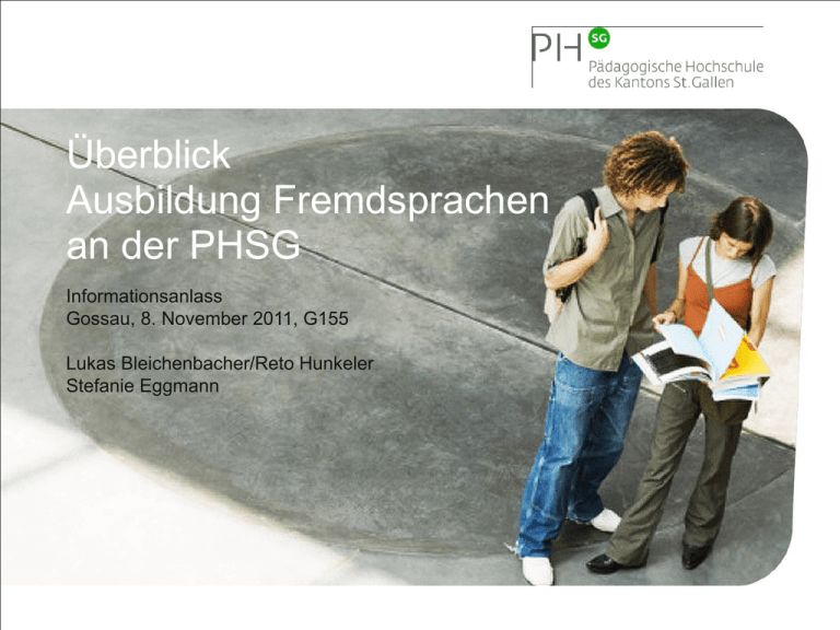 Überblick Ausbildung Fremdsprachen an der PHSG Informationsanlass Gossau, 8. November 2011, G155 Lukas Bleichenbacher/Reto Hunkeler Stefanie Eggmann 1 Pädagogische Hochschule des Kantons St.Gallen Inhalt www.optimisme.ch 2 Pädagogische Hochschule des Kantons St.Gallen Fächerwahlen Jahrgang 2011-2016 Gesamtzahl Studierende in den Fremdsprachen Englisch: 64 Französisch: 39 Latein: 3 Rätoromanisch: 0 Italienisch: 3 Fz (phil. I: 26 x Hauptfach / 8 x 5. Fach) = 34 En (phil. I: 48 x Hauptfach / 5 x 5. Fach) = 53 Fz (phil. II: 4 x Hauptfach / 1 x 5. Fach) = 5 En (phil. II: 8 x Hauptfach / 3 x 5. Fach) = 11 En-Fz-Studierende im Hauptfach: 12 3 Pädagogische Hochschule des Kantons St.Gallen Hinweise zu Fächerwahlen bzw. -kombinationen Studierende phil. I: Deutsch + eine Fremdsprache (Französisch / Englisch / Italienisch) + Geschichte & Geographie Deutsch + zwei Fremdsprachen, aber ohne Geschichte & Geographie Studierende phil. II: können eine Fremdsprache wählen (Französisch / Englisch). Alle Fremdsprachen sind auch als 5. Fach wählbar; Lateinisch und Rätoromanisch sind ausschliesslich als 5. Fach wählbar (siehe später). Als sprachdidaktischer Sicht ist die Kombination von zwei Fremdsprachen speziell interessant. Die Wahl von Französisch kann mittel- bis längerfristig Ihr Profil positiv verstärken (stabile Nachfrage, kleineres Angebot als von EnglischabsolventInnen). 4 Pädagogische Hochschule des Kantons St.Gallen Wahl eines 5. Fachs • 5. Fach bedeutet: Man absolviert die Module der ersten 4 Semester zusammen mit den HauptfachStudierenden • Nach dem 5. Semester kann man auf Antrag weitere Module besuchen, sofern dies mit dem Stundenplan vereinbar ist • Die nicht besuchten Module, sowie insbesondere die Schlussprüfungen (Masterprüfungen) und die Praktika können erst nach Abschluss des regulären Studiums in den anderen Fächern nachgeholt werden. • Für Rätoromanisch, Latein (und Religion) erhält man nach dem Studium im 5. Fach 10 ECTS sowie ein Lehrdiplom. 5 Pädagogische Hochschule des Kantons St.Gallen Italienisch Bachelor-Master Studiengang Sek I Italienisch Das Fach Italienisch eignet sich insbesondere für Studierende, die sich in einer weiteren Sprache Grundkenntnisse für den Schulunterricht erwerben möchten. (Italienisch wird als Freifach in fast allen Sekundarschulen angeboten; leider gibt es nicht immer eine Lehrperson, die über die nötige Ausbildung verfügt). Das Ziel ist es, wesentliche pädagogische Kenntnisse und Fähigkeiten, die einen modernen Unterricht der italienischen Sprache ermöglichen, zu vermitteln. Das Fach Italienisch steht jedoch allen interessierten Studierenden offen, die über gute Sprachkompetenzen in Italienisch verfügen. In der Erweiterung Italienisch ergänzen die Studierenden ihre Sprachkompetenzen weiter und erhalten wichtige Einblicke in die Kultur, Literatur, Geschichte und Aktualität Italiens. 6 Pädagogische Hochschule des Kantons St.Gallen 7 Pädagogische Hochschule des Kantons St.Gallen • PHSG bietet Italienisch, wie Englisch oder Französisch als reguläres Fach an (30 ECTS) • PHSG bietet Lateinisch und Rätoromanisch als fünftes Fach mit kantonaler Lehrbefähigung an ( min. 10 ECTS) 8 Pädagogische Hochschule des Kantons St.Gallen Moduls Modul scientific e curricular Credits Module 3 Fachwissenschaft und curriculares Wissen Enma da bloc 1.5 Blockwoche Didactica da rumantsch 1.5 Fachdidaktik Didactica integrada 2.5 Bereichsdidaktik Pratica (8 lecziuns) 1.5 Praxis Examens 1.5 Prüfungen 9 Pädagogische Hochschule des Kantons St.Gallen Kleine Gruppen/ Gruppas da lavur pitgnas Individuelle Betreuung/ Assistenza individuala Flexible Organisation/ Organisaziun felxibla Praxisorientiert/ Orienta vers la pratica 10 Pädagogische Hochschule des Kantons St.Gallen Prof. Dr. Rico Cathomas Dozent für Mehrsprachigkeitsdidaktik, Allgemeine Didaktik und Didaktik des Rätoromanischen Forschungsinstitut Fachdidaktik Sprachen Pädagogische Hochschule Sankt Gallen (www.phsg.ch) Notkerstrasse 27/Büro 401 CH-9000 Sankt Gallen Tel: Mail: 11 0041 (0)71 243 94 41 [email protected] Pädagogische Hochschule des Kantons St.Gallen 12 Pädagogische Hochschule des Kantons St.Gallen Ausbildungsverlauf an der PHSG am Beispiel Französisch Semester Modulreihe Fachwissenschaft Modulreihe Curriculares Wissen 1 HP1S Compétences langagières I (1/1) 2 HP2S P1 Cultures et sociétés francophones I (1h/2ECTS) Cultures et sociétés francophones II (2/1) Compétences langagières II (1/1) 3 SprA P2 Le cinéma français (2) 3/5/7s Simulation globale (2) Actualité culturelle francophone (2) 4/6s Vertiefungsmodul Linguistik I (2) Fachdidaktik (2) Cours intensif I (2) 3/5/7s Vertiefungsmodul kulturelle Bildung I (3) Fachdidaktik (1) Cours intensif II (2) 4/6/8s (FAP) 6 Modulreihe Blockwochen, Freifächer Bereichsdidaktik Fremdsprachen (2) 4 5 Modulreihe Fachdidaktik 7 Vertiefungsmodul kulturelle Bildung II (2) 8 Vertiefungsmodul Linguistik II (2) Bereichsdidaktik Fremdsprachen (1) 9 P3 13 Pädagogische Hochschule des Kantons St.Gallen Ausbildungsverlauf an der PHSG am Beispiel Französisch 14 Pädagogische Hochschule des Kantons St.Gallen Modulbeschreibungen 15 Pädagogische Hochschule des Kantons St.Gallen Grundstudium 1 bis 4s Module • Cultures et sociétés francophones I und II (1,5L/1-4s; 6 ECTS) • Compétences langagières I und II (1L/1-4s; 4 ECTS) • selbstgeleitetes Modul (2L/3s; 1,5 ECTS) • Bereichsdidaktik Fremdsprachen (2L/4s; 2,5 ECTS) Fokus auf berufsspezifische sprachliche Handlungskompetenz • Vokabular • Grammatik • Grundkenntnisse der Phonetik 16 Pädagogische Hochschule des Kantons St.Gallen Hauptstudium 5 bis 9s Module • Vertiefungsmodule Linguistik I und II (je 2L/5s und 8s; 4 ECTS) • Vertiefungsmodule Kulturelle Bildung (2,5L/6s und 7s; 4 ECTS) • • Bereichsdidaktik Fremdsprachen (1,5L/4s und 8s; 2,5 ECTS) Fachdidaktik Französisch (1,5L/5s und 6s; 3 ECTS) • diverse Freifach- und Projektwochenangebote Fokus 