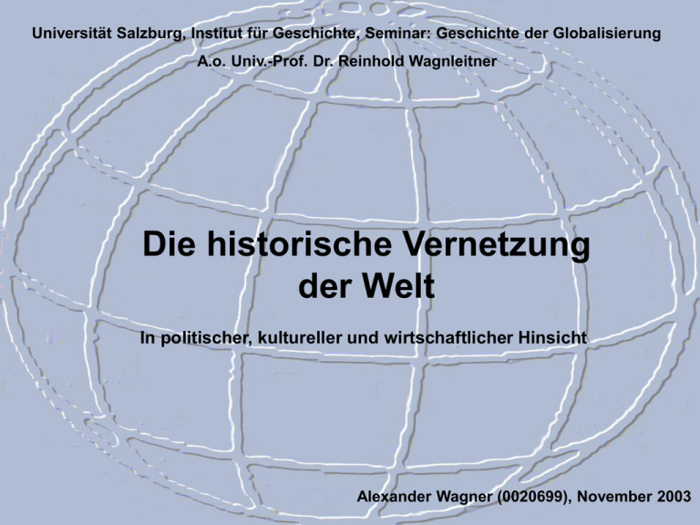 Universität Salzburg, Institut für Geschichte, Seminar: Geschichte der Globalisierung A.o. Univ.-Prof. Dr. Reinhold Wagnleitner Die historische Vernetzung der Welt In politischer, kultureller und wirtschaftlicher Hinsicht Alexander Wagner (0020699), November 2003 Die historische Vernetzung der Welt Die politische Vernetzung der Welt Die kulturelle Vernetzung der Welt Die wirtschaftliche Vernetzung der Welt Die militärische Vernetzung der Welt oder ‚der Globus als Spielball der Großma(ä)cht(e)‘ Die politische Vernetzung der Welt Unter dem Punkt ‚Die politische Vernetzung der Welt‘ möchte ich vor allem die Entdeckung der Welt, die geographischen Veränderungen und ihre Auswirkungen auf Politik und Gesellschaft darstellen. Startjahr ist für ist für mich das Jahr 1492, da in diesem Jahr die zwei Kontinente der beiden Amerikas mit der bisher ‚bekannten‘ Welt verbunden und in weiterer Folge vernetzt wurden. Weiters versuche ich, die Umstände der Entdeckungen, die Vorraussetzungen und Möglichkeiten sowie die weiteren Entwicklungen aufzuzeigen. Die politische Vernetzung der Welt Fernreisen während des Mongolischen Reiches Quelle: Bentley J., Ziegler H.; Tradition & Encounters, A global perspective on the past; Boston 2000; S. 504 TEXT Die politische Vernetzung der Welt Die Welt im Jahr 1492 Quelle: Haywood John; Völker Staaten und Kulturen; Ein universalhistorischer Weltatlas; Oxford 1997; S. 3.04 TEXT Die politische Vernetzung der Welt TEXT Quelle: Bentley J., Ziegler H.; Tradition & Encounters, A global perspective on the past; Boston 2000; S. 522 Europäische und chinesische Entdeckungsexpeditionen Quelle: Bentley J., Ziegler H.; Tradition & Encounters, A global perspective on the past; Boston 2000; S. 543 Die politische Vernetzung der Welt Winde in den großen Ozeanen Quelle: Bentley J., Ziegler H.; Tradition & Encounters, A global perspective on the past; Boston 2000; S. 540 TEXT Die politische Vernetzung der Welt Europäische Expeditionen in den Pazifik Quelle: Bentley J., Ziegler H.; Tradition & Encounters, A global perspective on the past; Boston 2000; S. 546 TEXT Die politische Vernetzung der Welt Die Welt ohne Längengrade Quelle: www.libs.uga.edu/darchive/hargrett/maps/neworld.html TEXT Die politische Vernetzung der Welt Die Welt mit Längengraden TEXT Quelle: www.libs.uga.edu/darchive/hargrett/maps/neworld.html Die politische Vernetzung der Welt Die Welt und Welthandel 1492-1783 Quelle: Haywood John; Völker Staaten und Kulturen; Ein universalhistorischer Weltatlas; Oxford 1997; S. 4.05 TEXT Die politische Vernetzung der Welt Die Welt im Jahr 1783 Quelle: Haywood John; Völker Staaten und Kulturen; Ein universalhistorischer Weltatlas; Oxford 1997; S. 3.06 TEXT Die politische Vernetzung der Welt Handelsposten und Handelswege Quelle: Bentley J., Ziegler H.; Tradition & Encounters, A global perspective on the past; Boston 2000; S. 550 TEXT Quelle: Bentley J., Ziegler H.; Tradition & Encounters, A global perspective on the past; Boston 2000; S. 614 Die politische Vernetzung der Welt TEXT Quelle: Conniff M., Davis T.; Africans in the Americas; A history of the Black Diaspora; New York 1994; S. 47 Sklavenhandel – das ‚Goldene‘ Dreieck Quelle: http://innercity.org/holt/slavechron.html Die politische Vernetzung der Welt Weltbevölkerung und Wanderungsbewegungen 1830-1914 Quelle: Haywood John; Völker Staaten und Kulturen; Ein universalhistorischer Weltatlas; Oxford 1997; S. 5.05 TEXT Die politische Vernetzung der Welt Internationale Wanderungsbewegungen 1820-1910 Quelle: Hobsbawn Eric; Das imperiale Zeitalter 1875-1914; Frankfurt 1995; S. 436 TEXT Die kulturelle Vernetzung der Welt Unter dem Punkt ‚Die kulturelle Vernetzung der Welt‘ verstehe ich nicht nur Bräuche und Sitten, sondern auch die Verbreitung von Kulturpflanzen, Tieren, Krankheiten, Sprachen aber auch die Verbreitung von technischen Neuerungen, die die Welt langfristig veränderten. Mit der Entdeckung der beiden Amerikas breiteten sich unter der indigenen Bevölkerung schnell Krankheiten aus, die deren Zahl stark dezimierte. Gleichzeitig kamen die Europäer in den Besitz neuartiger Kulturpflanzen, die wiederum in Europa zu einem rasanten Bevölkerungswachstum führten. Die kulturelle Vernetzung der Welt Weltweite Maisproduktion und Maisproduktion der EU Quelle: http://wendung/pflanzen/Mais/weltgetreide.hmtl TEXT Die kulturelle Vernetzung der Welt Weltweite Verbreitung von AIDS Quelle: Le Monde diplomatique; Atlas der Globalisierung; Paris 2003; S. 185 TEXT Die kulturelle Vernetzung der Welt Übernationale Sprachen und meistverbreitete Muttersprachen TEXT Quelle: Le Monde diplomatique; Atlas der Globalisierung; Paris 2003; S. 15 Die kulturelle Vernetzung der Welt Weltweite Verbreitung von Zeitungen und Telefonanschlüssen Quelle: Kidron M., Segal R.; Hunger und Waffen; Ein politischer Weltatlas zu den Krisen der 80er Jahre; Hamburg 1981 TEXT Quelle: Hobsbawn Eric; Das imperiale Zeitalter 1875-1914; Frankfurt 1995; S. 430 Die kulturelle Vernetzung der Welt Quelle: Le Monde diplomatique; Atlas der Globalisierung; Paris 2003; S. 49 TEXT Die kulturelle Vernetzung der Welt Quelle: Le Monde diplomatique; Atlas der Globalisierung; Paris 2003; S. 16 TEXT Die kulturelle Vernetzung der Welt Online im September 2002 Welt gesamt Afrika 605,6 Millionen 6,31 Millionen Asien/ Pazifik 187,24 Millionen Europa 190,91 Millionen Mittlerer Osten 5,12 Millionen Kanada & USA 182,67 Millionen Lateinamerika 33,35 Millionen Quelle: www.nua.ie/surveys/how_many_online/index.html Quelle: Le Monde diplomatique; Atlas der Globalisierung; Paris 2003; S. 11 TEXT Die kulturelle Vernetzung der Welt Quelle: Le Monde diplomatique; Atlas der Globalisierung; Paris 2003; S. 59 TEXT Quelle: Le Monde diplomatique; Atlas der Globalisierung; Paris 2003; S. 45 Die wirtschaftliche Vernetzung der Welt Ebenso wie bei der politischen und kulturellen Vernetzung der Welt liegt der Startpunkt auch bei der wirtschaftlichen Vernetzung schon weit vor