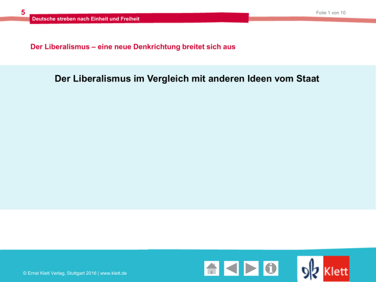 5 Folie 1 von 10 Deutsche streben nach Einheit und Freiheit Der Liberalismus – eine neue Denkrichtung breitet sich aus Der Liberalismus im Vergleich mit anderen Ideen vom Staat Geschichte und Geschehen Oberstufe © Ernst Klett Verlag, Stuttgart 2016 | www.klett.de 5 Folie 2 von 10 Deutsche streben nach Einheit und Freiheit Der Liberalismus – eine neue Denkrichtung breitet sich aus Der Liberalismus im Vergleich mit anderen Ideen vom Staat Sozialisten Geschichte und Geschehen Oberstufe © Ernst Klett Verlag, Stuttgart 2016 | www.klett.de 5 Folie 3 von 10 Deutsche streben nach Einheit und Freiheit Der Liberalismus – eine neue Denkrichtung breitet sich aus Der Liberalismus im Vergleich mit anderen Ideen vom Staat Sozialisten Geschichte und Geschehen Oberstufe Gesellschaft ohne Staat und Regierung © Ernst Klett Verlag, Stuttgart 2016 | www.klett.de 5 Folie 4 von 10 Deutsche streben nach Einheit und Freiheit Der Liberalismus – eine neue Denkrichtung breitet sich aus Der Liberalismus im Vergleich mit anderen Ideen vom Staat Sozialisten Geschichte und Geschehen Demokraten Oberstufe Gesellschaft ohne Staat und Regierung © Ernst Klett Verlag, Stuttgart 2016 | www.klett.de 5 Folie 5 von 10 Deutsche streben nach Einheit und Freiheit Der Liberalismus – eine neue Denkrichtung breitet sich aus Der Liberalismus im Vergleich mit anderen Ideen vom Staat Sozialisten Geschichte und Geschehen Demokraten Oberstufe Gesellschaft ohne Staat und Regierung Staat, der stellvertretend für alle Bürger durch einzelne Bürger Macht ausübt © Ernst Klett Verlag, Stuttgart 2016 | www.klett.de 5 Folie 6 von 10 Deutsche streben nach Einheit und Freiheit Der Liberalismus – eine neue Denkrichtung breitet sich aus Der Liberalismus im Vergleich mit anderen Ideen vom Staat Sozialisten Geschichte und Geschehen Demokraten Liberale Oberstufe Gesellschaft ohne Staat und Regierung Staat, der stellvertretend für alle Bürger durch einzelne Bürger Macht ausübt © Ernst Klett Verlag, Stuttgart 2016 | www.klett.de 5 Folie 7 von 10 Deutsche streben nach Einheit und Freiheit Der Liberalismus – eine neue Denkrichtung breitet sich aus Der Liberalismus im Vergleich mit anderen Ideen vom Staat Sozialisten Geschichte und Geschehen Demokraten Liberale Oberstufe Gesellschaft ohne Staat und Regierung Staat, der stellvertretend für alle Bürger durch einzelne Bürger Macht ausübt © Ernst Klett Verlag, Stuttgart 2016 | www.klett.de Staat, in dem das Volk die Macht besitzt, aber an einen Vertreter (z.B. einen König) übergeben kann 5 Folie 8 von 10 Deutsche streben nach Einheit und Freiheit Der Liberalismus – eine neue Denkrichtung breitet sich aus Der Liberalismus im Vergleich mit anderen Ideen vom Staat Sozialisten Geschichte und Geschehen Demokraten Liberale Oberstufe Gesellschaft ohne Staat und Regierung Staat, der stellvertretend für alle Bürger durch einzelne Bürger Macht ausübt © Ernst Klett Verlag, Stuttgart 2016 | www.klett.de Staat, in dem das Volk die Macht besitzt, aber an einen Vertreter (z.B. einen König) übergeben kann Staat, in dem sich Herrscher an Gesetze und Ordnungen halten müssen 5 Folie 9 von 10 Deutsche streben nach Einheit und Freiheit Der Liberalismus – eine neue Denkrichtung breitet sich aus Der Liberalismus im Vergleich mit anderen Ideen vom Staat Sozialisten Geschichte und Geschehen Demokraten Liberale Oberstufe Gesellschaft ohne Staat und Regierung Staat, der stellvertretend für alle Bürger durch einzelne Bürger Macht ausübt © Ernst Klett Verlag, Stuttgart 2016 | www.klett.de Staat, in dem das Volk die Macht besitzt, aber an einen Vertreter (z.B. einen König) übergeben kann Staat, in dem sich Herrscher an Gesetze und Ordnungen halten müssen Konservative 5 Folie 10 von 10 Deutsche streben nach Einheit und Freiheit Der Liberalismus – eine neue Denkrichtung breitet sich aus Der Liberalismus im Vergleich mit anderen Ideen vom Staat Sozialisten Geschichte und Geschehen Demokraten Liberale Oberstufe Gesellschaft ohne Staat und Regierung Staat, der stellvertretend für alle Bürger durch einzelne Bürger Macht ausübt © Ernst Klett Verlag, Stuttgart 2016 | www.klett.de Staat, in dem das Volk die Macht besitzt, aber an einen Vertreter (z.B. einen König) übergeben kann Staat, in dem sich Herrscher an Gesetze und Ordnungen halten müssen Konservative Staat, in dem ein Herrscher „absolut“ regiert 5 Deutsche streben nach Einheit und Freiheit Der Liberalismus – eine neue Denkrichtung breitet sich aus Der Liberalismus im Vergleich mit anderen Ideen vom Staat © Ernst Klett Verlag, Stuttgart 2016 | www.klett.de Der Liberalismus im Vergleich mit anderen Ideen vom Staat Geschichte und Geschehen Sekundarstufe I Ernst Klett Verlag GmbH, Stuttgart 2016 Alle Rechte vorbehalten. www.klett.de Impressum c/o Ernst Klett Verlag GmbH Rotebühlstraße 77 70178 Stuttgart http://www.klett.de Stuttgart HRB 10746 Umsatzsteuer-ID-Nr.: DE 811122363 Verleger: Dr.h.c. Michael Klett Geschäftsführer: Dr. Angela Bleisteiner, Tilo Knoche (Vorsitz), Ulrich Pokern Geschichte und Geschehen Hinweise zum Einsatz Alle Folien dürfen bearbeitet werden. Die Folie in Oberstufe schwarz-weiß eignet sich als Kopiervorlage, zum Gebrauch auf dem Overheadprojektor oder dem Whiteboard. Oder Sie drucken die Folie aus und beschriften diese. Wir wünschen Ihnen einen guten Unterrichtverlauf. Mit freundlichen Grüßen Redaktion Geschichte © Ernst Klett Verlag, Stuttgart 2016 | www.klett.de Autor: Dr. Tobias Dietrich Redaktion: Jana Schumann Das Werk und seine Teile sind urheberrechtlich geschützt. Das Gleiche gilt für die Software sowie das Begleitmaterial. Jede Nutzung in anderen als den gesetzlich zugelassenen oder in den Lizenzbestimmungen genannten Fällen bedarf der vorherigen schriftlichen Einwilligung des Verlages. Hinweis zu §52 a UrhG: Weder das Werk noch seine Teile dürfen ohne eine solche Einwilligung eingescannt und in ein Netzwerk eingestellt werden. Dies gilt auch für Intranets von Schulen und sonstig
