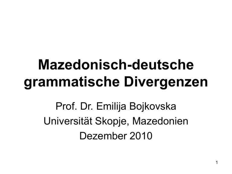 Mazedonisch-deutsche grammatische Divergenzen Prof. Dr. Emilija Bojkovska Universität Skopje, Mazedonien Dezember 2010 1 Mk.-dt. gramm. Divergenzen • stehen im Mittelpunkt • der kontrastivlinguistischen, • der translationswissenschaftlichen sowie • der fremdprachendidaktischen Untersuchungen 2 Divergenz • Divergenz = Unterschiede zwischen Sprachsystemen, und zwar häufig derart, dass die Zielsprache mehrere Entsprechungen für eine Erscheinung in der Ausgangsprache aufweist (=Differenzierung); dt. maz Ufer брег / breg Küste 3 Divergenz dt. Onkel maz. стрико/striko, чичко/čičko ,Bruder des Vaters’, вујко/vujko ,Bruder der Mutter’ тетин/tetin ‚Ehegatte der Tante’ 4 Konvergenz das Gegenteil von Divergenz: für mehrere Audrucksformen einer Erscheinung oder mehrere Lexeme in der Ausgangssprache gibt es nur eine Entsprechung in der Zielsprache. 5 Konvergenz dt. Ufer maz. breg Küste maz. стрико/striko чичко/čičko вујко/vujko тетин/tetin dt. Onkel 6 1. Definiter Artikel 1.1. Stellung DT- MK • Der deutsche definite Artikel leitet die Nominalphrase [NomP] ein der Vorschlag, die Reise • Das mazedonische definite Artikelmorphem ist ein postponiertes grammatisches Morphem: -от -та -то -те / -ot -ta -to -te Es wird dem ersten Wort zugewiesen, das die NomP einleitet. книгата / knigata; ,das Buch’ wörtl.: ,Buch-d-‘ новата книга / novata kniga das neue Buch’ wörtl.: ,neu-d- Buch’ 7 1. Definiter Artikel 1.2. Genusmarkierung DT • Das Nomen steuert die Artikelform nach Genus (im Singular), Kasus und Numerus • Das Genus des Nomens ist meistens am definiten Artikel erkennbar 8 1. Definiter Artikel 1.2. Genusmarkierung DT • Die Nomina haben, von wenigen Ausnahmen abgesehen, ein konstantes Genus. • Ausnahmen: 1. Nomina mit gleichbleibender Bedeutung (der/das Meter, der/das Liter) 2. Nomina mit Bedeutungsunterschied (der Band, das Band; der Leiter, die Leiter) (Homonyme) 9 1. Definiter Artikel 1.2. Genusmarkierung MAZ • Die meisten Nomina sind genuskonstant. Die Form des def. Art. richtet sich nach Genus, Auslaut und Numerus des Nomens. • Mask. Sg. – дворот / dvorot ,der Hof’ wörtl.: ,Hof-d-’ • Fem. Sg. – куќата / kukjata ‚das Haus’ wörtl.: ,Haus-d-’, • Neutr. Sg. – селото / seloto ,das Dorf’ wörtl.: ,Dorf-d-’ • Pl.: – куќите / kukjite ,die Häuser’ wörtl.: ,Häuser-d-’, – полињата / polinjata ,die Felder’ wörtl.: ,Felder-d-’ 10 1. Definiter Artikel 1.2. Genusmarkierung MAZ Einige Formen des def. Art. markieren nur ein Genus (от/ot für Mask.Sg.), einige sind mehrdeutig -та/ta • Fem. Sg.: планината / planinata ,der Berg’ wörtl. ,Berg-d-’ • Mask. Sg.: судијата / sudijata ,der Richter’ wörtl.: ,Richter-d-’ • Pl. селата / selata ,die Dörfer’ wörtl.: ,Dörfer-d-’ лисјата / lisjata ,die Blätter’ wörtl.: ,Blätter-d-’ 11 1. Definiter Artikel 1.2. Genusmarkierung MAZ 1. Es gibt eine kleine Gruppe von Nomina mit variablem Genus unter gleichbleibender Bedeutung (Mask. oder Fem.): песок/pesok жар/žar пепел/pepel ,Sand’ ,Glut’ ,Asche’ кал/kal прав/prav ,Schlamm’ ,Staub’ z.B.: песокот / pesokot (Mask.Sg.) pesokta / песокта (Fem.Sg.); ,Sand’ 12 1. Definiter Artikel 1.2. Genusmarkierung MAZ • 2. Nomina als verschiedene Lexikoneinträge mit demselben Auslaut полетот / poletot (Mask. Sg.) ,Schwung’ пролетта/ proletta (Fem. Sg.) ,Frühling’ копнежот/kopnežot (Mask. Sg.) ,Sehnsucht’ надежта/nadežta (Fem. Sg.) ,Hoffnung’ 13 1. Definiter Artikel 1.2. Genusmarkierung DT MAZ • Im Deutschen richtet sich der def. Art. nach Genus (im Sing.) Numerus und Kasus des Nomens. • Im Mazedonischen richtet sich der Artikel nach Genus, Numerus und Auslaut des Nomens. 14 1. Definiter Artikel 1.3. Deixis DT • Der def. Art. im Deutschen drückt im Allgemeinen das semantische Merkmal ,definit’/,bekannt’ aus. (1) Zu diesem Zweck muss ein Vertrag ausgefertigt werden. Der Vertrag ... (2) Das Auto ist schon alt. (wenn die Größe in Sichtweite der Gesprächsbeteiligten liegt) (3) Die Nomenattribute können folgende Realisierungen haben: ... (4) Dieser Kollege ist der Projektleiter. 15 1. Definiter Artikel 1.3. Deixis MAZ • Der definite Artikel im Mazedonischen drückt dasselbe semantische Merkmal ,definit‘ wie im Deutschen aus. Статијата е објавена во Скопје. / Statijata e objavena vo Skopje. ,Der Artikel wurde in Skopje veröffentlicht’. 16 1. Definiter Artikel 1.3. Deixis • Deixis ist Referenz auf die Sprechsituation bzw. deren Bestandteile - personale Deixis (ich, du, dieser, jener, ...), - lokale Deixis (hier, dort, dieses, jenes, ...), - temporale Deixis (heute, gestern, ...) usw. Die deiktischen Mittel verweisen je nach der Sprechsituation auf verschiedene Größen (jeder Sprecher bezeichnet sich selbst als ‚ich’ und jeder laufende Tag wird „heute“ genannt). 17 1. Definiter Artikel 1.3. Deixis MAZ Zum Ausdruck der Deixis treten zur –т/tWurzel zwei weitere Wurzeln: -в/v-und н/n-. -от –та -то -те / -ot -ta -to te -ов -ва -во -ве / -ov -va -vo -ve -он -на -но -не / -on -na -no -ne 18 1. Definiter Artikel 1.3. Deixis MAZ • Räumliche Deixis Подај ми ја чашата. / Podaj mi ja čašata. ,Reich mir das Glas in deiner Nähe.’ Земи ја чашава. Zemi ja čašava. ,Nimm das Glas in meiner Nähe, ggf. das Glas, das ich gerade halte’ Подај ми ја чашана. Podaj mi ja čašana. ,Reich mir das von uns entfernte, jedoch in meinem Blickfeld liegende Glas’. 19 1. Definiter Artikel 1.3. Deixis MAZ • Zeitliche Deixis - вчерашните вести / včerasnite vesti die Nachrichten von gestern’ wörtl.: ,die gestrigen Nachrichten’ - во понеделникот / vo ponedelnikot ,am vergang