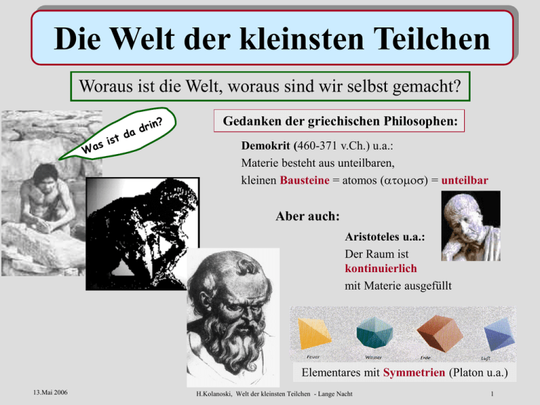Die Welt der kleinsten Teilchen Woraus ist die Welt, woraus sind wir selbst gemacht? Gedanken der griechischen Philosophen: Demokrit (460-371 v.Ch.) u.a.: Materie besteht aus unteilbaren, kleinen Bausteine = atomos () = unteilbar Aber auch: Aristoteles u.a.: Der Raum ist kontinuierlich mit Materie ausgefüllt Elementares mit Symmetrien (Platon u.a.) 13.Mai 2006 H.Kolanoski, Welt der kleinsten Teilchen - Lange Nacht 1 Dass ich erkenne .. 13.Mai 2006 H.Kolanoski, Welt der kleinsten Teilchen - Lange Nacht 2 Die Materie ist „körnig“, aus Bausteinen aufgebaut Empirische Hinweise auf atomare Struktur der Materie erst im 19.Jahrhundert: 1) Elemente verbinden sich in immer gleichen Gewichtsverhältnissen: 16g Sauerstoff + 2 g Wasserstoff = 18 g Wasser 2 : 16 weil Masse(O) = 16 Masse(H) 2) Druck und Temperatur in Gasen erklärbar durch bewegte Teilchen Schlussfolgerungen sind indirekt. Kann man Teilchen sichtbar machen? 13.Mai 2006 H.Kolanoski, Welt der kleinsten Teilchen - Lange Nacht 3 Wie kann man kleine Teilchen „sehen“ ? E.Rutherford misst die Struktur der Atome durch Streuversuche a) Rutherfords Erwartung b) Rutherfords Ergebnis 13.Mai 2006 H.Kolanoski, Welt der kleinsten Teilchen - Lange Nacht Rutherford Applet 4 Rutherford‘s Atommodell: 10-14 m Kern : Atom = 1 : 10 000 10-8 m das Atom ist leer ! Und das Atom ist nicht unteilbar – es besteht aus Elektronen und dem Kern und voraus bestehen die…? 13.Mai 2006 H.Kolanoski, Welt der kleinsten Teilchen - Lange Nacht 5 Der Aufbau der Materie aus kleinsten Teilchen 1/10.000.000 > < 0,01 m Kristall 10-9 m Molekül 1/10 1/10.000 10-10 m Atom 1/1.000 1/10 10-14 m Atomkern 10-15 m Proton Stecknadelkopf: 10-3m = 0,001m <10-18 m Quark, Elektron Elektron, Quark: <10-18m = 0,000000000000000001m mal10 punktförmig? 13.Mai 2006 H.Kolanoski, Welt der kleinsten Teilchen - Lange Nacht 6 Die Struktur der Materie: Materie ist aus Bausteinen aufgebaut, Vielfalt der Natur durch Zusammensetzen von Elementarem Die kleinsten Teilchen sind winzig oder haben keine Ausdehnung, der Raum ist leer Warum wirkt Materie – z.B. ein Tisch – dann massiv? Teilchen üben Kräfte untereinander aus! Was sind die Kräfte, die die Welt im Innersten zusammenhalten? 13.Mai 2006 H.Kolanoski, Welt der kleinsten Teilchen - Lange Nacht 7 Die fundamentalen Kräfte in der Natur p n n n pn p n n np p n p p pp p n 13.Mai 2006 H.Kolanoski, Welt der kleinsten Teilchen - Lange Nacht 8 Teilchen als Kraftvermittler Abstoßend Anziehend Austauschteilchen sind die Quanten der Kraftfelder 13.Mai 2006 H.Kolanoski, Welt der kleinsten Teilchen - Lange Nacht 9 Experimente Welche Teilchen ? Welche Kräfte ? … Antworten durch Analyse hochenergetischer Teilchenkollisionen: 13.Mai 2006 H.Kolanoski, Welt der kleinsten Teilchen - Lange Nacht 10 13.Mai 2006 H.Kolanoski, Welt der kleinsten Teilchen - Lange Nacht 11 Warum hohe Energien? Energie = Kraft Weg Energie = Masse c2 E=mc2 1 Elektronenvolt = Energie eines Elektrons nach Durchlaufen einer Spannung 1 Volt Energie: 13.Mai 2006 - Abtasten von Strukturen - Aufbrechen von Strukturen - Erzeugung von neuer Materie: E=mc2 H.Kolanoski, Welt der kleinsten Teilchen - Lange Nacht 12 Beschleuniger Simulation Linearbeschleuniger: 13.Mai 2006 Speicherring: H.Kolanoski, Welt der kleinsten Teilchen - Lange Nacht 13 ZEUS H1 13.Mai 2006 H.Kolanoski, Welt der kleinsten Teilchen - Lange Nacht 14 Wie sieht man Quarks? Quarks im Proton Quark-Jet Elektron g Proton Elektron Quark-Jet Elektron 13.Mai 2006 H1-Detektor H.Kolanoski, Welt der kleinsten Teilchen - Lange Nacht 15 Teilchendetektoren Prinzip: Nachweis von WW der Teilchen mit Materie: z.B. Ionisationsspuren sichtbar machen: Schwärzung einer Photoemulsion Funkenkammer Vieldrahtproportionalkammer Ortsgenauigkeit ~1 m (der ungeschlagene Rekord) 13.Mai 2006 H.Kolanoski, Welt der kleinsten Teilchen - Lange Nacht 16 AMANDA / IceCube Vortrag: „Neutrinojagd am Südpol“ um 23 Uhr Hochenergetische Teilchen machen Licht, z.B. im Südpoleis 13.Mai 2006 H.Kolanoski, Welt der kleinsten Teilchen - Lange Nacht 17 Erzeugung von Quarks und Antiquarks aus Energie jet quark e– e+ jet antiquark 13.Mai 2006 H.Kolanoski, Welt der kleinsten Teilchen - Lange Nacht 18 Materie und Antimaterie Entdeckung des Positrons = Antielektron Symmetrie der Materie und Antimaterie: Teilchen mit gleicher Masse, aber umgekehrte Ladungen Teilchen-Antiteilchen entstehen als Paar aus Energie und vernichten sich als Paar 13.Mai 2006 H.Kolanoski, Welt der kleinsten Teilchen - Lange Nacht 19 Systematik in der Welt der Teilchen Systematik Symmetrien Warum 3? 3 Familien von Quarks und Leptonen Brauchen nur 1.Familie für die Atome: Proton=uud, Neutron=udd, Elektron !? Ist das alles? 13.Mai 2006 + Kraftteilchen g, W, Z0, 8 Gluonen, Graviton H.Kolanoski, Welt der kleinsten Teilchen - Lange Nacht 20 HIGGS-Teilchen Die Teilchen in den 3 Familien unterscheiden sich nur in ihrer Masse. Schöne Symmetrie, wenn alle Teilchen keine Masse hätten. Warum haben die Teilchen Masse? Antwort der Theoretiker: Higgs-Teilchen „gibt“ allen Teilchen Masse Wie kann man das verstehen???? Masse Trägheit Der britische Wissenschaftsminister wollte das auch verstehen, bevor er das Geld für den „Large Hadron Collider“ locker macht …….. 13.Mai 2006 H.Kolanoski, Welt der kleinsten Teilchen - Lange Nacht 21 Wie die HIGGS-Teilchen träge machen Party: Gäste erwarten Angela … Angela kommt – Wellenbewegung in Richtung Tür Masse Trägheit Gäste = Higgs-Feld Angela = massives Teilchen 13.Mai 2006 H.Kolanoski, Welt der kleinsten Teilchen - Lange Nacht Gäste suchen die Nähe von Angela Angela wird unbeweglich – bekommt Masse 22 Large Hadron Collider im CERN/Genf Suche nach • dem Higgs-Teilchen • nach Supersymmetrie ( Dunkle Materie?) • Extra-Dimensionen … ATLAS detector 13.Mai 2006 H.Kolanoski, Welt der kleinsten Teilchen - Lange Nacht 23 Prasizionsmessung der Higgs-Eigenschaften: International Linear Collider 13.Mai 2006 H.Kolanoski, Welt der kleinst
