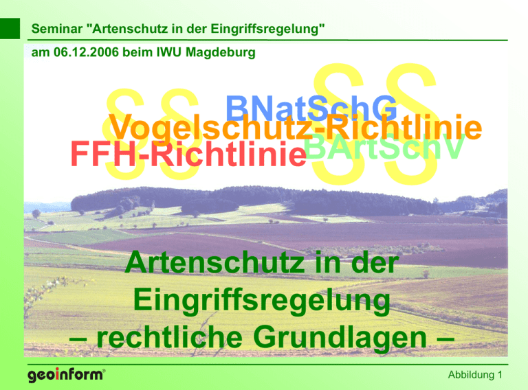 Seminar "Artenschutz in der Eingriffsregelung" am 06.12.2006 beim IWU Magdeburg §§ §§ BNatSchG Vogelschutz-Richtlinie FFH-RichtlinieBArtSchV Artenschutz in der Eingriffsregelung – rechtliche Grundlagen – Abbildung 1 Gliederung Übersicht artenschutzrechtlicher Regelwerke Kategorien geschützter Arten EG-Artenschutzverordnung FFH-Richtlinie Vogelschutzrichtlinie Bundesartenschutzverordnung Rechtliche Grundlagen: artenschutzrechtliche Verbote, Ausnahmen und Befreiungsmöglichkeiten Artenschutzrechtliche Regelungen des BNatSchG Artenschutzrechtliche Regelungen der FFH-Richtlinie Artenschutzrechtliche Regelungen der Vogelschutzrichtlinie Kompatibilität der bundes- und europarechtlichen Regelungen Berücksichtigung artenschutzrechtlicher Belange in der Eingriffsregelung aktuelle Aktivitäten des Gesetzgebers (Entwurf BNatSchG-Novelle) Abbildung 2 Übersicht artenschutzrechtlicher Regelwerke Biodiversitätskonvention (1992/1993) Washingtoner Artenschutzübereinkommen (1973/1975) EG-Artenschutz-VO (1973) Berner Konvention (1979/1984) Ramsar-Konvention (1971/1976) Bonner Konvention (1979/1984) Eurobats (1991/1993) Vogelschutz-RL (1979) FFH-RL (1992) Bundesnaturschutzgesetz (BNatSchG) Bundesartenschutzverordnung (1989) Abbildung 3 Kategorien besonders geschützter und streng geschützter Arten Definition in § 10 Abs. 2 BNatSchG: 10. besonders geschützte Arten a) Tier- und Pflanzenarten, die in Anhang A oder B der Verordnung (EG) Nr. 338/97 des Rates vom 9. Dezember 1996 über den Schutz von Exemplaren wild lebender Tier- und Pflanzenarten durch Überwachung des Handels [EG-Artenschutzverordnung] ... aufgeführt sind, b) nicht unter Buchstabe a fallende aa) Tier- und Pflanzenarten, die in Anhang IV der Richtlinie 92/43/EWG [FFH-Richtlinie] aufgeführt sind, bb) "europäische Vogelarten" [in Europa natürlich vorkommende Vogelarten im Sinne des Artikels 1 der Vogelschutzrichtlinie], c) Tier- und Pflanzenarten, die in einer Rechtsverordnung nach § 52 Abs. 1 [Anlage 1 Spalte 2 Bundesartenschutzverordnung] aufgeführt sind, 11. streng geschützte Arten besonders geschützte Arten, die a) in Anhang A der Verordnung (EG) Nr. 338/97 [EG-Artenschutzverordnung] , b) in Anhang IV der Richtlinie 92/43/EWG [FFH-Richtlinie], c) in einer Rechtsverordnung nach § 52 Abs. 2 [Anlage 1 Spalte 3 Bundesartenschutzverordnung] aufgeführt sind, Abbildung 4 Kategorien besonders geschützte und streng geschützte Arten besonders geschützte Arten Anhang A EG-Artenschutzverordnung Anhang B EG-Artenschutzverordnung Anhang IV FFH-Richtlinie Europäische Vogelarten Anlage 1 Spalte 2 Bundesartenschutzverordnung Abbildung 5 Kategorien besonders geschützte und streng geschützte Arten allgemeiner Artenschutz besonders geschützte Arten streng geschützte Arten Anhang A EG-Artenschutzverordnung Anhang B EG-Artenschutzverordnung Anhang IV FFH-Richtlinie Europäische Vogelarten Anlage 1 Spalte 3 Bundesartenschutzverordnung Anlage 1 Spalte 2 Bundesartenschutzverordnung alle wild lebenden Tiere und Pflanzen zentrale Schutzvorschrift: §41 BNatSchG Abbildung 6 Geschützte Arten nach EG-Artenschutzverordnung besonders geschützte Arten streng geschützte Arten Anhang A EG-Artenschutzverordnung Anhang B EG-Artenschutzverordnung Anhang IV FFH-Richtlinie Europäische Vogelarten Anlage 1 Spalte 3 Bundesartenschutzverordnung Anlage 1 Spalte 2 Bundesartenschutzverordnung Abbildung 7 Geschützte Arten nach EG-Artenschutzverordnung Arten des Anhangs A (streng geschützte Arten) nach Art. 3 Abs. 1 EG-ArtSchVO: a) Arten des Anhangs I des Washingtoner Artenschutzübereinkommens (= von der Ausrottung bedrohte Arten, die durch den Handel beeinträchtigt werden oder werden können) b) im gemeinschaftlichen oder internationalen Handel gefragte Arten, die vom Aussterben bedroht oder so selten sind, dass jeglicher Handel das Überleben der Art gefährden würde c) alle Arten einer Gattung bzw. alle Unterarten einer Art, deren Taxa größtenteils unter b) fallen, wenn ihre Aufnahme in den Anhang für den wirksamen Schutz dieser Taxa von wesentlicher Bedeutung ist. Überwiegend nicht einheimische Arten, aber auch einige zum Teil häufige und weit verbreitete Arten der heimischen Fauna Abbildung 8 Geschützte Arten nach EG-Artenschutzverordnung Beispiele für einheimische Arten des Anhangs A (streng geschützte Arten): Säugetiere Wolf, Braunbär Fischotter Wildkatze, Eurasischer Luchs Vögel Schwarzstorch Knäkente Fischadler, Seeadler, Habicht, Sperber Mäusebussard, Wespenbussard Rohrweihe, Kornweihe, Wiesenweihe Schwarzmilan, Rotmilan Wanderfalke, Baumfalke, Turmfalke Kranich Turteltaube Schleiereule, Waldohreule, Waldkauz, Steinkauz, Uhu, Sperlingskauz, ... Gefäßpflanzen alle heimischen Greifvögel alle heimischen Eulen und Käuze Frauenschuh Sumpf-Glanzkraut Abbildung 9 Geschützte Arten nach EG-Artenschutzverordnung Beispiele für häufige einheimische Arten des Anhangs A: Mäusebussard Quelle: Nicolai (1993), Atlas der Brutvögel Ostdeutschlands Abbildung 10 Geschützte Arten nach EG-Artenschutzverordnung Beispiele für häufige einheimische Arten des Anhangs A: Turmfalke Quelle: Nicolai (1993), Atlas der Brutvögel Ostdeutschlands Abbildung 11 Geschützte Arten nach EG-Artenschutzverordnung Beispiele für häufige einheimische Arten des Anhangs A: Waldkauz Quelle: Nicolai (1993), Atlas der Brutvögel Ostdeutschlands Abbildung 12 Geschützte Arten nach EG-Artenschutzverordnung Beispiele für häufige einheimische Arten des Anhangs A: Turteltaube Quelle: Nicolai (1993), Atlas der Brutvögel Ostdeutschlands Abbildung 13 Geschützte Arten nach EG-Artenschutzverordnung Arten des Anhangs B (besonders geschützte Arten) nach Art. 3 Abs. 2 EG-ArtSchVO: a) Arten des Anhangs II des Washingtoner Artenschutzübereinkommens (= potenziell von der Ausrottung bedrohte Arten, sofern der Handel mit ihnen keiner strengen Regelung unterworfen wird) b) Arten des Anhangs I des Washingtoner Artenschutzübereinkommens , zu denen ein Vorbehalt angemeldet 