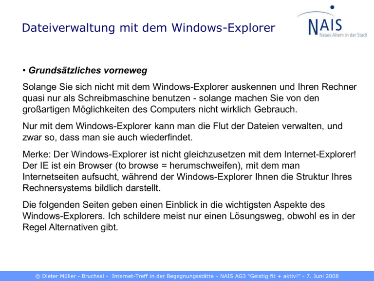 Dateiverwaltung mit dem Windows-Explorer • Grundsätzliches vorneweg Solange Sie sich nicht mit dem Windows-Explorer auskennen und Ihren Rechner quasi nur als Schreibmaschine benutzen - solange machen Sie von den großartigen Möglichkeiten des Computers nicht wirklich Gebrauch. Nur mit dem Windows-Explorer kann man die Flut der Dateien verwalten, und zwar so, dass man sie auch wiederfindet. Merke: Der Windows-Explorer ist nicht gleichzusetzen mit dem Internet-Explorer! Der IE ist ein Browser (to browse = herumschweifen), mit dem man Internetseiten aufsucht, während der Windows-Explorer Ihnen die Struktur Ihres Rechnersystems bildlich darstellt. Die folgenden Seiten geben einen Einblick in die wichtigsten Aspekte des Windows-Explorers. Ich schildere meist nur einen Lösungsweg, obwohl es in der Regel Alternativen gibt. © Dieter Müller - Bruchsal - Internet-Treff in der Begegnungsstätte - NAIS AG3 “Geistig fit + aktiv!” - 7. Juni 2008 Dateiverwaltung mit dem Windows-Explorer • Die Dateiverwaltung 1. Der Windows-Explorer 2. Die Laufwerkskennungen 3. Der Pfad 4. Die Dateitypen 5. Dateien und Ordner - Welche Logik? 6. Erstellen, Kopieren und Einfügen, Umbenennen, Löschen 7. Suchfunktion im Windows-Explorer 8. Bildervorschau 9. Dateien auf andere Medien kopieren 10. Drag & Drop - Ziehen und Fallenlassen 11. Mehrere Dateien Markieren © Dieter Müller - Bruchsal - Internet-Treff in der Begegnungsstätte - NAIS AG3 “Geistig fit + aktiv!” - 7. Juni 2008 Dateiverwaltung mit dem Windows-Explorer • 1. Der Windows-Explorer Der Windows-Explorer ist Bestandteil der Windows-Betriebssysteme. Er ermöglicht Dateien- und Verzeichnisoperationen (Anlegen, Kopieren, Löschen, Umbenennen, Öffnen - neuerdings auch das Entpacken von ZIP-Archiven). Üblich ist die hierarchisch, alphabetische Darstellung in zwei Fenstern, wobei links die Ordner stehen und rechts die Dateien. Öffnen des Windows-Explorers: a) Doppelklick auf Arbeitsplatz oder: b) Start > rechte Maustaste > Explorer oder: c) [Windows-Taste] und [E] gleichzeitig drücken © Dieter Müller - Bruchsal - Internet-Treff in der Begegnungsstätte - NAIS AG3 “Geistig fit + aktiv!” - 7. Juni 2008 Dateiverwaltung mit dem Windows-Explorer • 2. Die Laufwerkskennungen Auf der linken Seite listet der Explorer alle Laufwerke auf, die an den Computer angeschlossen sind. A ist traditionell das Diskettenlaufwerk (nur noch in alten PCs). C ist immer die Festplatte. D und E sind in diesem Falle weitere Festplattenpartitionen. F ist das DVD/CD-Rom-Laufwerk. G ist der DVD-Brenner. H ist eine externe Festplatte. I, J und K sind USB-Geräte. L ist ein USB-Stick. M ist ein USB-Gerät. N, O, P und Q sind 4 Partitionen einer weiteren externen Festplatte. Es besteht die Möglichkeit, die Laufwerke umzubenennen (nur für erfahrene Benutzer). Achten Sie auf die Ordner Eigenen Dateien (oben) und den Papierkorb (unten). Eigene Dateien ist der wichtigste von allen und identisch mit C:\Dokumente und Einstellungen\Computer\Eigene Dateien. © Dieter Müller - Bruchsal - Internet-Treff in der Begegnungsstätte - NAIS AG3 “Geistig fit + aktiv!” - 7. Juni 2008 Dateiverwaltung mit dem Windows-Explorer • 3. Der Pfad Die Datei windows-explorer.ppt findet man, wenn man folgendem Pfad folgt: Eigene Dateien\Ältere Menschen\NAIS\AG3 - Geistig fit bleiben\Internet\Windows-Explorer\Text Windows-Explorer\windows-explorer.ppt (alles hintereinander geschrieben ohne Umbruch). Unterordner öffnen sich, indem man auf das + vor dem Ordner klickt. Ordner = Verzeichnis. Den umgekehrten Schrägstrich nennt man Backslash: \ Geschrieben wird er indem man [Alt Gr] und [ß] gleichzeitig drückt. © Dieter Müller - Bruchsal - Internet-Treff in der Begegnungsstätte - NAIS AG3 “Geistig fit + aktiv!” - 7. Juni 2008 Dateiverwaltung mit dem Windows-Explorer • 4. Die Dateitypen Die Dateien befinden sich in der rechten Hälfte des Windows-Explorers. Die häufigsten Typen sind .doc (Texte), .xls (Tabellen), .ppt (Powerpoint), .jpg und .gif (Bilder), .pdf (meistens Texte) sowie .htm und .html (Internet). Hier findet man weitere Details (s. Abb.). Mit einem Doppelklick kann man jede Datei öffnen (oder mit rechte Maustaste > öffnen mit). Oben in der Leiste befindet sich ein Symbol, mit dem man weitere Darstellungsformen öffnen kann. © Dieter Müller - Bruchsal - Internet-Treff in der Begegnungsstätte - NAIS AG3 “Geistig fit + aktiv!” - 7. Juni 2008 Dateiverwaltung mit dem Windows-Explorer • 5. Dateien und Ordner (Verzeichnisse) - Welche Logik? Man sagt immer, der Computer erziehe zum logischen Denken. Ich würde lieber sagen: er hilft, Dein Oberstübchen besser kennenzulernen. Man ist nämlich bei der Anlage der Struktur der Ordner und Dateien im Windows-Explorer völlig auf sich allein gestellt. Wer seine Dateien im falschen Ordner ablegt, oder die Unterordner falsch platziert - der sucht sich einen Wolf! Deshalb: Erforsche Dich selbst! Legst Du die Unterlagen für die KFZVersicherung im täglichen Leben unter Versicherungen ab, dann bleibe dabei, und speichere Sie nicht unter Auto. Der Pfad könnte lauten: Eigene Dateien\Versicherungen\Auto\Fahrzeughaftpflicht\2008\Beitrag.doc Wenn Sie Ihr System konsequent beibehalten, brauchen Sie keine Spickzettel, um Ihre Daten wiederzufinden. © Dieter Müller - Bruchsal - Internet-Treff in der Begegnungsstätte - NAIS AG3 “Geistig fit + aktiv!” - 7. Juni 2008 Dateiverwaltung mit dem Windows-Explorer • 6. Erstellen, Kopieren und Einfügen, Umbenennen, Löschen Einen neuen Ordner erstellen: Im Windows-Explorer auf die Stelle gehen, unter der der neue Ordner angelegt werden soll. Markieren > Datei > neuer Ordner > Namen eingeben > Returntaste. Der neue Ordner wird alphabetisch einsortiert. Kopieren: Datei markieren > rechte Maustaste > kopieren (nun ist die Kopie unsichtbar im sog. Zwischenspeicher) > zu dem Ordner gehen, in den die Datei eingefügt werden soll > markieren > rechte Maustaste > einfügen - fertig! Umbenennen: