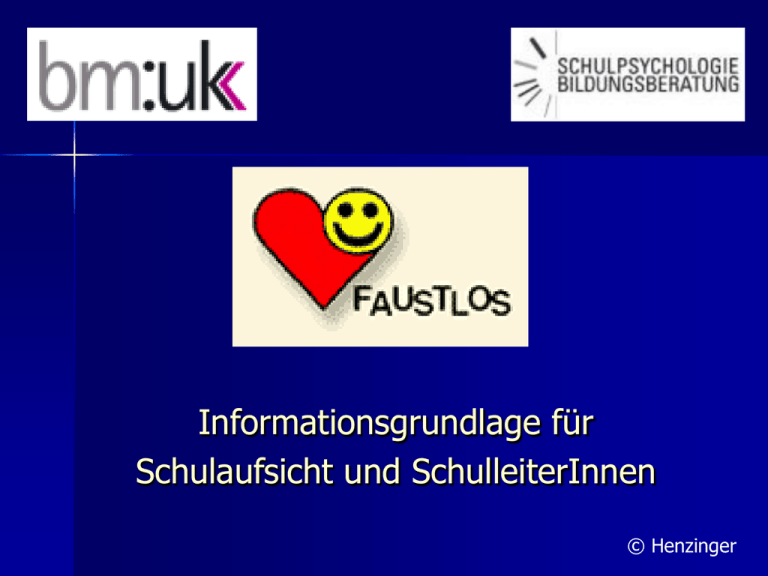 Informationsgrundlage für Schulaufsicht und SchulleiterInnen © Henzinger Nationale Strategie gegen Gewalt 2 © Henzinger BM Schmied / Univ. Prof. Ch. Spiel 20.11.2007 Folgende konkrete Maßnahmen: Weiterbildungsoffensive für Lehrerinnen und Lehrer (PH) Intensivierung von Information und Vernetzung der Betroffenen und Beteiligten Verhaltensvereinbarungen als gemeinsamer Weg zu einem guten Schulklima Mehr Schulpsycholog/inn/en Start und Ausbau konkreter Gewaltpräventionsprogramme an den Schulen Volksschule: Hauptschule und AHS-Unterstufe: Einführung des Aggressionspräventionsprogramms "Faustlos" bundesweit: ca. 300 Projekte, Weitergabe durch die zuständige Schulaufsicht u. Schulpsychologie. ab Herbst 2008 soll das soziale Kompetenztraining "WiSK" (Wiener soziales Kompetenztraining) eingesetzt werden. Ziel von "WISK" ist die Reduktion von aggressivem Verhalten. © Henzinger Gewaltpräventionsprogramme 3 Ein Curriculum zur Prävention aggressiven Verhaltens aggressives Verhalten resultiert aus einem Mangel an sozialen Kompetenzen diese wären Voraussetzung für konstruktive Form der Konfliktbewältigung Grundschule: 1.-3. Schulstufe © Henzinger Was ist Faustlos? 4 Kurzfassung © Henzinger 5 Sozial Emotionales Lernen (SEL) Verhalten hat immer mehrere Bedeutungen: es geht um das Interpretieren von Verhalten aggressive Kinder interpretieren Verhalten oft "gegen sich gerichtet" © Henzinger Faustlos ist 6 Arbeitsmaterial mit Situationen, wie sie auch in der Klasse vorkommen systematischer Aufbau fertige Vorbereitung direkter Transfer in die Klasse © Henzinger Vorteile von FAUSTLOS 7 Ärger-Wut Impulskontr. Empathie Erkennen von Gefühlen, Ausdruck von Gefühlen Deuten von Verhalten Ursache – Wirkungsbeziehungen Absichten, Fairness Problem erkennen, Lösung finden, Schritte Umgang mit Ablenkungen, Störungen Umgang bei körperlicher Auseinandersetzung Etwas haben wollen, was einem nicht gehört Auslöser von Ärger und Wut Umgang mit Hänseleien, Umgang mit Kritik Umgang mit Ausgeschlossensein Umgang mit Vorwürfen, Enttäuschungen Sich beruhigen 8 © Henzinger Welche Themen werden angesprochen? (auszugsweise) Empathie Impulskontrolle Umgang mit Ärger und Wut © Henzinger Beispiele – Bilder - Situationen 9 ist die Fähigkeit, Gefühle zu identifizieren etwas auch aus der Perspektive einer anderen Person zu sehen emotional auf andere einzugehen © Henzinger Empathie 10 Jenny 1. Was denkt Ihr, was Jenny fühlt? 2. Woran könnt Ihr erkennen, dass sie wütend ist? (Gesicht, Körperhaltung) 3. Wie merkt Ihr, wenn jemand ärgerlich ist? (Nachbar, Freund/in, Vater, Mutter, Lehrperson, …) © Henzinger Empathietraining, 1. Kl. /L2c 11 N Leonie und Stefan 1. Warum ist Stefan wütend auf Leonie? 2. Wie fühlt Ihr Euch, wenn sich jemand etwas nimmt, ohne zu fragen? 3. Glaubt Ihr, dass Leonie beabsichtigt hat, Stefan zu ärgern? 4. Was würde passieren, wenn Stefan Leonie anschreien würde? © Henzinger Empathietraining, 1. Kl. /L7 12 Erlernen und Üben von Problemlösestrategien, d.h. willentliche Steuerung zu erlernen (anstelle von Unwillkürlichkeit) Üben von sozialen Kompetenzen (aufgeteilt in kleine Schritte) z.B. sich entschuldigen, unterbrechen, warten © Henzinger Impulskontrolle 13 N Sarah und Julia 1. Was ist das Problem? 2. Was wären mögliche Lösungen für Julia? Was kann sie tun? Ignorieren? 3. Was kann Julia innerlich sagen, um bei der Sache zu bleiben? 4. Was sollte Julia tun, wenn Sarah sie weiterhin stört? © Henzinger Impulskontrolle, 1. Kl. /L6 14 N Monika mit Ball 1. Was ist das Problem? 2. Warum haben Spiele überhaupt Regeln? 3. Was ist der nächste Schritt? Wahl der Seiten – wie geht das? 4. Wie entscheidet Ihr, wer anfängt? 5. Was könnte Monika am Schluss zu den anderen sagen, ob gewonnen od. verloren? © Henzinger Impulskontrolle, 2. Kl. /L12 15 Wahrnehmung der Auslöser von Ärger und Wut Selbstverstärkungen und Beruhigungstechniken © Henzinger Umgang mit Ärger u. Wut 16 Ärger und Wut 1. Kl. /L7 Holger 1. Was ist das Problem? 2. Was denkt Ihr, wie sich Holger fühlt? 3. Was kann Holger tun, um sich zu beruhigen? 4. Was würde passieren, wenn er die anderen beschimpfen/schlagen würde? 5. Wie kann er das Problem lösen? 6. Was sollte er sagen und wie? 7. Wo kann er Hilfe bekommen, wenn sie ihn weiter ärgern? 17 © Henzinger Umgang mit Ärger und Wut 2. Kl. /L8 N Torsten 1. Was spürt man im Körper, wenn man ärgerlich/wütend wird? 2. Warum ist Torsten wütend? 3. Was muss passieren, dass Ihr wütend werdet? Woran merkt Ihr es? 4. Was könnte Torsten zu sich sagen, um sich zu beruhigen? 5. Was würde passieren, wenn? 6. Welche Lösungen fallen Euch ein? 18 © Henzinger Umgang mit Fortbildung der Lehrkräfte günstig wären 2 Lehrpersonen/Schule Klassenlehrer/in als Durchführende/r Elterninformation Lektionen sind differenziert ausgearbeitet © Henzinger Durchführung 19 KG-Version Empathieförderung: 12 Lektionen – Wie fühlt sich ein anderes Kind? – Wie sieht die gleiche Situation ein anderes Kind? Impulskontrolle: 10 Lektionen – Unterbrechen einer Aktivität, um über ein Problem nachzudenken – Was kann man sonst tun? – ausprobieren Umgang mit Ärger und Wut: 6 Lektionen – Wie gehe ich mit Ärger und Wut um? – Welche anderen Möglichkeiten gibt es? – ausprobieren Summe: 28 Lektionen 20 © Henzinger Aufbau von FAUSTLOS