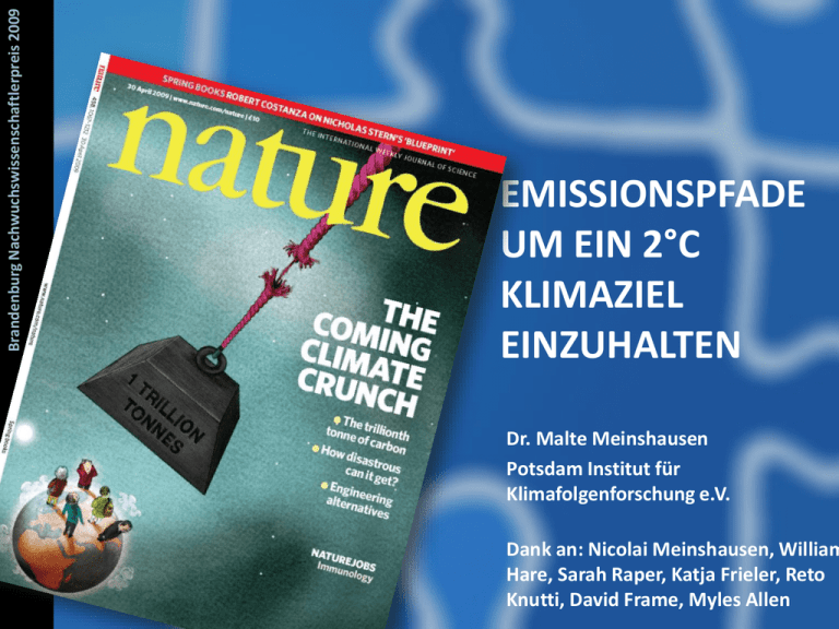 Brandenburg Nachwuchswissenschaftlerpreis 2009 EMISSIONSPFADE UM EIN 2°C KLIMAZIEL EINZUHALTEN Dr. Malte Meinshausen Potsdam Institut für Klimafolgenforschung e.V. Dank an: Nicolai Meinshausen, William Hare, Sarah Raper, Katja Frieler, Reto Knutti, David Frame, Myles Allen Das Wechselspiel zwischen Politik & Wissenschaft Politik Art. 2 UNFCCC; EU/G8-Zielsetzung: <2°C (or AOSIS, LDCs: <1.5°C) Wissenschaft Quantifizierung möglicher Klimafolgen: Dürren, Fluten, Korrallensterben, Meerespiegelanstieg … Politik a) International: Festlegung Emissionsziele auf nationaler Ebene, b) Nationale Umsetzung: ETS, Einspeisegesetz etc. Wissenschaft Quantifizierung notwendiger globaler Emissionsreduktionen abhängig davon, wie sicher man gehen will, das Ziel zu erreichen. Siehe auch: Allen et al. 2009, Matthews et al. 2009, Zickfeld et al. 2009 Methode • Wir entwickelten und nutzten MAGICC 6.0, die neueste Version eines vereinfachten KlimaKohlenstoffkreislauf Modell’s, welches auch in den IPCC (UN Klimarat) Sachstandsberichten benutzt wurde. • Wir versuchten, ein möglichst breites Spektrum an wissenschaftlichen Unsicherheiten abzubilden, sowohl bezüglich des Kohlenstoffkreislaufes, der Trägheit und Sensitivität des Klimasystems, als auch menschenversuchten Änderungen des Strahlungshaushaltes. +- Please cite: Meinshausen et al. (2009), if using this graph Please cite: Meinshausen et al. (2009), if using this graph Please cite: Meinshausen et al. (2009), if using this graph Please cite: Meinshausen et al. (2009), if using this graph Please cite: Meinshausen et al. (2009), if using this graph Please cite: Meinshausen et al. (2009), if using this graph Wieviel Emissionen können wir uns bis 2050 noch leisten? 1000 Milliarden Tonnen CO2 = 1 Billion Tonnen CO2 = 0.27 TtC Please cite: Meinshausen et al. (2009), if using this graph Please cite: Meinshausen et al. (2009), if using this graph Proven recoverable fossil fuel reserve estimates: E= R x V x C = Reserve x Net calorific Value x Carbon content From World Energy Council, Survey of Energy Resources 2007 BP Statistical Review of World Energy 2007 German Federal Inst. For Geosciences and Natural Resources 2006 IPCC 2006 Default net calorific values, carbon content emission factors Please cite: Meinshausen et al. (2009), if using this graph Please cite: Meinshausen et al. (2009), if using this graph Please cite: Meinshausen et al. (2009), if using this graph Please cite: Meinshausen et al. (2009), if using this graph Schlussfolgerungen I • Wenn wir mit einer 3 in 4 Chance unter 2°C bleiben wollen (immer noch schlechter verglichen mit russischem Roullette), dann müssen die globalen Emissionen in der ersten Hälfte dieses Jahrhunderts unter 1 Billionen Tonnen CO2 (engl. 1 Trillion) bleiben. • Mehr als ein Drittel haben wir bereits in den letzten neun Jahren aufgebraucht. Der Wissenschaftliche Beirat der Bundesregierung Globale Umweltveränderungen (WBGU) hat – von diesem Budget ausgehendend ein Konzept für die global gerechte Verteilung der Emissionen vorgestellt (September, 2009). Schlussfolgerungen II • Bis wann müssen globale Emissionen wieder anfangen zu sinken? • 2015. Bei 2020 würden die notwendigen jährlichen Reduktionen 6% pro Jahr übersteigen. • Was ist die Rolle von CCS? • Absolut notwendig. • Aber: Nicht als Wegbereiter für neue Kohlekraftwerke. Null Emissionen für grosse “Punkt”-quellen sind nicht mehr gut genug. Nur negative Emissionen in Kombination mit Biomasseverwertung werden gegen Mitte/Ende des Jahrhunderts die Zero Carbon Gesellschaft bzw. das Absenken der atmosphärischen Treibhausgaskonzentrationen ermöglichen. Danke! www.primap.org www.pik-potsdam.de