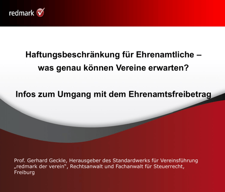 Haftungsbeschränkung für Ehrenamtliche – was genau können Vereine erwarten? Infos zum Umgang mit dem Ehrenamtsfreibetrag Prof. Gerhard Geckle, Herausgeber des Standardwerks für Vereinsführung „redmark der verein“, Rechtsanwalt und Fachanwalt für Steuerrecht, Freiburg Rechtsanwalt Prof. Gerhard Geckle, Freiburg 1 Zum Gesetz zur Begrenzung der Haftung von ehrenamtlich tätigen Vereinsvorständen Zum Gesetz zur Begrenzung der Haftung von ehrenamtlich tätigen Vereinsvorständen Rechtsanwalt Prof. Gerhard Geckle, Freiburg 22 Zum Gesetz zur Begrenzung der Haftung von ehrenamtlich tätigen Vereinsvorständen Rechtsanwalt Prof. Gerhard Geckle, Freiburg 33 Zum Gesetz zur Begrenzung der Haftung von ehrenamtlich tätigen Vereinsvorständen Rechtsanwalt Prof. Gerhard Geckle, Freiburg 44 Zum Gesetz zur Begrenzung der Haftung von ehrenamtlich tätigen Vereinsvorständen Rechtsanwalt Prof. Gerhard Geckle, Freiburg 55 Gesetzliche Grundlagen Gesetzliche Grundlagen Rechtsanwalt Prof. Gerhard Geckle, Freiburg 66 Gesetzliche Grundlagen Der neue § 31 a BGB zur persönlichen Haftung des unentgeltlich tätigen Vorstands (1) Haftung gegenüber dem Verein nur bei Vorliegen von Vorsatz oder grober Fahrlässigkeit (2) Anspruch auf Haftungsfreistellung gegen den Verein, wenn er von Dritten auf Ersatz eines in Wahrnehmung seiner Vorstandspflichten verursachten Schadens in Anspruch genommen wird. Dies gilt nicht, wenn er den Schaden vorsätzlich oder grob fahrlässig verursacht. Rechtsanwalt Prof. Gerhard Geckle, Freiburg 77 Gesetzliche Grundlagen Das große Ziel: So sollte die Vorstandshaftung auch bei der Sozialversicherung entschärft werden: § 28e SGB IV sollte wie folgt geändert werden: 1. Nach Satz 1 wird folgender Satz 2 eingefügt: Die Pflicht zur Abführung des Gesamtsozialversicherungsbeitrags obliegt bei natürlichen und juristischen Personen deren gesetzlichen Vertretern, bei nichtrechtsfähigen Personenvereinigungen und Vermögensmassen deren Geschäftsführern. 2. Nach dem neuen Satz 2 wird folgender Satz 3 eingefügt: Für ein ehrenamtlich und unentgeltlich tätiges Mitglied des Vorstands eines nach § 5 Abs. 1 Nr. 9 des Körperschaftsteuergesetzes steuerbefreiten Vereins gilt dies nicht, wenn das Mitglied nach vorweg schriftlich festgelegter Aufgabenverteilung für die Einhaltung der Zahlungspflicht nicht verantwortlich ist. Rechtsanwalt Prof. Gerhard Geckle, Freiburg 88 Gesetzliche Grundlagen Das große Ziel: So sollte die Vorstandshaftung auch bei der Steuer entschärft werden: § 34 AO sollte wie folgt geändert werden: Dem § 34 Abs. 1 wird folgender Satz 3 angefügt: Für ein ehrenamtlich und unentgeltlich tätiges Mitglied des Vorstands eines nach § 5 Abs. 1 Nr. 9 des Körperschaftsteuergesetzes steuerbefreiten Vereins gilt dies nicht, wenn das Mitglied nach vorweg schriftlich festgelegter Aufgabenverteilung für die Erfüllung steuerlicher Pflichten nicht verantwortlich ist. Rechtsanwalt Prof. Gerhard Geckle, Freiburg 99 Gesetzliche Grundlagen § 69 AO sollte wie folgt geändert werden: Dem neuen Abs. 1 wird folgender Abs. 2 angefügt: Vorstandsmitglieder eines nach § 5 Abs. 1 Nr. 9 des Körperschaftsteuergesetzes steuerbefreiten Vereins, die gemäß § 34 Abs. 1 Satz 3 keine Steuerpflichten zu erfüllen haben, haften, soweit sie Kenntnis von der Pflichtverletzung im Sinne des Abs. 1 Satz 1 haben. Rechtsanwalt Prof. Gerhard Geckle, Freiburg 10 10 Gesetzliche Grundlagen Was gilt nun? Dies sehen die bisherigen Haftungsvorschriften der Abgabenordnung vor: § 34 AO: (1) Die gesetzlichen Vertreter natürlicher und juristischer Personen und die Geschäftsführer von nicht rechtsfähigen Personenvereinigungen und Vermögensmassen haben deren steuerliche Pflichten zu erfüllen. Sie haben insbesondere dafür zu sorgen, dass die Steuern aus den Mitteln entrichtet werden, die sie verwalten. (2) Soweit nicht rechtsfähige Personenvereinigungen ohne Geschäftsführer sind, haben die Mitglieder oder Gesellschafter die Pflichten im Sinne des Absatzes 1 zu erfüllen. Die Finanzbehörde kann sich an jedes Mitglied oder jeden Gesellschafter halten. Für nicht rechtsfähige Vermögensmassen gelten die Sätze 1 und 2 mit der Maßgabe, dass diejenigen, denen das Vermögen zusteht, die steuerlichen Pflichten zu erfüllen haben. (3) Steht eine Vermögensverwaltung anderen Personen als den Eigentümern des Vermögens oder deren gesetzlichen Vertretern zu, so haben die Vermögensverwalter die in Absatz 1 bezeichneten Pflichten, soweit ihre Verwaltung reicht. Rechtsanwalt Prof. Gerhard Geckle, Freiburg 11 11 Gesetzliche Grundlagen Ergänzend dazu § 69 AO zur Haftung der Vertreter Die in den §§ 34 und 35 bezeichneten Personen haften, soweit Ansprüche aus dem Steuerschuldverhältnis infolge vorsätzlicher oder grob fahrlässiger Verletzung der ihnen auferlegten Pflichten nicht oder nicht rechtzeitig festgesetzt oder erfüllt oder soweit infolgedessen Steuervergütungen oder Steuererstattungen ohne rechtlichen Grund gezahlt werden. Die Haftung umfasst auch die infolge der Pflichtverletzung zu zahlenden Säumniszuschläge. Davon unabhängig greift auch nach wie vor die Spendenhaftungsregelung nach § 10b Abs. 4 EStG. Rechtsanwalt Prof. Gerhard Geckle, Freiburg 12 12 Gesetzliche Grundlagen Zur Vereinshaftung allgemein: § 31 BGB Haftung des Vereins für Organe Der Verein ist für den Schaden verantwortlich, den der Vorstand, ein Mitglied des Vorstands oder ein anderer verfassungsmäßig berufener Vertreter durch eine in Ausführung der ihm zustehenden Verrichtungen begangene, zum Schadensersatz verpflichtende Handlung einem Dritten zufügt. Rechtsanwalt Prof. Gerhard Geckle, Freiburg 13 13 Gesetzliche Grundlagen Bisherige Haftungsregelungen in der Vereinspraxis handelnder Vorstand außenstehende Personen persönliche Haftung Verein/ Vereinsmitglieder Mögliche Haftungsgründe/Haftungsmaßstäbe: • § 823 BGB deliktische Haftung • § 823 BGB Aufsichtspflichtverletzung gegenüber Minderjährigen • 