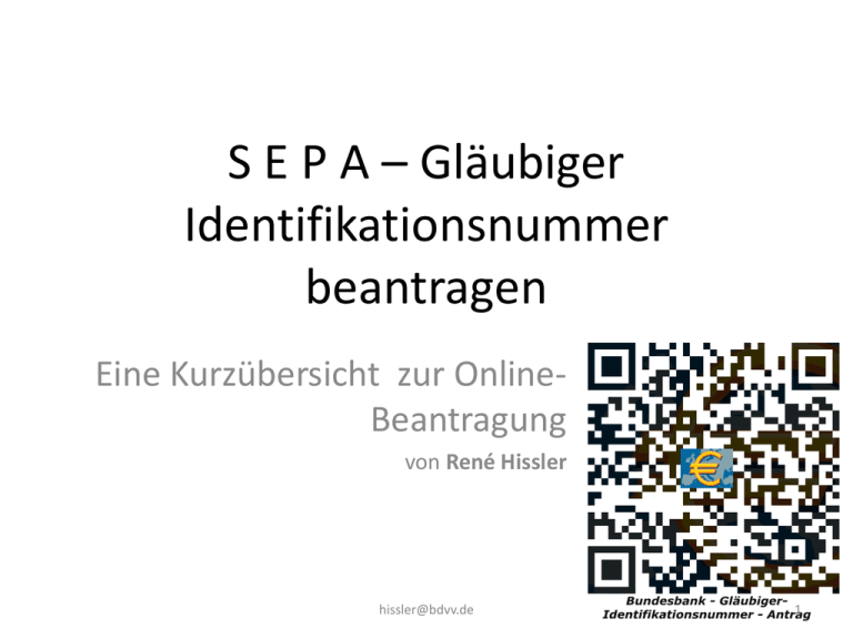 S E P A – Gläubiger Identifikationsnummer beantragen Eine Kurzübersicht zur OnlineBeantragung von René Hissler [email protected] 1 SEPA [email protected] 2 SEPA – Bundesbank.de [email protected] 3 SEPA – Bundesbank.de [email protected] 4 SEPA – Bundesbank.de [email protected] 5 SEPA – Bundesbank.de [email protected] 6 Eingabefelder – bundesbank.de [email protected] 7 Bestätigung Bundesbank [email protected] 8 Bestätigungsnachricht [email protected] 9 Gläubiger I D – nur per eMail [email protected] 10 Gläubiger - Identifikationsnummer Z Z Z zur eigenen Ergänzung nach Abteilungen / Sparten einheitlich festlegen [email protected] 11 Weiter Hinweise zu SEPA [email protected] 12 Arbeitsblätter anlegen [email protected] 13 IBAN Nummer Die alte Kontonummer ist für SEPA nicht geeignet. Nur mit der IBAN (internationalen Kontonummer) und der BIC können Überweisungen durchgeführt werden. Zu ermitteln sind diese sehr einfach –onlineüber den IBAN-Rechner http://www.iban-rechner.de [email protected] 14 Überblick über die Aufgaben Aktivitäten Verantwortung Bemerkungen 1 Gläubiger ID Bundesbank Nur online möglich 2 Gläubiger ID Stammbaum anlegen Verein 3 Stellen - ZZZ alpha/nummerisch vereinsintern 3 Mandatsnummern vergeben Verein alpha/nummerisch vereinsintern – bis 35 Zeichen ohne Umlaute/Leerzeichen Empfehlung: Mitgliedsname mit Kontrollnummer 4 SEPA – Basis – Lastschriftmandat SEPA – Firmen-Lastschrift Verein Vordrucke erstellen CORE / B2B 5 Mandate einholen Verein „alte Vollmachten“ behalten ihre Gültigkeit 6 Vorabankündigungen Pre-Notification (PN) Verein – Fristen beachten Schriftwechsel mit Formvorschriften 7 Beitragseinzug nur noch ohne Belege Verein Neues XML-Format 8 IBAN Nr aller Beteiligten ermitteln Verein/Mitglied http://www.iban-rechner.de 9 Mitgliederinformation vor jedem Einzug Verein Textform 10 Archivierung der Mandate Verein Finanzplanung 13 Monate Rückbelastung möglich 15 Zeichenlänge - Platzhalter 1 2 3 4 5 6 7 8 9 1 1 1 1 1 1 1 1 1 1 2 2 2 2 2 2 2 2 2 2 3 3 3 3 3 3 0 1 2 3 4 5 6 7 8 9 0 1 2 3 4 5 6 7 8 9 0 1 2 3 4 5 IBAN DE _ _ G-ID DE 9 8 Z Z Z 0 9 9 9 9 9 9 9 9 9 9 Mand atsNr K l n a m e n o V e r e i n a r Bankleitzahl 0 0 Kontonummer Die IBAN, (Internationale Bank Account Number) hat 22 Zeichen. Die alte Kontonummer von hinten beginnend eintragen, von vorne die Länderkennung 2 Zeichen, die BankNr 2 Zeichen, die Lücke mit Nullen auffüllen. Der Aufbau der Gläubiger-Identifikationsnummer ist SEPA-weit einheitlich. ISOLändercode, zweistellige Prüfziffer, der Geschäftsbereichskennung (Creditor Business Code) und einem nationalen Identifikationsmerkmal, das in der Länge variieren kann, maximal 28 Stellen. In Deutschland sind es 18 Stellen. Die Stellen 5-7 können beliebig mit alphanumerischen Zeichen versehen werden. Die 8.Stelle wird b.a.w. mit 0 belegt. Für Testzwecke steht diese Test-Gläubiger-Identifikationsnummer zur Verfügung. 16 Mustertext - Anschreiben Persönlicher Brief an die Mitglieder Musterbeispiel Ab dem 1.1.2014 stellen wir auf das europaweit einheitliche SEPA-Basis-Lastschriftverfahren um. Die von Ihnen erteilte Einzugsermächtigung wird dabei als SEPA Lastschriftmandat weitergenutzt, ohne dass Sie tätig werden müssen. Das Lastschriftmandat enthält zusätzliche Angaben. Es wird durch die Mandatsreferenz Nummer (Mitgliedsname und Kontrollnummer) und unsere Gläubiger – Identifikationsnummer gekennzeichnet. Vorteil der Klarnamensnennung: der Kunde/das Mitglied erkennt sich im Abbuchungstext. Für die Mandatskennung sind 35 Zeichen moeglich: Diese Kennzeichen werden künftig von uns bei allen Lastschrifteinzügen angegeben. Die erste Abbuchung nach dem SEPA Verfahren erfolgt am 4. Arbeitstag im Jahr 2014. Tag der Abbuchung angeben Sofern die folgenden Angaben von Ihrem Konto stimmen, werden die Lastschriften weiterhin von dort eingezogen. IBAN DE74100500000001234567; BIC GENODE51LOS IBAN Nr Mitgliedskonto SilviavonPokrowsky9231026 Eigene Gläubiger-ID DE29 ZZZ 00000025346 Keine Umlaute und Sonderzeichen Bei Änderungen werden wir Sie spätestens 5 Tage vor der Abbuchung informieren. 17 Wir helfen weiter: Akademie des bdvv: https://www.edudip.com/academy/bdvv bundesverband deutscher vereine und verbände e.v. [email protected] Telefon: 0 68 72 9 22 30 http://www.bdvv.de [email protected] [email protected] 18