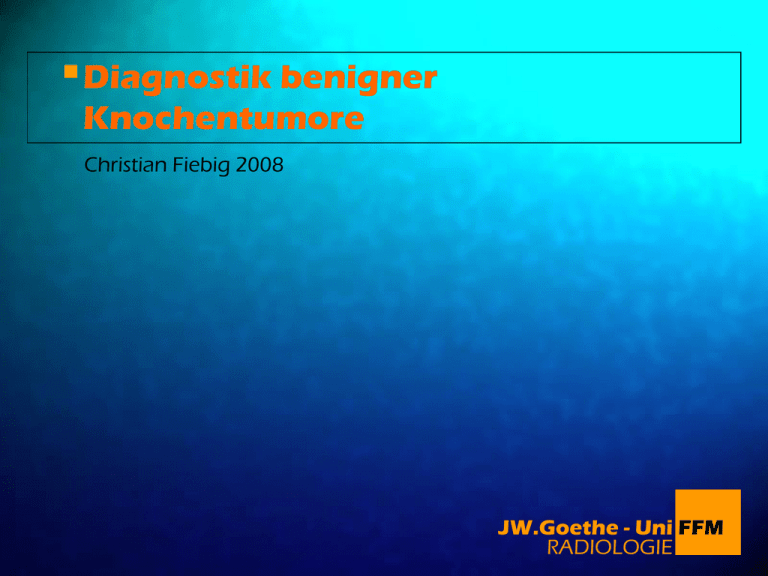 Diagnostik benigner Knochentumore Christian Fiebig 2008 JW.Goethe - Uni FFM RADIOLOGIE Diagnostik benigner Knochentumore Allgemeines Knochentumore sind selten Frühe Diagnose, hauptsächlich im konventionellen Röntgenbild ist entscheidend für die Therapie Sehr oft Jugendliche betroffen Interdisziplinäre Zusammenarbeit erforderlich (Orthopädie, Radiologie, Onkologie) JW.Goethe - Uni FFM RADIOLOGIE Diagnostik benigner Knochentumore Allgemeines Lodwick-Klassifizierung Geografische Einteilung der Osteolysen: Randsklerose? Kompaktabeteiligung? Mottenfraß? JW.Goethe - Uni FFM RADIOLOGIE Diagnostik benigner Knochentumore Allgemeines Lodwick-Klassifizierung Typ-IA: Randsklerose, Kortikalis intakt Typ-II: Mottenfraßartiges Erscheinungsbild Typ-IB: Keine Randsklerose, Kortikalis intakt Typ-III: Permeatives Erscheinungsbild Typ-IC: Unscharf begrenzt, Kortikalis destruiert JW.Goethe - Uni FFM RADIOLOGIE Diagnostik benigner Knochentumore Allgemeines Lodwick-Klassifizierung Erscheinungsbild am kompakten Knochen: Typ-II: Mottenfraßartig Typ-III: Permeativ JW.Goethe - Uni FFM RADIOLOGIE Diagnostik benigner Knochentumore Allgemeines Enneking-Klassifizierung Entsprechend des Wachtstumscharakters in 3 Stadien: St 1: Latente Läsion Intrakapsuläre Tumore, Größe stagniert in Kindheit St 2: Aktive Läsionen Wachstum nicht selbstlimitierend Sklerotische Pseudokapsel (inkl. Kortikalis) intakt St 3: Aggressiv wachsende Läsionen Penetration der Pseudokapsel Infiltration von Nachbarstrukturen möglich (benigne?) Tumorsatelliten in reaktiver Zone möglich JW.Goethe - Uni FFM RADIOLOGIE Diagnostik benigner Knochentumore Allgemeines Beurteilungskriterien Alter des Patienten Lokalisation der Läsion am Skelett Lokalisation im (Röhren-) Knochen Medullär, kortikal, periostal Konfiguration und Binnenstruktur (Matrix) JW.Goethe - Uni FFM RADIOLOGIE Diagnostik benigner Knochentumore Spezielle Tumore Nicht ossifizierendes Fibrom (Fibröser Kortikalisdefekt) Osteochondrom Enchondrom Osteoklastom Osteoidosteom Tumorähnliche Läsionen: Myelitiden, Zysten JW.Goethe - Uni FFM RADIOLOGIE Diagnostik benigner Knochentumore Spezielle Tumore Nicht ossifizierendes Fibrom (NOF) Fibröser Kortikalisdefekt <4 cm Tritt ab 3 Jahren auf Ist durchschnittlich 7 J. sichtbar Vorwiegend an den unt. Extr. Kontakt zur Kortikalis Girlandenartige Randstruktur Deutliche Randsklerose Heilen meist spontan aus Keine Nuklidanreicherung JW.Goethe - Uni FFM RADIOLOGIE Diagnostik benigner Knochentumore Spezielle Tumore Osteochondrom Auch kartilaginäre Exostose Patientenalter unter 20 Jahre Ossäre Wölbung / Knorpelkappe Pilzförmig an Röhrenknochen Breit- / Schmalbasig Femur, Humerus, Tibia, Ilium Maligne Entartung in 6% Malignität durch Mehrspeicherung in Szint. JW.Goethe - Uni FFM RADIOLOGIE Diagnostik benigner Knochentumore Spezielle Tumore Enchondrom Vom Mark ausgehend Meist in kurzen, tubulären Knochen Zwischen 10. und 30. Lebensjahr Scharf begrenzte Osteolyse Verdünnter, vorgewölbter Kortikalis Zentrale Verkalkung möglich Entartung in ein Sarkom möglich Maffucci-Syndrom, wenn mult. Enchondrome mit WT-Hämang. auftreten JW.Goethe - Uni FFM RADIOLOGIE Diagnostik benigner Knochentumore Spezielle Tumore Enchondrom MRT: T1 SE Coronar MRT: T1 SE FS KM MRT: TIRM Coronar JW.Goethe - Uni FFM RADIOLOGIE Diagnostik benigner Knochentumore Spezielle Tumore Osteoklastom Auch Riesenzell-TU (versch. Arten) Tritt zwischen 20. und 40 J. auf Meist epiphysäre Lokalisation Lokal aggressives Wachstum Bis an die subchondrale Lamelle „Semimaligne“ durch hohe Entartungsrate, Metastasen Rezidive in 10-15% JW.Goethe - Uni FFM RADIOLOGIE Diagnostik benigner Knochentumore Spezielle Tumore Osteoidosteom 10% aller benignen oss. Tumore Meist zwischen 5. und 25. Lj. Tibia, Femur, dorsale WK-Anteile Typischer zentraler Nidus als Zeichen der hypervask. Osteolyse Periphere reaktive Sklerose Umschriebene Anreicherung in Szintigrafie „Großer Bruder“: Osteoblastom JW.Goethe - Uni FFM RADIOLOGIE Diagnostik benigner Knochentumore Spezielle Tumore Osteoidosteom CT ergänzt natives Röntgen MRT kann irreführend sein, da das Begleitödem Aggressivität vortäuschen kann JW.Goethe - Uni FFM RADIOLOGIE Diagnostik benigner Knochentumore Tumorähnliche Läsionen Akute Osteomyelitis Chronische Osteomyelitis Knochenzysten JW.Goethe - Uni FFM RADIOLOGIE Diagnostik benigner Knochentumore Tumorähnliche Läsionen Akute Osteomyelitis Def.: Knocheninfekt <6 Wochen Unspezifischer Erregernachweis Rö.: eventuell negativ in Frühphase, diskrete Osteolyse, Periostreaktion MRT: Signalminderung in T1, Signalanhebung in T2 (FS) durch das Ödem CT: Dichteanhebung, eventuell permeative Veränderungen, Periostreaktion JW.Goethe - Uni FFM RADIOLOGIE Diagnostik benigner Knochentumore Tumorähnliche Läsionen Chronische Osteomyelitis Def.: Knocheninfekt >6 Wochen Brodie-Abszess zeigt epiphysäre Lyse mit perifokaler Sklerose Im Verlauf deutliche ossäre Destruktion JW.Goethe - Uni FFM RADIOLOGIE Diagnostik benigner Knochentumore Tumorähnliche Läsionen Chronische Osteomyelitis MRT schließt die Osteomyelitis aus! JW.Goethe - Uni FFM RADIOLOGIE Diagnostik benigner Knochentumore Tumorähnliche Läsionen Juvenile Knochenzyste Zentrales, expansives Wachstum in der Metaphyse In 80% jünger als 20 Jahre, m > f Scharf begrenzte Osteolyse mit verdünnter Kortikalis Pseudosepten JW.Goethe - Uni FFM RADIOLOGIE Diagnostik benigner Knochentumore Tumorähnliche Läsionen Aneurysmatische Knochenzyste Exzentrisches, expansives Wachstum in der Metaphyse In 80% jünger als 20 Jahre, m = f Scharf begrenzte Osteolyse mit verdünnter Kortikalis, kolbig Multizystisches Bild Periostschalen JW.Goethe - Uni FFM RADIOLOGIE Diagnostik benigner Knochentumore Tumorähnliche Läsionen Aneurysmatische Knochenzyste MRT: T1 MRT: T2 FS JW.Goethe - Uni FFM RADIOLOGIE Diagnostik benigner Knochentumore Herzlichen Dank an COX – OPEN SOURCE X-RAY GALLERY http://cox-radiology.org …und vielen Anderen! ENDE JW.Goethe - 