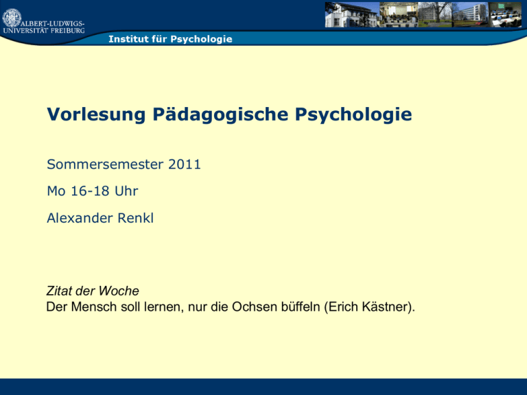Vorlesung Pädagogische Psychologie Sommersemester 2011 Mo 16-18 Uhr Alexander Renkl Zitat der Woche Der Mensch soll lernen, nur die Ochsen büffeln (Erich Kästner). Für einen "Anfänger": Links oder rechts? Warum? Winkel Winkel Winkel Winkel = 45° = 55° =? = 180° – Winkel – Winkel = 180° – 55° - 45° = 80° Winkel = Winkel = 80° Vorlesung Pädagogische Psychologie - Renkl 2 Effekt des integrierten Formats Winkel Winkel Winkel Winkel = 45° = 55° =? = 180° – Winkel – Winkel = 180° – 55° - 45° = 80° Winkel = Winkel = 80° Vorlesung Pädagogische Psychologie - Renkl 3 Vorlesung Pädagogische Psychologie - Renkl 4 Vorlesung Pädagogische Psychologie - Renkl 5 Für einen Anfänger: Welcher Aufgabentyp besser? Warum? Typ A Typ B Finde, was du kannst! Finde ! 280 17.2m Vorlesung Pädagogische Psychologie - Renkl 280 17.2m 6 Der Effekt des unspezifischen Ziels Typ A Typ B Finde, was du kannst! Finde ! 280 17.2m Vorlesung Pädagogische Psychologie - Renkl 280 17.2m 7 Was sollte das exemplifizieren? Sie sollen lernen, - … Dinge anders zu sehen (vorstehende Beispiele widersprechen der Intuition vieler, in jedem Fall aber der gängigen Praxis) - … auf Dinge durch die Brille von Theorie und/oder empirischer Befundlage zu blicken. - … informierte Entscheidungen treffen können. Vorlesung Pädagogische Psychologie - Renkl 8 Chancen: Absolventenbefragung von Schneller & Schneider (2005) • Anzahl beschäftigter (obere Kurve) und arbeitsloser (untere Kurve) Psychologen Vorlesung Pädagogische Psychologie - Renkl 9 Chancen: Wichtige Felder gesellschaftlicher Diskussion Gesundheit Arbeit Bildung Vorlesung Pädagogische Psychologie - Renkl 10 Hauptfelder der Pädagogischen Psychologie Bände der "Enzyklopädie der Psychologie" 1 Psychologie der Erziehung und Sozialisation 2 Psychologie des Lernens und der Instruktion 3 Psychologie des Unterrichts und der Schule 4 Psychologie der Erwachsenenbildung Vorlesung Pädagogische Psychologie - Renkl 11 Berufsfelder • Forschung & Lehre – Universitäten, Pädagogische Hochschulen, Fachhochschulen (Psychologie und Erziehungswissenschaft) – Forschungsinstitute: z.B. Institute der Leibniz-Gemeinschaft • Institut für die Pädagogik der Naturwissenschaften (IPN) • Institut für Wissensmedien (IWM) • Deutsches Institut für Internationale Pädagogische Forschung (DIPF) – Große Förderprogramme, z.B. "Rahmenprogramm zur Förderung der empirischen Bildungsforschung" des Bundesministeriums für Bildung und Forschung – Externe und innerbetriebliche Aus- und Weiterbildung, Wissensmanagement • Lernsoftwareentwicklung, Usability • Schulämter, Bildungsberatungsstellen, Ministerien Vorlesung Pädagogische Psychologie - Renkl 12 Chancen: Absolventenbefragung von Schneider & Roebers (2000) • 80% aller Studierender mit Schwerpunkt Pädagogische Psychologie hatten innerhalb eines Jahres Arbeitsstelle als Psychologe/Psychologin • Durchschnittliche Arbeitssuche: 4 Monate • In 72% der Fälle entsprach die Tätigkeit den Erwartungen • 57% arbeiteten im pädagogisch-psychologischen Bereich (Vergleich: Schwerpunkt klinische Psychologie 62%) Vorlesung Pädagogische Psychologie - Renkl 13 Themenübersicht 02.05. Einführung Sechs Dogmen: Behauptungen – Gegenpositionen 09.05. Das Konstruktivismus- und Aktivitäts-Dogma 16.05. Wichtige Lernarten I (Lernen aus Text, kooperatives Lernen) 23.05. Das Situiertheits-Dogma 30.05. Das Dogma des guten Unterrichts 06.06. Das Lernen lernen-Dogma 20.06. Das Strukturreformdogma 27.06. Das Mediendogma Ausgewählte Themen 04.07. Wichtige Lernarten II (Lernen durch Tun, "Inquiry Learing") 11.07. Lernmotivation 18.07. Lernschwierigkeiten in der Schule 25.07. Schulpsychologie (voraussichtlich: Frau Dr. Frauke Meinders-Lücking) 01.08. Klausur (voraussichtlich) Vorlesung Pädagogische Psychologie - Renkl 14 "Formales" • Anforderungen – 75-minütige Klausur - Grundlage: Vorlesungsstoff & Literatur ("Vereinigungsmenge") – Beispielklausur siehe unten • Vorlesungsfolien – sind jeweils bis 10 Uhr (vor der Vorlesung) im Internet http://portal.unifreiburg.de/psychologie/studium.lehre/bachelor/skripte/VLPaedag ogischePsySS11 - Literatur auch dort, aber … • Vergleichsweise enger Bezug zu Seminar Vorlesung Pädagogische Psychologie - Renkl 15 Primäre Lernziele der Vorlesung Unterschiedliche theoretische Perspektiven (Paradigmen) in der Pädagogischen Psychologie kennen Dogmen in der Diskussion um Lehren und Lehren erkennen und entkräften können Den "wahren Kern" der Dogmen kennen Kenntnis grundlegender Lernmethoden und instruktionaler Konzepte und Modelle Kenntnis wichtiger Lernprobleme "Sie können immer und überall 'Unsinn' erkennen" Informierte Entscheidungen! Vorlesung Pädagogische Psychologie - Renkl 16 Was kommt heue noch? - Um welches Lernen geht es in der Pädagogischen Psychologie? - Drei grundlegende theoretische Perspektiven - Vorstellung: "Angebot für 'Freiwillige': Weg vom Faktenlernen" Vorlesung Pädagogische Psychologie - Renkl 17 Um welches Lernen geht es? Fokus: Bedeutungshaltiges Lernen - Deklaratives Wissen - Kognitive Fertigkeiten (konzeptuell-basiert) - Automatisierte Fertigkeiten als "Platzmacher" für Komplexeres Besonders relevante Kriterien: - Verstehen - Anwendung - Transfer Vorlesung Pädagogische Psychologie - Renkl 18 Weniger geht es um Lernen im Sinne… … motorischer Fertigkeiten … nicht konzeptuell-basierter Fertigkeiten … der Konditionierung (z.B. emotionaler Reaktionen) … impliziter Erwerb von Einstellung, Werthaltung etc. … biologisch primäre Fähigkeiten nach Geary (z.B. Erstsprache) Vorlesung Pädagogische Psychologie - Renkl 19 Biologisch primäre und sekundäre Fähigkeiten nach Geary Biologisch primäre Fähigkeiten - Evolutionsbasierte Funktionen mit Selektionsvorteil - Beruht auf spezialisierten angeborenen neurobiologischen Systemen - "Leichtes" Lernen Biologisch sekundäre Fähigkeiten - Kulturelle, statt evolutionsbasierte Funktion - 