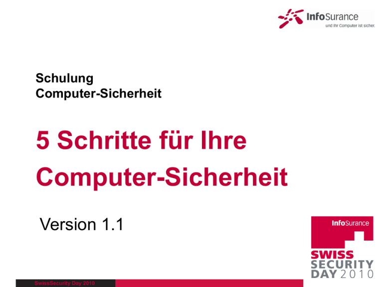 Schulung Computer-Sicherheit 5 Schritte für Ihre Computer-Sicherheit Version 1.1 SwissSecurity Day 2010 Agenda Einführung Vorstellung der InfoSurance und des SwissSecurityDay Informationsteil • • • • Bedrohungen für den Computer 5 Schritte für Ihre Computer-Sicherheit Was tun wenn? Fragen und Antworten Option Praxisteil Demonstration der wichtigsten sicherheitsrelevanten Programme mittels Beispielen. SwissSecurity Day 2010 Seite 2 InfoSurance und SwissSecurityDay • InfoSurance (www.infosurance.ch) • ist ein gemeinnütziger Verein mit Firmen- und Einzelmitgliedern • fördert die Informationssicherheit bei Endbenutzer/innen und KMU • SwissSecurityDay (www.swisssecurityday.ch) • ist eine schweizweite Informationskampagne, welche die Bürgerinnen und Bürger zum Thema Informationssicherheit aufmerksam macht. • findet am 10. März 2010 zum fünften Mal gemeinsam mit folgenden Partnern statt: SwissSecurity Day 2010 Seite 3 Computer werden immer persönlicher • Der PC speichert heute Ihre… • kostbaren Erinnerungen • Rechnungen • Steuererklärung • Arbeit, Manuskripte, Bilder, Kompositionen, Notizen… • Briefe • E-Mails • Sind diese Daten sicher? Quelle: www.karriere.de Quelle: www.rechnungsprofi.de Quelle: www.spambook.de Quelle: www.wdr.de SwissSecurity Day 2010 Seite 4 Malware • Computerprogramme mit schädlichen Funktionen • Arten von Malware: SwissSecurity Day 2010 Seite 5 Viren und Würmer • Viren und Würmer… • sind Programme, die z.B. Ihre Arbeiten, Urlaubsfotos, Steuererklärungen, Rechnungen usw. löschen können • können auch weltweite Netzwerke lahm legen • werden oft unbewusst durch unvorsichtiges Verhalten im Internet „hereingelassen“ – z. B. durch E-Mail-Anhang • Verbreitung der Viren und Würmer: • Viren verbreiten sich und schaden, wenn Sie Ihnen den Zugriff auf Ihren Rechner nicht verbieten. • Würmer sind auf die selbstständige Verbreitung in Netzwerken ausgerichtet SwissSecurity Day 2010 Seite 6 Viren und Würmer: Ausbreitung des Witty Worm 2004 SwissSecurity Day 2010 Seite 7 Trojanische Pferde (Trojaner) • Schadprogramm, welches als harmlose Anwendung getarnt • Im Hintergrund laufen ohne Wissen des Benutzenden andere Funktionen ab: • Aufzeichnen von Passwörtern • Daten verändern oder löschen • Abhören (Mikrofon / Webcam) • … Quelle: blueroof.files.wordpress.com SwissSecurity Day 2010 Seite 8 Aktuelles Beispiel: Wurm & Trojaner Quelle: Google News (04.12.2008) SwissSecurity Day 2010 Seite 9 Spyware und Adware • Spyware: • Programme, die Ihr Verhalten ausspionieren z. B. Kaufentscheide, Surf-Verhalten und an Dritte weiterleiten • Adware: • Heimliche Installation unerwünschter Werbung • Einrichtung unerwünschter Favoriten • Falschmeldungen an den User Ziel: Sie sollen dazu bewegt werden, ausgewählte Webseiten zu benutzen. • Marketing-Instrument Quelle: www.murekkep.org SwissSecurity Day 2010 Seite 10 Aktuell: Spyware und Adware SwissSecurity Day 2010 Seite 11 Phishing (Aushorchen von Benutzername und Passwort • Verbreitung per E-Mail • Bezug auf eine bekannte Unternehmung Quelle: www.volstate.net • Hinweis auf angeblich unmittelbar bevorstehender Schaden (z.B. Kontosperrung) • Aufforderung zur Verwendung der „Webseite“ der Unternehmung mittels eines anklickbaren Pfades (Link). • Notwendigkeit der Eingabe von persönlichen Daten (Benutzername und Passwort). • Link und Webseite scheinen zur Unternehmung zu gehören sind aber gefälscht und gehören dem Angreifer • Angreifer missbraucht die persönlichen Daten des Betroffenen SwissSecurity Day 2010 Seite 12 Beispiel Phishing Mail WebSeite E-MAIL SwissSecurity Day 2010 Seite 13 Drive by Infection • Infizierung des Computers durch Malware lediglich durch das Besuchen einer Webseite • Webseite von Angreifer modifiziert • Über aktive Elemente der Webseite (Skripts) wird Malware auf dem Benutzer-PC installiert • Auch „Offizielle“ von bekannten Organisationen sind betroffen Quelle: www.disog.org Infiziert den Stormworm SwissSecurity Day 2010 Seite 14 Animationsfilm über Gefahren im Internet Viren, Würmer und Bots SwissSecurity Day 2010 Seite 15 5 SCHRITTE FÜR IHRE COMPUTER-SICHERHEIT SwissSecurity Day 2010 Seite 16 Schritt 1: sichern Sichern Sie Ihre Daten regelmässig mit einer Datensicherung (Backup) und Sie sind gegen einen Datenverlust gewappnet. SwissSecurity Day 2010 Seite 17 Schritt 2: schützen Schützen Sie Ihren Computer vor Viren, Würmern und Trojanern mit einem aktuellen Virenschutzprogramm. SwissSecurity Day 2010 Seite 18 Schritt 3: überwachen Überwachen Sie die Verbindung zum Internet mit einer Firewall, damit niemand auf Ihren Computer zugreifen kann. SwissSecurity Day 2010 Seite 19 Schritt 4: vorbeugen Beugen Sie vor mit den aktuellsten Software-Updates und schliessen Sie die Sicherheitslücken auf Ihrem Computer. SwissSecurity Day 2010 Seite 20 Schritt 5: aufpassen Aufpassen, auch im Internet. • Gesunder Menschenverstand • Vernünftiges Misstrauen • Vorsichtiger Umgang mit persönlichen Daten Das Internet vergisst nichts! SwissSecurity Day 2010 Seite 21 Was tun wenn? SwissSecurity Day 2010 Seite 22 Was tun Sie bei einem Virenbefall? • Lesen Sie die angezeigten Meldungen genau. • Versuchen Sie den Virus mit dem Antiviren-Programm zu entfernen. • Folgen Sie der Anleitung des Herstellers Ihres AntivirenProgramms zur Virenbekämpfung. • Sichern Sie Ihre Dateien mit einer weiteren Datensicherung. ACHTUNG: Unter keinen Umständen eine alte Datensicherung überschreiben, sie könnte noch nützlich sein!! • Fragen Sie einen Spezialisten um Unterstützung an. SwissSecurity Day 2010 Seite 23 Seien Sie misstrauisch! • Sie wissen nicht, ob Ihre Kollegin tatsächlich das spezielle E-Mail geschickt hat? Prüfen Sie nach und rufen Sie an! • Sie wissen nicht, ob Ihre Bank, die Post oder Ihr Kreditkarteninstitut tatsächlich dieses E-Mail gesendet hat? Rufen Sie an und fragen 