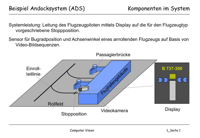 Beispiel Andocksystem (ADS) Komponenten im System Systemleistung: Leitung des Flugzeugpiloten mittels Display auf die für den Flugzeugtyp vorgeschriebene Stoppposition. Sensor für Bugradposition und Achsenwinkel eines anrollenden Flugzeugs auf Basis von Video-Bildsequenzen. Passagierbrücke Einrollleitlinie B 737-300 Rollfeld Stopposition Computer Vision Videokamera Display 1_Seite 1 ADS im Flughafen-Informationssystem Komponenten im System Tower Touchdownzeit, Flugzeugtyp, Flugnummer Vorfeldkontrolle Leitsystem Gate-Nr, Gateankunft (Soll), Flugzeugtyp, Flugnummer Gate Gateankunftzeit (ist), Stopposition Videoauswertung Regler: Display Typ Lage ADS Flugzeugmodell Status, Position, Winkel, Zeit Computer Vision 1_Seite 2 ADS: Systemanforderungen Komponenten im System Videoauswertung Regler: Display Typ Lage ADS Flugzeugmodell Status, Position, Winkel, Zeit ● Sensor: CCD-Videokamera im PAL-Format (576x768 Pixel) ● Hardware / Platform: Standard-PC-System / Betriebssystem Windows NT ● Messfrequenz: mindestens 12 Hz ● Messgenauigkeit: Bugradposition +/- 0,2 m, Winkel Flugzeugachse/Leitlinie +/- 2° ● Operationelle Anforderungen: Fehltyperkennung, Pushbackerkennung, MultiLeitlinienfähigkeit ● Beleuchtung: Tageslicht, Flutlicht, Allwetterfähigkeit bis Cat III Sichtbedingung Computer Vision 1_Seite 3 ADS: Messaufgabe Komponenten im System Die Messung erfolgt in zwei Schritten: 1. Bestimmung der Position des Flugzeugs im Bild. 2. Rückschluss auf die Position des Flugzeugs auf dem Rollfeld (im Raum): Objektpunkt auf der Bildebene, z.B. Triebwerksmitte y Bildebene z Szenenpunkt Sehstrahl Höhe der Triebwerksmitte über dem Boden Rollfeld(Boden) Voraussetzung: Die Abbildungseigenschaften der Kamera und die Orientierung zwischen Kamera und Boden ist bekannt. Computer Vision 1_Seite 4 Erinnerung: Kameramodell und -kalibrierung Begriffe Kamerakalibirierung (Eichung) = Ermittlung eines Parametersatzes, so dass das Kameramodell das Abbildungsverhalten der Kamera möglichst gut approximiert. Kameramodell = Mathematische Beschreibung (Approximation) des realen Abbildungsverhaltens des Sensors. z.B. Lochkamera: Die Transformation P : R³ R² ist durch 5 Parameter gegeben: f Brennweite (Abstand Ursprung Koordinatensystem und Bildebene) (cx, cy) Bildhauptpunkt (Durchstoßpunkt der z-Achse im Bild in Pixeln) dx / dy Breite / Höhe eines Pixels in der Einheit des Kamerakoordinatensystems f xc f yc i cx j cy d x zc d y zc Computer Vision 1_Seite 5 Kamerakalibrierung Begriffe Was wird für die Kamerakalibrierung benötigt? Marke 1 (2, 0, 0)T Marke 3 (4, 0, 0)T Marke 0 (0, 0, 0)T Marke 8 (0, 2, 0)T gemessen (soll) projiziert (ist) Kalibrierkörper und die IDs und Weltkoordinaten der Marken z.B. Schachbrettmuster Größe der Quadrate 2 cm Computer Vision Bild vom Kalibrierkörper und die Bildkoordinaten der Marken 1_Seite 6 Kamerakalibrierung Begriffe Bemerkungen zu den Kalibriermarken: ● Auch Landmarken kommen als Kalibriermarken in Frage (z.B. Markierungen auf dem Rollfeld von Flughäfen). ● Auch mit (ausreichend genauen) CAD-Modellen können Kameras kalibriert werden: Dann wird die Lageschätzung um die Kameraparameter erweitert. gemessen (soll) projiziert (ist) Computer Vision 1_Seite 7 Kamerakalibrierung Begriffe Bemerkungen: ● Standard für CCD-Kameras: Kalibrierung nach Roger Tsai (Lochkamerasystem plus radiale Verzeichnung) Radial verzeichnetes Schachbrettmuster (Fischauge) ● Die Kalibriermarken müssen alle relevanten Bereiche des Bildes abdecken. ● Eine echte 3D-Verteilung der Marken stabilisiert die Kalibrierung. ● Die Mindestanzahl an Kalibriermarken ist durch die Anzahl der zu bestimmenden Parameter gegeben (eine Marke liefert zwei Gleichungen!) Computer Vision 1_Seite 8 ADS: Kameramodell Komponenten im System Abbildungsmodell nach Roger Tsai (Lochkamera plus radiale Verzeichnung) Bringe Markierungen auf dem Boden an und ziehe ein Bild mit diesen Markierungen ein. Projiziere die Markierungen auf das Bild (rote Kreuze) Optimiere die Abbildungsparameter, so dass projizierte Markierungen und abgebildete Markierungen möglichst gut übereinstimmen. Computer Vision 1_Seite 9 ADS: Messaufgabe Komponenten im System Die Messung erfolgt in zwei Schritten: 1. Bestimmung der Position des Flugzeugs im Bild. 2. Rückschluss auf die Position des Flugzeugs auf dem Rollfeld (im Raum). Lösung hier: Suche bestimmte Objektpunkte im Bild durch Schablonenanpassung. Computer Vision 1_Seite 10 Kreuzkorrelation Komponenten im System Seien g und s zwei gleich große Bilder mit Breite B und Höhe H. Dann heißt B 1 H 1 g ( x, y ) s( x, y ) x 0 y 0 Korr( g , s ) B 1 H 1 2 B 1 H 1 2 g ( x, y ) s ( x, y ) x 0 y 0 x 0 y 0 Kreuzkorrelation von g und s. Computer Vision 1_Seite 11 Schablonenanpassung Komponenten im System ● Gegeben seien ein Bild g und eine Schablone s. ● Schiebe die Schablone s über das Bild g und berechne an jeder Bildpunktposition die Kreuzkorrelation. ● An der Position, an der die Schablone und das Bild am besten übereinstimmen, ist die Kreuzkorrelation am größten. Schablone s Kreuzkorrelationsbild Bild g Computer Vision 1_Seite 12 ADS: Objektmodell Komponenten im System Objektmodellierung: Modell aus Triebwerkseinlass, Frontscheibe, Hauptfahrwerk (in Form von Schablonen) und deren geometrischer Zusammenhang (Gitter) Schablonen, starres Gitter Centerline Stopposition Die Übereinstimmung des Modells mit dem Bild wird durch Schablonenanpassung (z.B. Korrelationskoeffizient) gemessen. Computer Vision 1_Seite 13 ADS: Suchvorgang im Fangbereich Komponenten im System Start Korrelationsverlauf beim Vorgang "Searching" für Sequenzen mit folgenden Merkmalen: Flugzeugtyp: 737; Kamera: color; Mittelwert-Template. Korrelationsverlauf für verschiedene Sequenzen Suchposition festlegen ce3 ce4 ce5 ce25 3D-Template an Suchposition transformieren ce24 Korrelationswert ce19 361 321 281 241 161 Sequenz 121 ce8 ce16 Bild-Nr. Bild-Nummer 81 ce12 ce6 ce17 Korr. berechnen für Umgebung um Suchpo