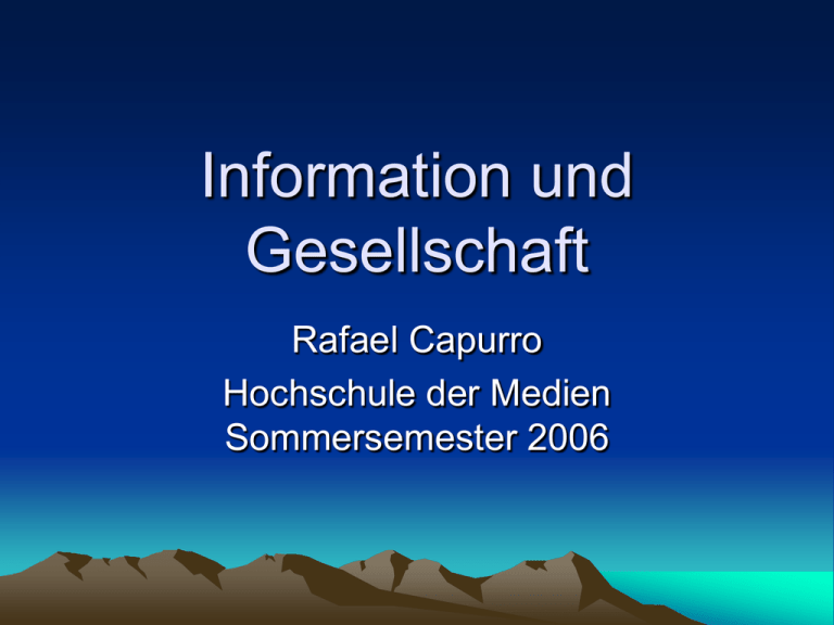 Information und Gesellschaft Rafael Capurro Hochschule der Medien Sommersemester 2006 Übersicht Einführung: Mediale (R-)Evolutionen I. Information – Wissen – Gesellschaft II. Informationsgesellschaft III. Informationspolitik R. Capurro: Vorlesung Information und Gesellschaft (2006) 2 Einführung: Mediale (R-)Evolutionen - Strukturwandel der medialen Öffentlichkeit - Kulturen mit vorwiegend mündlicher Tradition: Sokratische Öffentlichkeit; Plato und die Schrift; die Bibliothek des Aristoteles - Das Forum der „Leserwelt“: Kant und die Aufklärung - Die Funktion der politischen Öffentlichkeit und die Massenmedien: Habermas - Aufklärung im Cyberspace: Globalisierung, Privatheit, Inhaltsregulierung, allgemeiner Zugang R. Capurro: Vorlesung Information und Gesellschaft (2006) 3 I. Information – Wissen – Gesellschaft • „Die Bedeutung eines Wortes ist sein Gebrauch in der Sprache“ (L. Wittgenstein, Philos. Unters. 43): „Sprachspiele“ und „Lebensformen“ • Begriffsdefinitionen hängen von den Theorien, in denen die Begriffe eingebettet sind, ab R. Capurro: Vorlesung Information und Gesellschaft (2006) 4 I. Information – Wissen – Gesellschaft • Information: Wissensmitteilung, das mitgeteilte Wissen • Etymologie: lat. informare = bilden, durch Unterweisung Gestalt geben; gr. idea, morphé: Ontologie (formen) und Epistemologie (mitteilen) • In-formatio und Bildung • Information als interdisziplinärer Begriff R. Capurro: Vorlesung Information und Gesellschaft (2006) 5 I. Information – Wissen – Gesellschaft Das nachrichtentechnische Modell von Claude Shannon (1948): R. Capurro: Vorlesung Information und Gesellschaft (2006) 6 I. Information – Wissen – Gesellschaft • Ebene A: Wie genau können Zeichen bzw. Symbole übertragen werden? (technische Ebene) (Shannons Problem) • Ebene B: Wie präzis können Symbole die gewünschte Bedeutung übertragen? (semantische Ebene) • Ebene C: Wie effektiv wirkt die empfangene Bedeutung in der gewünschten Weise? (pragmatische Ebene) R. Capurro: Vorlesung Information und Gesellschaft (2006) 7 I. Information – Wissen – Gesellschaft Die vier Ebenen des Informationsbegriffs (Siehe: Wikipedia): • Codierung • Syntax • Semantik • Pragmatik R. Capurro: Vorlesung Information und Gesellschaft (2006) 8 I. Information – Wissen – Gesellschaft „ES IST WARM“ • Codierung: – 27 Buchstaben des Alphabets – ASCII-Code – Genetischer Code – Braille-Schrift – Binärcode… Wie häufig kommen die Zeichen vor? R. Capurro: Vorlesung Information und Gesellschaft (2006) 9 I. Information – Wissen – Gesellschaft • Syntax: – Information als Struktur, die es zu übermitteln gilt. – Grundprinzip der syntaktischen Information ist die Unterscheidbarkeit – Jede Stelle hat im Falle der 27 Buchstaben 27 mögliche „Zustände“ – Im Falle des Binärcodes müssen diese Zustände durch mehrere Bits dargestellt werden – genauer: durch fünf (= 32 Zustände bzw. 2 hoch 5) in der Art: A 00001; B 00010; C 00011; D 00100 … – „ES IST WARM“ = 00101 10011 11100 … R. Capurro: Vorlesung Information und Gesellschaft (2006) 10 I. Information – Wissen – Gesellschaft – Je nach der Wahrscheinlichkeit des Auftretens der Zeichen im Zeichenvorrat kann man die Anzahl der Ja/Nein (binären) Entscheidungen unterschiedlich groß machen: für häufige Zeichen benötigt man dann weniger Bits. – Selten auftretende Zeichen haben einen höheren Informationsgehalt. R. Capurro: Vorlesung Information und Gesellschaft (2006) 11 I. Information – Wissen – Gesellschaft • Semantik: – strukturierte, syntaktische Informationen werden erst durch die Interpretation verstehbar/verwertbar. – Dazu braucht man ein Bezugssystem: man muss „wissen“, was warm bedeutet. – In diesem Sinne lässt sich sagen, dass Information nicht „übertragen“ wird, sondern erst durch die Interpretation im Zusammenhang mit dem jeweiligen Bezugssystem „entsteht“. – Bezugssysteme können z.B. eine Gehirnzelle, das Gehirn als Ganzes, ein Lebewesen, eine Mensch, eine Institution …sein. R. Capurro: Vorlesung Information und Gesellschaft (2006) 12 I. Information – Wissen – Gesellschaft • Pragmatik: – die Information soll den Empfänger verändern – Information (als übertragenes Wissen) muss neu und relevant sein: z.B. man soll sich entsprechend anziehen… R. Capurro: Vorlesung Information und Gesellschaft (2006) 13 I. Information – Wissen – Gesellschaft • Zusammenfassung: – Information als Nachricht, Auskunft, Belehrung, Aufklärung (Alltagsbedeutung) – Information als Verringerung von Ungewissheit (Shannon) – Information als Wissensgewinn (Semantik) – Information als Mitteilung, die den Zustand des Empfängers verändert (Pragmatik) R. Capurro: Vorlesung Information und Gesellschaft (2006) 14 I. Information – Wissen – Gesellschaft • Information in der Informationswissenschaft (Siehe: Kuhlen A1) – Jenseits der Informationstheorie – Information als „surrogate of knowledge“ (Farradane), da Wissen eine interne kognitive Struktur des Menschen ist, die nicht direkt zugänglich ist – „Sprachspiele“: Das ist keine Information, das weiß ich schon R. Capurro: Vorlesung Information und Gesellschaft (2006) 15 I. Information – Wissen – Gesellschaft • Die DIKW-Hierarchie: – Daten -> Information -> Wissen (Knowledge) > Weisheit/Verstehen (Wisdom/understanding) – Vernetzungs-/Verstehensmodell nach Bellinger et al. • Understanding relations (relations) • Understanding patterns (knowledge) • Understanding principles (wisdom) R. Capurro: Vorlesung Information und Gesellschaft (2006) 16 R. Capurro: Vorlesung Information und Gesellschaft (2006) 17 I. Information – Wissen – Gesellschaft • Abweichend von der DIKWHierarchie/Pyramide wird die folgende Zuordnung der drei Grundbegriffe zu den semiotischen Ebenen so dargestellt: – Daten : syntaktisch – Wissen: semantisch – Info