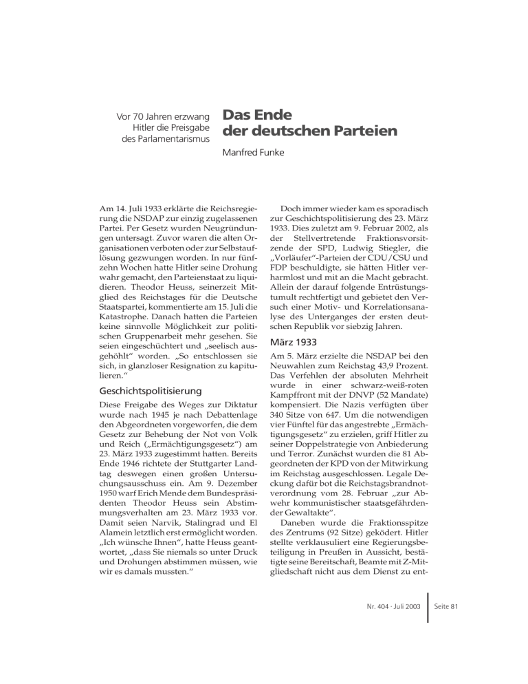 Vor 70 Jahren erzwang Hitler die Preisgabe des Parlamentarismus Das Ende der deutschen Parteien Manfred Funke Am 14. Juli 1933 erklärte die Reichsregierung die NSDAP zur einzig zugelassenen Partei. Per Gesetz wurden Neugründungen untersagt. Zuvor waren die alten Organisationen verboten oder zur Selbstauflösung gezwungen worden. In nur fünfzehn Wochen hatte Hitler seine Drohung wahr gemacht, den Parteienstaat zu liquidieren. Theodor Heuss, seinerzeit Mitglied des Reichstages für die Deutsche Staatspartei, kommentierte am 15. Juli die Katastrophe. Danach hatten die Parteien keine sinnvolle Möglichkeit zur politischen Gruppenarbeit mehr gesehen. Sie seien eingeschüchtert und „seelisch ausgehöhlt“ worden. „So entschlossen sie sich, in glanzloser Resignation zu kapitulieren.“ Geschichtspolitisierung Diese Freigabe des Weges zur Diktatur wurde nach 1945 je nach Debattenlage den Abgeordneten vorgeworfen, die dem Gesetz zur Behebung der Not von Volk und Reich („Ermächtigungsgesetz“) am 23. März 1933 zugestimmt hatten. Bereits Ende 1946 richtete der Stuttgarter Landtag deswegen einen großen Untersuchungsausschuss ein. Am 9. Dezember 1950 warf Erich Mende dem Bundespräsidenten Theodor Heuss sein Abstimmungsverhalten am 23. März 1933 vor. Damit seien Narvik, Stalingrad und El Alamein letztlich erst ermöglicht worden. „Ich wünsche Ihnen“, hatte Heuss geantwortet, „dass Sie niemals so unter Druck und Drohungen abstimmen müssen, wie wir es damals mussten.“ Doch immer wieder kam es sporadisch zur Geschichtspolitisierung des 23. März 1933. Dies zuletzt am 9. Februar 2002, als der Stellvertretende Fraktionsvorsitzende der SPD, Ludwig Stiegler, die „Vorläufer“-Parteien der CDU/CSU und FDP beschuldigte, sie hätten Hitler verharmlost und mit an die Macht gebracht. Allein der darauf folgende Entrüstungstumult rechtfertigt und gebietet den Versuch einer Motiv- und Korrelationsanalyse des Unterganges der ersten deutschen Republik vor siebzig Jahren. März 1933 Am 5. März erzielte die NSDAP bei den Neuwahlen zum Reichstag 43,9 Prozent. Das Verfehlen der absoluten Mehrheit wurde in einer schwarz-weiß-roten Kampffront mit der DNVP (52 Mandate) kompensiert. Die Nazis verfügten über 340 Sitze von 647. Um die notwendigen vier Fünftel für das angestrebte „Ermächtigungsgesetz“ zu erzielen, griff Hitler zu seiner Doppelstrategie von Anbiederung und Terror. Zunächst wurden die 81 Abgeordneten der KPD von der Mitwirkung im Reichstag ausgeschlossen. Legale Deckung dafür bot die Reichstagsbrandnotverordnung vom 28. Februar „zur Abwehr kommunistischer staatsgefährdender Gewaltakte“. Daneben wurde die Fraktionsspitze des Zentrums (92 Sitze) geködert. Hitler stellte verklausuliert eine Regierungsbeteiligung in Preußen in Aussicht, bestätigte seine Bereitschaft, Beamte mit Z-Mitgliedschaft nicht aus dem Dienst zu ent- Nr. 404 · Juli 2003 Seite 81 Manfred Funke lassen. Auch das Ausfertigungsrecht der Gesetze verbleibe beim Reichspräsidenten. Aus dessen Umgebung erreichten das Zentrum Signale von einer wohl nicht allzu langen Dauer des Ausnahmezustandes. Hitler selbst hatte diesen nur für vier Jahre gefordert beziehungsweise bis zur Bildung einer neuen Regierung. Unter den drei größten Parteien NSDAP, SPD und KPD bildete Hitler für die Kirchen immerhin das alleinige Bollwerk gegen den gottlosen Bolschewismus. Von dem Ergebnis seines Gesprächs mit Hitler am 22. März hatte Ludwig Kaas seiner Fraktion zudem berichten müssen, dass der Kanzler seine Ziele auch im Wege des Staatsnotstandes durchzusetzen gedenke. Einerseits die eigene „vollständige Führerlosigkeit“ (Franz Graf von Galen) beklagend, wollte man andererseits nicht der „Fortführung des nationalen Rettungswerks“ (Kaas) entgegenstehen. Ein drohender Bürgerkrieg, Massenelend und Problemstau rieten zur Hinnahme des Ermächtigungsgesetzes, gleichermaßen um im höchsten Risiko das Letzte zu vermeiden. Denn seit den November-Wahlen 1932 verfügten die beiden Revolutionsparteien KPD und NSDAP über die absolute Mehrheit im Reichstag. Sie konnten jedes Kabinett der Mitte zerquetschen und die Lähmung vor allem der notwendigsten wirtschaftlichen Hilfsmaßnahmen beliebig hintertreiben. So kam ein zerquältes Ja des Zentrums zum Ermächtigungsgesetz zu Stande. Das tapfere Nein der SPD zum Ermächtigungsgesetz vermochte die Zugriffswucht des neuen Regimes nicht abzufangen. Es sollte sich als drohendes Vorzeichen erweisen, als Hitler auf die von staatsmännischer Würde getragene Protestrede Otto Wels’ höhnisch antwortete, dass die Herren von der SPD „nicht mehr benötigt“ würden. Die übrigen kleinen Parteien, uneins mit sich, stimmten dem Ermächtigungs- Seite 82 Die politische Meinung gesetz letztlich zu. Sie suchten ihre inzwischen eingetretene Belanglosigkeit mit einem Ja abzuschirmen und die völlige Sprengung aller Gesetzlichkeit abzudämpfen. Dies schien jedenfalls die passabelste Notlösung zu sein, hatte Hitler doch am 23. März im Reichstag gedroht, dass er seine Gegner nicht bloß reizen würde, „statt sie entweder zu vernichten oder zu versöhnen“. Kapitulation der Parteien Die NS-Herrschaftspraxis machte sehr schnell klar, dass Versöhnung nur Unterwerfung heißen konnte. „Wir wollen einen neuen Menschen schaffen“, verkündete Hitler am 8. April 1933. Entsprechend hatten die alten Strukturen zu weichen oder sich der NSDAP zuzuordnen. Betroffen waren die Verbände, Organisationen und Institutionen der Beamten, Angestellten, Bauern, der Presse und des Rundfunks, der Schulen, Hochschulen und Akademien. Die Gewerkschaften mussten sich in die Deutsche Arbeitsfront wandeln. Jüdische und sozialistische Verbände wurden aufgelöst. Am 22. April beauftragte Hitler seinen Anwalt Hans Frank mit der Schaffung einer neuen Rechtsordnung. Sie lief auf die Monopolisierung der drei Gewalten hinaus. Der Staatsbürger als Rechtssubjekt wurde zum Volksgenossen ohne Klagerecht gegen die Will