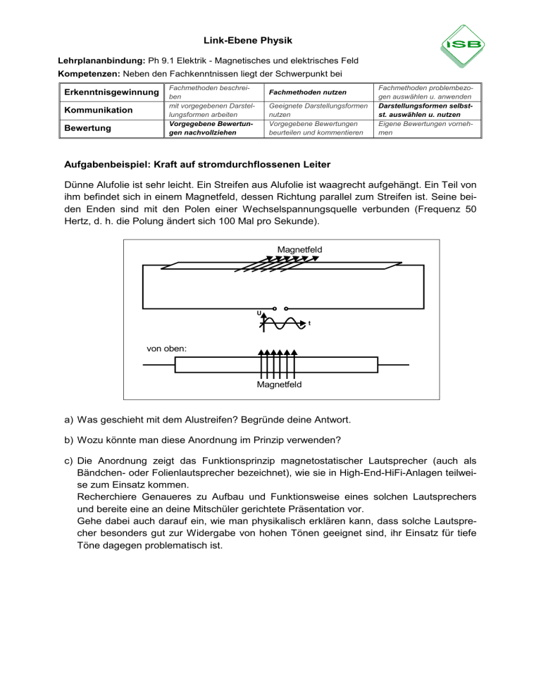 Link-Ebene Physik Lehrplananbindung: Ph 9.1 Elektrik - Magnetisches und elektrisches Feld Kompetenzen: Neben den Fachkenntnissen liegt der Schwerpunkt bei Erkenntnisgewinnung Kommunikation Bewertung Fachmethoden beschreiben mit vorgegebenen Darstellungsformen arbeiten Vorgegebene Bewertungen nachvollziehen Fachmethoden nutzen Geeignete Darstellungsformen nutzen Vorgegebene Bewertungen beurteilen und kommentieren Fachmethoden problembezogen auswählen u. anwenden Darstellungsformen selbstst. auswählen u. nutzen Eigene Bewertungen vornehmen Aufgabenbeispiel: Kraft auf stromdurchflossenen Leiter Dünne Alufolie ist sehr leicht. Ein Streifen aus Alufolie ist waagrecht aufgehängt. Ein Teil von ihm befindet sich in einem Magnetfeld, dessen Richtung parallel zum Streifen ist. Seine beiden Enden sind mit den Polen einer Wechselspannungsquelle verbunden (Frequenz 50 Hertz, d. h. die Polung ändert sich 100 Mal pro Sekunde). Magnetfeld U t von oben: Magnetfeld a) Was geschieht mit dem Alustreifen? Begründe deine Antwort. b) Wozu könnte man diese Anordnung im Prinzip verwenden? c) Die Anordnung zeigt das Funktionsprinzip magnetostatischer Lautsprecher (auch als Bändchen- oder Folienlautsprecher bezeichnet), wie sie in High-End-HiFi-Anlagen teilweise zum Einsatz kommen. Recherchiere Genaueres zu Aufbau und Funktionsweise eines solchen Lautsprechers und bereite eine an deine Mitschüler gerichtete Präsentation vor. Gehe dabei auch darauf ein, wie man physikalisch erklären kann, dass solche Lautsprecher besonders gut zur Widergabe von hohen Tönen geeignet sind, ihr Einsatz für tiefe Töne dagegen problematisch ist. Lösungen a) Es wirkt eine Kraft senkrecht zur Stromrichtung und zum Magnetfeld, also senkrecht zur Leiterfläche. Da sich die Stromrichtung periodisch umkehrt, wechselt auch die Kraft entsprechend ihre Richtung. Der Alustreifen bewegt sich hin und her. b) Die Anordnung wandelt ein elektrisches Signal in Bewegung um, d. h. sie kann als Lautsprecher verwendet werden. c) Individuelle Lösungen. Gute Eignung als Hochtöner: Hier muss auf heuristischer Ebene Wissen vorhanden sein, dass hohe Töne durch schnelle Schwingungen erzeugt werden, tiefe Töne durch langsamere Schwingungen. Ein sehr leichter Aluminiumstreifen kann solchen schnellen Tonsignalen gut folgen. Problem bei der Verwendung als Tieftöner (Bass): Zur Erzeugung entsprechend lauter tiefer Töne muss ein größeres Luftvolumen in Bewegung versetzt werden. Dafür ist ein magnetostatischer Lautsprecher nicht gut geeignet. Mindestens muss er eine ausreichend große Fläche haben.