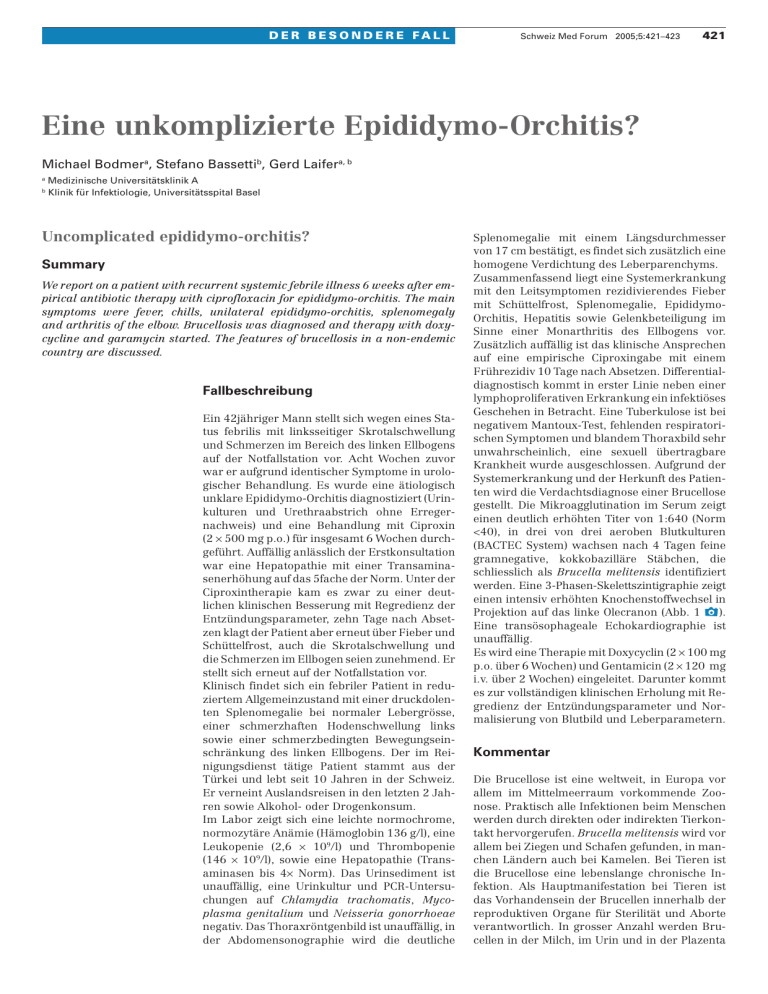 D E R B E S O N D E R E FA L L Schweiz Med Forum 2005;5:421–423 421 Eine unkomplizierte Epididymo-Orchitis? Michael Bodmera, Stefano Bassettib, Gerd Laifera, b a b Medizinische Universitätsklinik A Klinik für Infektiologie, Universitätsspital Basel Uncomplicated epididymo-orchitis? Summary We report on a patient with recurrent systemic febrile illness 6 weeks after empirical antibiotic therapy with ciprofloxacin for epididymo-orchitis. The main symptoms were fever, chills, unilateral epididymo-orchitis, splenomegaly and arthritis of the elbow. Brucellosis was diagnosed and therapy with doxycycline and garamycin started. The features of brucellosis in a non-endemic country are discussed. Fallbeschreibung Ein 42jähriger Mann stellt sich wegen eines Status febrilis mit linksseitiger Skrotalschwellung und Schmerzen im Bereich des linken Ellbogens auf der Notfallstation vor. Acht Wochen zuvor war er aufgrund identischer Symptome in urologischer Behandlung. Es wurde eine ätiologisch unklare Epididymo-Orchitis diagnostiziert (Urinkulturen und Urethraabstrich ohne Erregernachweis) und eine Behandlung mit Ciproxin (2 x 500 mg p.o.) für insgesamt 6 Wochen durchgeführt. Auffällig anlässlich der Erstkonsultation war eine Hepatopathie mit einer Transaminasenerhöhung auf das 5fache der Norm. Unter der Ciproxintherapie kam es zwar zu einer deutlichen klinischen Besserung mit Regredienz der Entzündungsparameter, zehn Tage nach Absetzen klagt der Patient aber erneut über Fieber und Schüttelfrost, auch die Skrotalschwellung und die Schmerzen im Ellbogen seien zunehmend. Er stellt sich erneut auf der Notfallstation vor. Klinisch findet sich ein febriler Patient in reduziertem Allgemeinzustand mit einer druckdolenten Splenomegalie bei normaler Lebergrösse, einer schmerzhaften Hodenschwellung links sowie einer schmerzbedingten Bewegungseinschränkung des linken Ellbogens. Der im Reinigungsdienst tätige Patient stammt aus der Türkei und lebt seit 10 Jahren in der Schweiz. Er verneint Auslandsreisen in den letzten 2 Jahren sowie Alkohol- oder Drogenkonsum. Im Labor zeigt sich eine leichte normochrome, normozytäre Anämie (Hämoglobin 136 g/l), eine Leukopenie (2,6 x 109/l) und Thrombopenie (146 x 109/l), sowie eine Hepatopathie (Transaminasen bis 4x Norm). Das Urinsediment ist unauffällig, eine Urinkultur und PCR-Untersuchungen auf Chlamydia trachomatis, Mycoplasma genitalium und Neisseria gonorrhoeae negativ. Das Thoraxröntgenbild ist unauffällig, in der Abdomensonographie wird die deutliche Splenomegalie mit einem Längsdurchmesser von 17 cm bestätigt, es findet sich zusätzlich eine homogene Verdichtung des Leberparenchyms. Zusammenfassend liegt eine Systemerkrankung mit den Leitsymptomen rezidivierendes Fieber mit Schüttelfrost, Splenomegalie, EpididymoOrchitis, Hepatitis sowie Gelenkbeteiligung im Sinne einer Monarthritis des Ellbogens vor. Zusätzlich auffällig ist das klinische Ansprechen auf eine empirische Ciproxingabe mit einem Frührezidiv 10 Tage nach Absetzen. Differentialdiagnostisch kommt in erster Linie neben einer lymphoproliferativen Erkrankung ein infektiöses Geschehen in Betracht. Eine Tuberkulose ist bei negativem Mantoux-Test, fehlenden respiratorischen Symptomen und blandem Thoraxbild sehr unwahrscheinlich, eine sexuell übertragbare Krankheit wurde ausgeschlossen. Aufgrund der Systemerkrankung und der Herkunft des Patienten wird die Verdachtsdiagnose einer Brucellose gestellt. Die Mikroagglutination im Serum zeigt einen deutlich erhöhten Titer von 1:640 (Norm <40), in drei von drei aeroben Blutkulturen (BACTEC System) wachsen nach 4 Tagen feine gramnegative, kokkobazilläre Stäbchen, die schliesslich als Brucella melitensis identifiziert werden. Eine 3-Phasen-Skelettszintigraphie zeigt einen intensiv erhöhten Knochenstoffwechsel in Projektion auf das linke Olecranon (Abb. 1 x). Eine transösophageale Echokardiographie ist unauffällig. Es wird eine Therapie mit Doxycyclin (2 x 100 mg p.o. über 6 Wochen) und Gentamicin (2 x 120 mg i.v. über 2 Wochen) eingeleitet. Darunter kommt es zur vollständigen klinischen Erholung mit Regredienz der Entzündungsparameter und Normalisierung von Blutbild und Leberparametern. Kommentar Die Brucellose ist eine weltweit, in Europa vor allem im Mittelmeerraum vorkommende Zoonose. Praktisch alle Infektionen beim Menschen werden durch direkten oder indirekten Tierkontakt hervorgerufen. Brucella melitensis wird vor allem bei Ziegen und Schafen gefunden, in manchen Ländern auch bei Kamelen. Bei Tieren ist die Brucellose eine lebenslange chronische Infektion. Als Hauptmanifestation bei Tieren ist das Vorhandensein der Brucellen innerhalb der reproduktiven Organe für Sterilität und Aborte verantwortlich. In grosser Anzahl werden Brucellen in der Milch, im Urin und in der Plazenta D E R B E S O N D E R E FA L L Abbildung 1. Drei-Phasen-Skelettszintigraphie mit 99mTc-DPD: Mineralstoffwechselphase mit intensiv erhöhtem Knochenstoffwechsel in Projektion auf das linke Olecranon. infizierter Tiere ausgeschieden. Die Übertragung auf den Menschen erfolgt entweder über direkten Tierkontakt via verletzte Haut oder infizierte Aerosole oder via Verzehr von unpasteurisierten Milchprodukten. Fleischprodukte kommen seltener in Frage, da sie selten roh gegessen werden und die Keimzahl im Muskelgewebe tief ist. Ganz vereinzelt wurde auch eine sexuelle Übertragung unter Menschen vermutet [1]. Gut dokumentiert sind Übertragungen (inklusive Miniepidemien) im Labor [2], wenn an Kulturplatten gerochen wird, eine übliche Praxis, die zur Keimidentifikation beitragen kann. Ein Verdacht auf eine Brucellenerkrankung sollte deshalb dem Laborpersonal mitgeteilt werden. Prinzipiell ist die Brucellose eine systemische Infektion, bei der jedes Organsystem betroffen sein kann. Die Klinik ist meist unspezifisch (vor allem Fieber, Malaise, Arthralgien, Gewichtsverlust) und beginnt – entweder akut oder allmählich – 2 bis 4 Wochen nach der Infektion. Ei