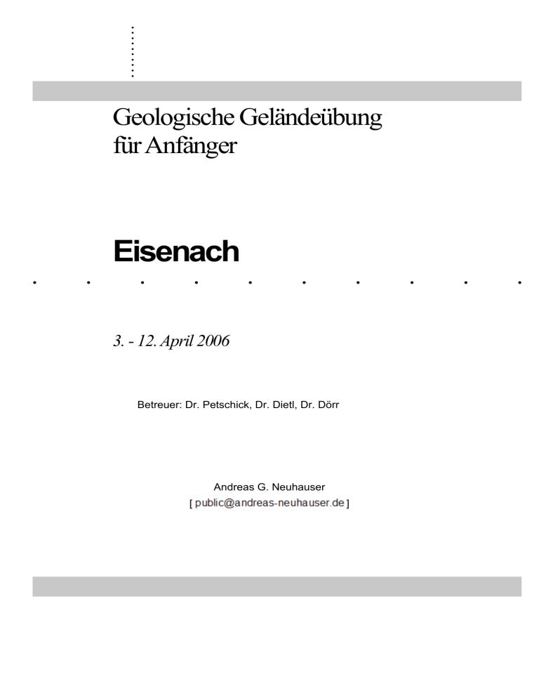.. .. .. .. .. Geologische Geländeübung für Anfänger . . Eisenach . . . . . 3. - 12. April 2006 Betreuer: Dr. Petschick, Dr. Dietl, Dr. Dörr Andreas G. Neuhauser [ ] . . . INHALTSVERZEICHNIS EINLEITUNG 1 1. TAG – 3. APRIL 2006 2 Thema: Einführung, Umgang mit dem Geologenkompass, Kluftmessungen, Aufschluss-Aufnahme2 1. AUFSCHLUSS: STEINBRUCH NÖRDLICH VON VACHA 2 2. AUFSCHLUSS: STEINBRÜCHE 1 KM WESTLICH VON KIESELBACH 2 2. TAG – 5. APRIL 2006 4 Thema: Geologische Routenaufnahme vom Mittleren Buntsandstein in den Oberen Keuper (Netra-Graben) 4 Wanderung von Mäusemühle nach Rambach 3. TAG – 5. APRIL 2006 4 10 Thema: Sedimentologische Profilaufnahme in klastischen Gesteinen (Mittlerer Bundsandstein), Zechstein-Transgression. 10 1. AUFSCHLUSS: BAHNHOF FÖRTHA 10 2. AUFSCHLUSS: STRAßENAUFSCHLUSS 2,5 KM E GERSTUNGEN 11 3. AUFSCHLUSS: N A4 ABZWEIGUNG WUTHA-FARNRODA W KLEINER HÖRSELBERG BEI EISENACH 13 4. TAG – 6. APRIL 2006 14 Thema: Sedimentologische Profilaufnahme in karbonatischen Gesteinen (Unterer Muschelkalk), Muschelkalk und Keuper 14 1. AUFSCHLUSS: GROßER STEINBRUCH BUCHENAU/WERA 14 2. AUFSCHLUSS: STEINBRUCH FIRMA HANSON W BISCHOFSRODA 18 5. TAG – 7. APRIL 2006: 19 Thema: Grund- und Deckgebirge im Bereich des Albunger Paläozoikums bei Eschwege (Devon, Karbon, Perm) 19 1. AUFSCHLUSS: AUFGEL. STEINBRUCH OBERHONE W ESCHWEGE 19 2. AUFSCHLUSS: STRAßENAUFSCHLUSS AN DER B27 W ALBUNGEN 19 3. AUFSCHLUSS: BESUCHERBERGWERK GRUBE GUSTAV 2 KM NE ABTERODE 20 4. AUFSCHLUSS: BERKATALER STEINBRUCH GMBH, FIRMA OPPERMANN, HÖLLENTAL NW SCHAFHOF 21 6. TAG – 8. APRIL 2006 22 Thema: Exkursion in das Grundgebirge des Ruhlaer Kristallin 1. AUFSCHLUSS: STRAßENAUFSCHLUSS E ORTSAUSGANG VON THAL 2. AUFSCHLUSS: STRAßENAUFSCHLUSS S ORTSAUSGANG VON THAL 3. AUFSCHLUSS: STEINBRUCH AM BUSBAHNHOF RUHLA 5. AUFSCHLUSS: NE ORTSENDE VON STEINBACH, BEIM „ALTEN HEINZ“ 6. AUFSCHLUSS: STEINBRUCH AM ESELSSPRUNG N BAIRODA W BAD LIEBENSTEIN 7. AUFSCHLUSS: N ORTSAUSGANG VON TRUSETAL – TRUSETALER WASSERFALL 8. AUFSCHLUSS: GROßER INSELBERG 22 22 22 23 24 24 24 25 Geologischer Geländekurs für Anfänger 03. bis 12. April 2006 Eisenach – Andreas G. Neuhauser I 7. TAG – 9. APRIL 2006 26 Thema: Proterozoikum und Altpaläozoikum des Thüringer Schiefergebirges 1. AUFSCHLUSS: AUFGELASSENER STEINBRUCH 1 KM N GILLERSDORF 2. AUFSCHLUSS: STRAßENAUFSCHLUSS 1 KM W SCHWARZMÜHLE 3. AUFSCHLUSS: MELLENBACH-GLASBACH, ABZWEIGUNG NACH HERRSCHDORF 4. AUFSCHLUSS: MELLENBACH, STEINBRUCH, E TALFLANKE 5. AUFSCHLUSS: STRAßE VON GOLDISTHAL NACH SCHEIBA, CA 2 KM S GOLDISTHAL 26 26 27 27 28 28 8. TAG – 10. APRIL 2006 30 Thema: Quartär der Wera, Geröllanalysen 1. AUFSCHLUSS: SANDGRUBE SAUER BEI ALTENBURSCHLA 2. AUFSCHLUSS: KIESGRUBE DER FIRMA OPPERMANN ZWISCHEN GREBENDROF UND SCHWEBDA 3. AUFSCHLUSS: STEINBRUCH N VON DANKMARSHAUSEN 4. AUFSCHLUSS: KIESGRUBE ZWISCHEN DIPPACH UND DANKMARSHAUSEN 5. AUFSCHLUSS: AUFSCHLÜSSE 1,5 KM NW FRAUENSEE 30 30 31 32 33 33 9. TAG – 11. APRIL 2006 34 Thema: Perm im Südwesten Eisenachs 34 1. AUFSCHLUSS: STEINBRUCH FIRMA BEISHEIM BEI ETTERWINDEN, STRAßE ETTERWINDEN-RUHLA 34 2. AUFSCHLUSS: STEINBRUCH DER MITTELDEUTSCHEN HARTSTEININDUSTRIE IN OBERRHON 35 3. AUFSCHLUSS: BURG ALTENSTEIN BEI SCHWEINA 36 4. AUFSCHLUSS: WANDERUNG VON DER DRACHENSCHLUCHT ÜBER DIE WARTBURG UND MÄDELSTEIN ZUR B84 AM SW-ENDE VON EISENACH 38 10. TAG – 12. APRIL 2006 40 Thema: Miozäner Vulkanismus in Hessen 40 1. AUFSCHLUSS: STEINBRUCH BLAUE KUPPE, 4 KM S ESCHWEGE – GEOLOGISCHES DENKMAL 40 2. AUFSCHLUSS: AUFGELASSENER BRAUNKOHLETAGEBAU E HOHER MEISSNER SOWIE KITZKAMMER IM SW 41 3. AUFSCHLUSS: AUFGELASSENER STEINBRUCH DER FIRMA MAIKRANZ E-ENDE HUNGEN-LANGD (VOGELSBERG) 42 Geologischer Geländekurs für Anfänger 03. bis 12. April 2006 Eisenach – Andreas G. Neuhauser II Einleitung Der Thüringer Wald ist eine horstartige Scholle und liegt im Freistaat Thüringen und zu einem geringen Teil in Bayern. Er erstreckt sich über eine Länge von 200 km und eine Breite von 35 km. Die darin befindliche Gebirgskette zieht sich von der Wera bei Eisenach bis hin zum Erzgebirge. Das Gebirgsmassiv lässt sich in drei Abschnitte unterteilen, den eigentlich Thüringer Wald, das Thüringer Schiefergebirge und den Frankenwald. Der höchste Berg ist der Große Beerberg bei Suhl mit einer Höhe von 982, 9. Weitere bedeutende Berge sind der Inselberg mit http://de.wikipedia.org einer Höhe von 916 m und der Schneekopf mit einer Höhe von 978 m. Die Gebirge stehen zum größten Teil aus vulkanischem Gestein, wie Porphyr. Die Region ist von zu 1200 m großen Störungen in der Kreide und dem Tertiär geprägt worden. Aufgrund der Abtragungen des Deckgebirges sind hier Rotliegendes und Metamorphite freigelegt. Die Ältesten Gesteine befinden sich in der Ruhla-Kristallin-Zone. Das Thüringer Schiefergebirge liegt am südöstlichen Thüringer Wald und ist 20 km breit und etwa 300 bis 500 m NN hoch. Es besteht zum größten Teil aus Schiefergestein wie Tonschiefer, Alaunschiefer, Kieselschiefer, Kalkstein, Sandstein, Diabase, Grauwacke oder Spilite, die aus dem Paläozoikum stammen. Das Gebiet besitzt almähnliche Übergänge zur umliegenden Umgebung. Die Hessische Senke liegt zwischen dem Rheinischen Schiefergebirge und dem nördlichen Thüringer Wald. Im Rotliegenden wurden bis zu 1000 m mächtige terrestrische Sedimente abgelagert. Im Zechstein durchzog das Gebiet eine Transgression aus dem Norden. Zur Bundsandsteinzeit war die Region von Seen geprägt und im Muschelkalk existierte ein Flachmeer, das Muschelkalkablagerungen hinterließ. Geologischer Geländekurs für Anfänger 03. bis 12. April 2006 Eisenach – Andreas G. Neuhauser 1 Erster Tag, 3. April 2006 Thema: Einführung, Umgang mit dem Geologenkompass, Kluftmessungen, Aufschluss-Aufnahme 1. AUFSCHLUSS: STEINBRUCH NÖRDLICH VON VACHA | R 357251 / H 563360 Hier ist ein Teil des freiliegenden Deckgebirges mit einer Diskordanz zu sehen. Es besteht aus Buntsandstein, der der Vo