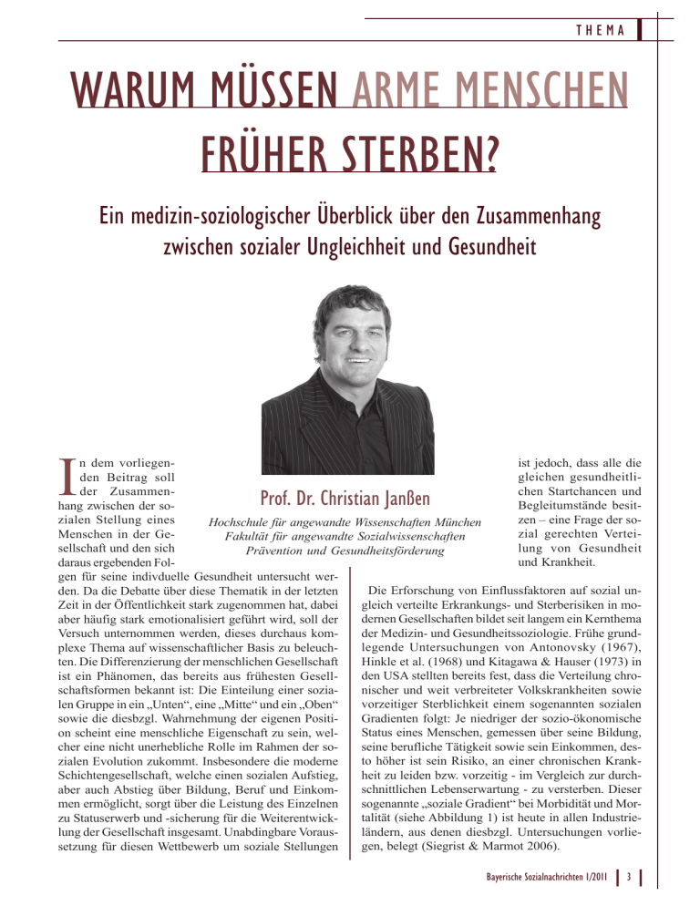 THEMA WARUM MÜSSEN ARME MENSCHEN FRÜHER STERBEN? Ein medizin-soziologischer Überblick über den Zusammenhang zwischen sozialer Ungleichheit und Gesundheit I ist jedoch, dass alle die n dem vorliegengleichen gesundheitliden Beitrag soll chen Startchancen und der ZusammenBegleitumstände besithang zwischen der sozen – eine Frage der sozialen Stellung eines Hochschule für angewandte Wissenschaften München zial gerechten VerteiMenschen in der GeFakultät für angewandte Sozialwissenschaften lung von Gesundheit sellschaft und den sich Prävention und Gesundheitsförderung und Krankheit. daraus ergebenden Folgen für seine indivduelle Gesundheit untersucht werDie Erforschung von Einflussfaktoren auf sozial unden. Da die Debatte über diese Thematik in der letzten gleich verteilte Erkrankungs- und Sterberisiken in moZeit in der Öffentlichkeit stark zugenommen hat, dabei dernen Gesellschaften bildet seit langem ein Kernthema aber häufig stark emotionalisiert geführt wird, soll der der Medizin- und Gesundheitssoziologie. Frühe grundVersuch unternommen werden, dieses durchaus komlegende Untersuchungen von Antonovsky (1967), plexe Thema auf wissenschaftlicher Basis zu beleuchHinkle et al. (1968) und Kitagawa & Hauser (1973) in ten. Die Differenzierung der menschlichen Gesellschaft den USA stellten bereits fest, dass die Verteilung chroist ein Phänomen, das bereits aus frühesten Gesellnischer und weit verbreiteter Volkskrankheiten sowie schaftsformen bekannt ist: Die Einteilung einer soziavorzeitiger Sterblichkeit einem sogenannten sozialen len Gruppe in ein „Unten“, eine „Mitte“ und ein „Oben“ Gradienten folgt: Je niedriger der sozio-ökonomische sowie die diesbzgl. Wahrnehmung der eigenen PositiStatus eines Menschen, gemessen über seine Bildung, on scheint eine menschliche Eigenschaft zu sein, welseine berufliche Tätigkeit sowie sein Einkommen, descher eine nicht unerhebliche Rolle im Rahmen der soto höher ist sein Risiko, an einer chronischen Krankzialen Evolution zukommt. Insbesondere die moderne heit zu leiden bzw. vorzeitig - im Vergleich zur durchSchichtengesellschaft, welche einen sozialen Aufstieg, schnittlichen Lebenserwartung - zu versterben. Dieser aber auch Abstieg über Bildung, Beruf und Einkomsogenannte „soziale Gradient“ bei Morbidität und Mormen ermöglicht, sorgt über die Leistung des Einzelnen talität (siehe Abbildung 1) ist heute in allen Industriezu Statuserwerb und -sicherung für die Weiterentwickländern, aus denen diesbzgl. Untersuchungen vorlielung der Gesellschaft insgesamt. Unabdingbare Vorausgen, belegt (Siegrist & Marmot 2006). setzung für diesen Wettbewerb um soziale Stellungen Prof. Dr. Christian Janßen Bayerische Sozialnachrichten 1/2011 3 WARUM MÜSSEN ARME MENSCHEN FRÜHER STERBEN? Abbildung 1: Sozialer Gradient von Morbidität & Mortalität Die Tatsache, dass die Lebenserwartung in Deutschland zwischen den 25 Prozent mit dem höchsten im Vergleich zu den 25 Prozent mit dem niedrigsten Einkommen bis zu zehn Jahren bei Männern bzw. fünf Jahren bei Frauen differiert (siehe Tabelle 1), verweist auf ein gesundheitspolitisch hochrelevantes Problem - auch in unserem Land. Dass es zudem Hinweise darauf gibt, dass diese sozialen Unterschiede in Morbidität und Mortalität europaweit wieder weiter zunehmen (Mackenbach 2006), belegt darüber hinaus die Aktualität dieser Befunde. Tabelle 1: Lebenserwartung ab Geburt (Reil-Held 2000) Lebenserwartung (in Jahren) Männer Frauen Nach Stat. Bundesamt 74 80 Äquivalenz-Einkommen a) > Mittelwert 81 85 a) < Mittelwert 77 (-4) 83 (-2) b) obere 25 % 82 86 b) untere 25 % 72 (-10) 81 (-5) Daten: Sozioökonomisches Panel, 1984-1987, Deutsche ab 50 Jahre Für verschiedene Volkskrankheiten wie Diabetes, Bluthochdruck oder Krebserkrankungen ist ebenfalls ein sozialer Schichtgradient belegt (Mielck 2000). Auch die subjektive Lebensqualität (Bullinger & Kirchberger 1998) ist sozial ungleich verteilt (Janßen et al. 2007). Besonders betroffen von statusbedingten gesundheitlichen Benachteiligungen sind die Altersgruppen der frühen Kindheit von null bis zehn Jahren sowie die der mittleren Altersgruppen zwischen 18 und 65 Jahren. In der Pubertät und im Alter scheinen sich die Unterschiede dagegen weniger bemerkbar zu machen (Kuh & BenShlomo 2004). Bei Männern wiederum wirkt sich der soziale Status, gemessen z. B. über Einkommen, (noch) stärker auf die Gesundheit aus als bei Frauen (Arber & 4 Bayerische Sozialnachrichten 1/2011 Thomas 2001). Im Allgemeinen kann man statusbezogene Unterschiede zu Ungunsten der niedrigeren Schichten in der Häufigkeit der für die Volksgesundheit wichtigsten chronischen Krankheiten finden wie HerzKreislauf-Krankheiten, Diabetes, Depressionen, Lungenkrebs, Atemwegserkrankungen, Leberzirrhose, Adipositas, sexuell übertragbaren Krankheiten sowie bei Selbstmord und gewaltsamen Todesursachen (Bundesregierung 2005). Weniger ausgeprägt findet man diese bei den meisten Krebserkrankungen, Magen-DarmKrankheiten und neurologischen Störungen. Eine geringe Zahl zumeist weniger ernsthafter Erkrankungen wird zudem in höheren sozialen Schichten häufiger festgestellt, dazu gehören z. B. Allergien und Asthma (Siegrist & Marmot 2006). Im relativ wohlhabenden Deutschland sind trotz eines ausgebauten sozialen Sicherungssystems immer noch teilweise extreme Formen von Armut vorhanden. Die davon Betroffenen verfügen in der Regel nur über äußerst eingeschränkte Handlungsspielräume und gesellschaftliche Teilhabemöglichkeiten. Solche Einschränkungen resultieren vor allem aus Langzeitarbeitslosigkeit, Wohnungslosigkeit, Drogen- oder Suchtmittelgebrauch, Straffälligkeit oder eben gesundheitlichen Einschränkungen, häufig auch in Kombination. Hinzu kommt oftmals, dass unterstützende sozialstaatliche Maßnahmen durch diese Personen nicht in ausreichendem Maße in Anspruch genommen bzw. nur noch schwer von diesen erreicht werden können (Schulz-Nieswandt et al. 2006). Diese sogenannte 
