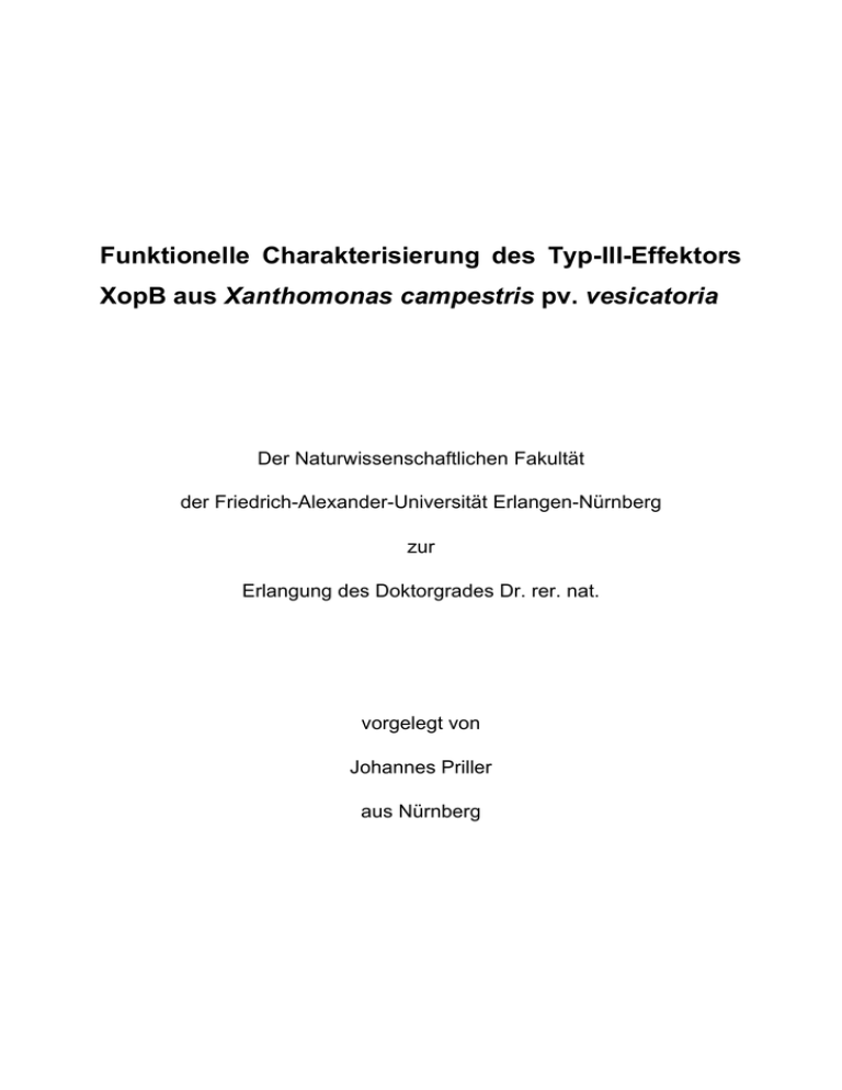 Funktionelle Charakterisierung des Typ-III-Effektors XopB aus Xanthomonas campestris pv. vesicatoria Der Naturwissenschaftlichen Fakultät der Friedrich-Alexander-Universität Erlangen-Nürnberg zur Erlangung des Doktorgrades Dr. rer. nat. vorgelegt von Johannes Priller aus Nürnberg Als Dissertation genehmigt von der Naturwissenschaftlichen Fakultät der Friedrich-Alexander-Universität Erlangen-Nürnberg Tag der mündlichen Prüfung: 20.11.2015 Vorsitzender des Promotionsorgans: Prof. Dr. Jörn Wilms Gutachter: Prof. Dr. Uwe Sonnewald Prof. Dr. Benedikt Kost Teile dieser Arbeit sind in folgender Publikation enthalten: Sonnewald S, Priller JPR, Schuster J, Glickmann E, Hajirezaei MR, Siebig S, Mudgett MB, Sonnewald U (2012) Regulation of Cell Wall-Bound Invertase in Pepper Leaves by Xanthomonas campestris pv. vesicatoria Type Three Effectors. PLoS One 7: e51763 1. Zusammenfassung/ Summary ..................................................................................... 1 1.1. Zusammenfassung ............................................................................................................. 1 1.2. Summary ........................................................................................................................... 2 2. Einleitung .................................................................................................................... 4 2.1. Die Phytopathogenen Xanthomonaden und Pseudomonaden ........................................... 4 2.1.1. Xanthomonas campestris pv. vesicatoria (Xcv) als Auslöser der bakteriellen Fleckenkrankheit bei Tomaten-­‐ und Paprikapflanzen ..................................................................... 5 2.1.2. Pseudomonas syringae pv. tomato DC3000 (Pst DC3000) als Auslöser der bakteriellen Tüpfelschwärze bei Tomaten-­‐ und Arabidopsispflanzen ................................................................ 7 2.2. Das Immunsystem von Pflanzen ........................................................................................ 8 2.2.1. Die Nicht-­‐Wirts-­‐Resistenz .................................................................................................. 8 2.2.1.1. Präformierte Abwehr der Pflanzen ................................................................................. 9 2.2.1.2. PAMP-­‐vermittelte Immunität ......................................................................................... 9 2.2.1.3. Aktivierung der NADPH-­‐Oxidase auf Proteinebene ................................................................ 11 2.2.1.4. Genregulation über MAP-­‐ und CDP-­‐Kinasen ........................................................................... 12 2.3. Effektor-­‐vermittelte Immunität ....................................................................................... 12 2.4. Die Phytohormone der Pathogenabwehr ......................................................................... 14 2.5. Suppression der pflanzlichen Immunantwort durch bakterielle Effektoren ...................... 15 2.5.1. Typ-­‐III-­‐Sekretionssystem Gram-­‐negativer Bakterien ....................................................... 15 2.5.2. Typ-­‐III-­‐Effektoren ............................................................................................................. 16 2.5.3. Zielprozesse der T3Es ....................................................................................................... 17 2.5.3.1. PRRs und assoziierte Kinasen ........................................................................................ 17 2.5.3.2. MAP-­‐Kinasen ................................................................................................................. 18 2.5.3.3. Transkription der Wirtszelle .......................................................................................... 19 2.5.3.4. Vesikeltransport ............................................................................................................ 19 2.6. Umprogrammierung des Wirtsmetabolismus durch Pathogene ....................................... 20 2.7. Der Typ-­‐III-­‐Effektor XopB ................................................................................................. 23 2.8. Vorarbeiten und Zielsetzung dieser Arbeit ....................................................................... 24 3. Material und Methoden ............................................................................................. 25 3.1. Materialien ..................................................................................................................... 25 3.1.1. Chemikalien, Enzyme und Verbrauchsmaterialien .......................................................... 25 3.1.2. Antibiotika ........................................................................................................................ 25 3.1.3. Vektoren ......................................................................................................................... 25 i 3.1.4. Oligonukleotide u nd S equenzierungen ........................................................................ 26 3.1.5. Antikörper ...................................................................................................................... 29 3.1.6. Bakterienstämme ........................................................................................................... 29 3.1.7. Hefestämme ................................................................................................................... 30 3.1.8. Pflanzen .......................................................................................................................... 30 3.2. Arbeiten mit Pflanzen ...................................................................................................... 31 3.2.1. Anzucht von Pflanzen ...................................................................................................