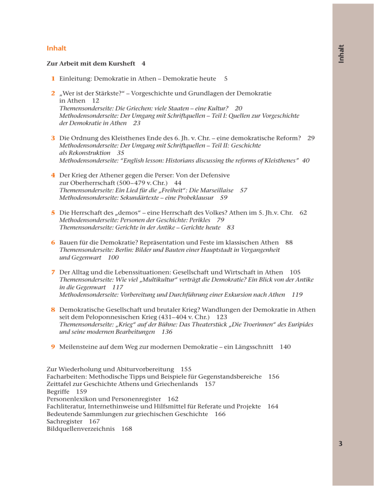 Inhalt Inhalt Zur Arbeit mit dem Kursheft 4 1 Einleitung: Demokratie in Athen – Demokratie heute 5 2 „Wer ist der Stärkste?“ – Vorgeschichte und Grundlagen der Demokratie in Athen 12 Themensonderseite: Die Griechen: viele Staaten – eine Kultur? 20 Methodensonderseite: Der Umgang mit Schriftquellen – Teil I: Quellen zur Vorgeschichte der Demokratie in Athen 23 3 Die Ordnung des Kleisthenes Ende des 6. Jh. v. Chr. – eine demokratische Reform? 29 Methodensonderseite: Der Umgang mit Schriftquellen – Teil II: Geschichte als Rekonstruktion 35 Methodensonderseite: “English lesson: Historians discussing the reforms of Kleisthenes” 40 4 Der Krieg der Athener gegen die Perser: Von der Defensive zur Oberherrschaft (500–479 v. Chr.) 44 Themensonderseite: Ein Lied für die „Freiheit“: Die Marseillaise Methodensonderseite: Sekundärtexte – eine Probeklausur 59 57 5 Die Herrschaft des „demos“ – eine Herrschaft des Volkes? Athen im 5. Jh.v. Chr. 62 Methodensonderseite: Personen der Geschichte: Perikles 79 Themensonderseite: Gerichte in der Antike – Gerichte heute 83 6 Bauen für die Demokratie? Repräsentation und Feste im klassischen Athen 88 Themensonderseite: Berlin: Bilder und Bauten einer Hauptstadt in Vergangenheit und Gegenwart 100 7 Der Alltag und die Lebenssituationen: Gesellschaft und Wirtschaft in Athen 105 Themensonderseite: Wie viel „Multikultur“ verträgt die Demokratie? Ein Blick von der Antike in die Gegenwart 117 Methodensonderseite: Vorbereitung und Durchführung einer Exkursion nach Athen 119 8 Demokratische Gesellschaft und brutaler Krieg? Wandlungen der Demokratie in Athen seit dem Peloponnesischen Krieg (431–404 v. Chr.) 123 Themensonderseite: „Krieg“ auf der Bühne: Das Theaterstück „Die Troerinnen“ des Euripides und seine modernen Bearbeitungen 136 9 Meilensteine auf dem Weg zur modernen Demokratie – ein Längsschnitt 140 Zur Wiederholung und Abiturvorbereitung 155 Facharbeiten: Methodische Tipps und Beispiele für Gegenstandsbereiche 156 Zeittafel zur Geschichte Athens und Griechenlands 157 Begriffe 159 Personenlexikon und Personenregister 162 Fachliteratur, Internethinweise und Hilfsmittel für Referate und Projekte 164 Bedeutende Sammlungen zur griechischen Geschichte 166 Sachregister 167 Bildquellenverzeichnis 168 3