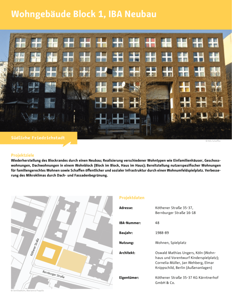 Wohngebäude Block 1, IBA Neubau Südliche Friedrichstadt © Nils Scheffler Projektziele Wiederherstellung des Blockrandes durch einen Neubau; Realisierung verschiedener Wohntypen wie Einfamilienhäuser, Geschosswohnungen, Dachwohnungen in einem Wohnblock (Block im Block, Haus im Haus); Bereitstellung nutzerspezifischer Wohnungen für familiengerechtes Wohnen sowie Schaffen öffentlicher und sozialer Infrastruktur durch einen Wohnumfeldspielplatz. Verbesserung des Mikroklimas durch Dach- und Fassadenbegrünung. Köth ener Stra ße Projektdaten Bern burg er St raße © SenStadtUm, Marianna Poppitz Adresse: Köthener Straße 35-37, Bernburger Straße 16-18 IBA-Nummer: 48 Baujahr: 1988-89 Nutzung: Wohnen, Spielplatz Architekt: Oswald Mathias Ungers, Köln (Wohnhaus und Vorentwurf Kinderspielplatz); Cornelia Müller, Jan Wehberg, Elmar Knippschild, Berlin (Außenanlagen) Eigentümer: Köthener Straße 35-37 KG Kärntnerhof GmbH & Co. Städtebau Wiederherstellung der Blockrandstruktur durch einen quadratischen Neubau, dessen Block-im-Block Struktur das Blockrandmuster aufgreift und kleinteilig in einer Zusammenfassung unterschiedlicher Wohntypen weiterentwickelt. Qualitäten © Nils Scheffler Freiraum Öffentlicher Wohnumfeldspielplatz, der über einen Übergangsraum und Toreingänge zum halböffentlichen Innenhofbereich des Neubaus führt. Zur räumlichen Differenzierung liegt der Innenhofbereich erhöht über dem Straßenniveau. © Nils Scheffler Architektur Der Neubau von Oswald Mathias Ungers gehört zu den Leuchtturmprojekten der IBA ’87. Sein schlichter Zeitgeist-Ausdruck spiegelt das IBA Spannungsfeld zwischen Reduktion (Stilrichtung der Moderne) und Vielfalt (Anklänge von typologischer Variation) wieder. Mit seinen begrünten Dachterrassen ist der Neubau durch das quadratische Grundraster des Gebäudegrundrisses und der Fensteröffnungen sowie Fenstergliederungen geprägt. Charakteristisch ist die dunkle Klinkerfassade mit dem Farbkontrast der breiten, weißen Fenstersprossen. Kommunikation, Württembergische Straße 6, 10707 Berlin www.stadtentwicklung.berlin.de © Nils Scheffler Wohnhof Block 2, IBA Neubau Südliche Friedrichstadt © Marianna Poppitz Projektziele Wiederherstellung der Blockrandstruktur und Integration des Baudenkmals St. Lukas-Kirche durch eine neue Wohnhofbebauung. Qualitative Verbesserung der Freiflächensituation und Schaffen nutzerspezifischer Wohnformen und Wohngemeinschaften für Alleinerziehende. Berücksichtigung ökologischer Anforderungen durch umweltfreundliche Baustoffe und energieschonende Bauweise. Mischen von Wohnen und Gewerbe. Projektdaten Dess auer Stra ße ße tra ns an em es Str Bernb urger Straß e © SenStadtUm, Marianna Poppitz Adresse: Dessauer Straße 34-40, Stresemannstraße 105 / 107 / 109, Bernburger Straße 6-9 IBA-Nummer: 51 Baujahr: 1990-91 Nutzung: Wohnen; Gewerbe: EG Stresemannstraße sowie Ecke Dessauer / Bernburger Straße; Spielflächen in den Höfen Architekt: Peter Blake, Washington; Christine Jachmann, Berlin; Zaha M. Hadid, London u.a. Eigentümer: degewo AG Städtebau Wiederherstellung der Blockrandstruktur durch Neubauten sowie Integration des Baudenkmals St. Lukas Kirche. Qualitäten © Marianna Poppitz (links), Nils Scheffler (rechts) Freiraum Aneinanderreihung kleinerer Wohnhöfe mit differenzierten Aufenthalts- und Nutzungsmöglichkeiten sowie privaten Mietergärten für unterschiedliche Generationen. Die Wohnhöfe sind über Toreingänge erreichbar, wobei der nördliche Hofbereich Übergangscharakter zu den halböffentlichen Wohnhöfen hat. © Nils Scheffler Architektur Das Gebäude in der Stresemannstraße 109 ist ein frühes Beispiel dekonstruktivistischer Architektur von Zaha Hadid. Mit seiner Metall-Vorhangfassade und akzentuierenden Blockspitzenausbildung gehört es zu den Leuchtturmprojekten der IBA ’87. Die Gebäude in der Dessauer und Bernburger Straße haben eine charakteristische Klinkerfassade in hell-dunkel Variationen. Hierbei wechseln sich reine Klinkerfassaden mit Klinker-Putzfassaden und zum Teil versetzten Balkonen ab. Die Fenster und Hauseingangstüren sind gleichmäßig mehrfach gegliedert. Kommunikation, Württembergische Straße 6, 10707 Berlin www.stadtentwicklung.berlin.de © Marianna Poppitz Wohnanlage am Mendelssohn-Bartholdy-Park, IBA Neubau Südliche Friedrichstadt © Nils Scheffler Projektziele Wiederherstellung der Blockrandstruktur und Neufassung der Stadtkante zum Landwehrkanal. Errichtung von Spiel- und Freiflächen sowie nutzerspezifischer Wohnungen und Gemeinschaftsflächen für familiengerechtes sowie rollstuhlgerechtes Wohnen. Entwicklung energiesparender Grundrisse und Bauweisen sowie Mischen von Wohnen und Gewerbe. Mietkostenminderung durch Teilausbau der Wohnungen in Selbsthilfe durch die Mieter. 25-26a 23a eg l-W se en y-H nn Fa Dess auer Stra ße Projektdaten 5-6 Adresse: Dessauer Straße 22-23a, 25-26a, Schöneberger Straße 5-13, Hafenplatz 1-3 IBA-Nummer: 52 Baujahr: 1987-90 Nutzung: Wohnen; Gewerbe: EG Schöneberger Straße; Spielfläche im Hof Architekt: Josef Paul Kleihues, Berlin u.a. Eigentümer: Dessauer Straße 25-26a: R&W Immobilienfonds 58 GbR; Schöneberger Straße 5-6: Gründstücksverwaltung; Dessauer Straße 22-23a, Schöneberger Straße 7-13, Hafenplatz 1-2: Wohneigentümergemeinschaft 7-8 22 Ha fe 1-3 np lat z er 9-12 berg ne hö Sc 13 © SenStadtUm, Marianna Poppitz e aß Str Städtebau Wiederherstellung der Blockrandstruktur durch mehrere Neubauten sowie Variation der Blockrandstruktur durch einen Brandwandanbau mit einer dezenten Fassadenwölbung am Fanny-Hensel-Weg. Qualitäten © Nils Scheffler Freiraum Großer Innenhof mit Spiel- und Freifläche sowie Mietergärten. Zwischen dem neu ausgebildeten Block und dem Brandwandanbau verläuft der Fanny-Hensel-Weg. Er weist eine gute Differenzierung von Wegen und Grünflächen auf. Eine niedrig gehaltene, weiß verputzte Mauer grenzt die Vorgärten des Brandwandanbaus vom Fanny-Hensel-Weg ab. © Nils Scheffler
