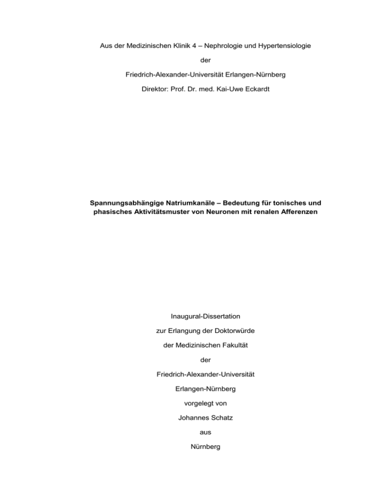 Aus der Medizinischen Klinik 4 – Nephrologie und Hypertensiologie der Friedrich-Alexander-Universität Erlangen-Nürnberg Direktor: Prof. Dr. med. Kai-Uwe Eckardt Spannungsabhängige Natriumkanäle – Bedeutung für tonisches und phasisches Aktivitätsmuster von Neuronen mit renalen Afferenzen Inaugural-Dissertation zur Erlangung der Doktorwürde der Medizinischen Fakultät der Friedrich-Alexander-Universität Erlangen-Nürnberg vorgelegt von Johannes Schatz aus Nürnberg Gedruckt mit Erlaubnis der Medizinischen Fakultät der Friedrich-Alexander-Universität Erlangen-Nürnberg Dekan: Prof. Dr. Dr. h. c. J. Schüttler Referent: Prof. Dr. R. Veelken Korreferent: Prof. Dr. K.-F. Hilgers Tag der mündlichen Prüfung: 29. Mai 2013 Für meine Eltern, die mich stets unterstützt haben Inhaltsverzeichnis 1. Zusammenfassung ............................................................................................. 1 2. Einleitung ............................................................................................................ 4 3. Material und Methoden ....................................................................................... 7 3.1. Überblick über den Ablauf .........................................................................................7 3.2. Tiermodell ....................................................................................................................7 3.3. Zur elektrophysiologischen Untersuchungstechnik ...............................................8 3.1.1. Geschichte und Bedeutung der Ganzzellableitung ........................................8 3.1.2. Probleme der Ganzzellableitung und Lösungsstrategien ...........................11 3.2. Patch-clamp-Arbeitsplatz ........................................................................................14 3.2.1. Technischer Aufbau ..........................................................................................14 3.2.2. Patch-clamp-Utensilien und Lösungen ..........................................................16 3.3. Hauptversuch ............................................................................................................17 3.3.1. Fluoreszenzfärbung renaler Neurone ............................................................17 3.3.2. Gewebedissoziation und Zellkultur .................................................................19 3.3.3. Ablauf der Messungen, Konfigurationen und Protokolle .............................22 3.3.4. Current-clamp-Modus .......................................................................................23 3.3.5. Voltage-clamp-Modus.......................................................................................24 3.4. Kontrollversuch .........................................................................................................26 3.4.1. Rechtfertigung des Kontrollversuchs .............................................................26 3.4.2. Gewebedissoziation und Zellkultur .................................................................26 3.4.3. Ablauf der Messungen, Konfigurationen und Protokolle .............................27 3.4.4. Current-clamp-Modus .......................................................................................27 3.5. Auswertung – Anmerkungen und Techniken .......................................................28 3.5.1. Current-clamp-Auswertung ..............................................................................29 3.5.2. Voltage-clamp-Auswertung..............................................................................31 4. Ergebnisse ........................................................................................................ 33 4.1. Hauptversuch ............................................................................................................33 4.1.1. Ergebnisse im Current-clamp-Modus ............................................................33 4.1.2. Ergebnisse im Voltage-clamp-Modus ............................................................39 4.2. Kontrollversuch .........................................................................................................42 5. Diskussion ........................................................................................................ 44 5.1. Kontrollversuch .........................................................................................................44 5.2. Hauptversuch ............................................................................................................45 6. Einordnung in körpereigene Prozesse ............................................................ 54 7. Literaturverzeichnis .......................................................................................... 56 8. Abkürzungsverzeichnis .................................................................................... 62 9. Anhang .............................................................................................................. 63 10. Danksagung .................................................................................................... 64 11. Lebenslauf ....................................................................................................... 65 1 1. Zusammenfassung Hintergrund und Ziele Neurone der Hinterwurzelganglien zeigen durch Stimulation hervorgerufene elektrophysiologische Reaktionen in Form von Aktionspotentialen. Spezifisch auf Neurone mit Afferenzen zur Niere bezogene Vordaten offenbaren während elektrischer Stimulation voneinander abweichende Antwortverhalten – entweder als kontinuierliche Abfolge von Aktionspotentialen (tonisches Verhalten) oder lediglich einmalige Reaktion (phasisches Verhalten). Ausgehend von vorherigen Versuchen, die unterschiedliche Aktivierungskurven für Natriumkanäle in Neuronen beider Gruppen erkennen lassen, wird das Augenmerk der Untersuchungen auf spannungsabhängige Natriumkanäle gelegt. Die Forschungshypot