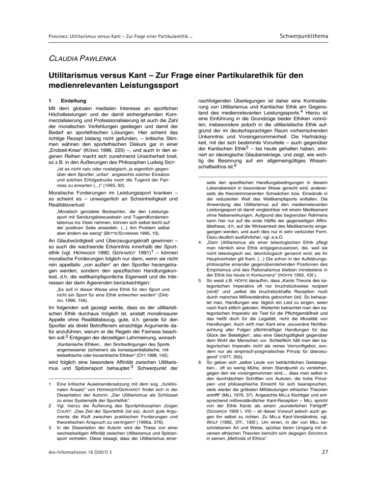 Schwerpunktthema PAWLENKA: Utilitarismus versus Kant – Zur Frage einer Partikularethik ... CLAUDIA PAWLENKA Utilitarismus versus Kant – Zur Frage einer Partikularethik für den medienrelevanten Leistungssport 1 Einleitung Mit dem globalen medialen Interesse an sportlichen Höchstleistungen und der damit einhergehenden Kommerzialisierung und Professionalisierung ist auch die Zahl der moralischen Verfehlungen gestiegen und damit der Bedarf an sportethischen Lösungen. Hier scheint das richtige Rezept bislang nicht gefunden, – kritische Stimmen wähnen den sportethischen Diskurs gar in einer „Endzeit-Krise“ (KÖNIG 1996, 225) –, und auch in den eigenen Reihen macht sich zunehmend Unsicherheit breit, so z.B. in den Äußerungen des Philosophen Ludwig SIEP: „Ist es nicht naiv oder nostalgisch, ja eigentlich gegenüber dem Sportler ,unfair’, angesichts solcher Einsätze und solchen Erfolgsdrucks noch die Tugend der Fairness zu erwarten (...)“ (1993, 92). nachfolgenden Überlegungen ist daher eine Kontrastierung von Utilitarismus und Kantischer Ethik am Gegenstand des medienrelevanten Leistungssports.4 Hierzu ist eine Einführung in die Grundzüge beider Ethiken vonnöten, insbesondere jedoch in die utilitaristische Ethik aufgrund der im deutschsprachigen Raum vorherrschenden Unkenntnis und Voreingenommenheit. Die Hartnäckigkeit, mit der sich bestimmte Vorurteile – auch gegenüber der Kantischen Ethik5 – bis heute gehalten haben, erinnert an ideologische Glaubenskriege, und zeigt, wie wichtig die Besinnung auf ein allgemeingültiges Wissenschaftsethos ist.6 Moralische Forderungen im Leistungssport kranken – so scheint es – unweigerlich an Scheinheiligkeit und Realitätsverlust: „Moralisch gerüstete Beobachter, die den Leistungssport mit Sendungsbewusstsein und Tugendfundamentalismus ins Visier nehmen, können sich selbst leicht auf der positiven Seite ansiedeln. (...) Am Problem selbst aber ändern sie wenig“ (BETTE/SCHIMANK 1995, 10). An Glaubwürdigkeit und Überzeugungskraft gewinnen – so auch die wachsende Erkenntnis innerhalb der Sportethik (vgl. HERINGER 1990; GERHARDT 1991)1 – können moralische Forderungen folglich nur dann, wenn sie nicht rein appellativ „von außen“ an den Sportler herangetragen werden, sondern den spezifischen Handlungskontext, d.h. die wettkampfsportliche Eigenwelt und die Interessen der darin Agierenden berücksichtigen: 4 5 „Es soll in dieser Weise eine Ethik für den Sport und nicht ein Sport für eine Ethik entworfen werden“ (DREXEL 1996, 156). Im folgenden soll gezeigt werde, dass es der utilitaristischen Ethik durchaus möglich ist, anstatt moralinsaurer Appelle ohne Realitätsbezug, gute, d.h. gerade für den Sportler als direkt Betroffenem einsichtige Argumente dafür anzuführen, warum er die Regeln der Fairness beachten soll.2 Entgegen der derzeitigen Lehrmeinung, wonach „Kantianische Ethiken... den Sinnbedingungen des Sports angemessener (scheinen) als konsequentialistische, mitleidsethische oder biozentrische Ethiken“ (OTT 1998, 142), wird folglich eine besondere Affinität zwischen Utilitarismus und Spitzensport behauptet.3 Schwerpunkt der 1 2 3 Eine kritische Auseinandersetzung mit dem sog. „funktionalen Ansatz“ von HERINGER/GERHARDT findet sich in der Dissertation der Autorin: „Der Utilitarismus als Schlüssel zu einer Systematik der Sportethik“. Vgl. hierzu die Äußerung des Sportphilosophen Jürgen COURT: „Das Ziel der Sportethik (ist es), durch gute Argumente die Kluft zwischen praktischen Forderungen und theoretischen Anspruch zu verringern“ (1995a, 376). In der Dissertation der Autorin wird die These von einer wechselseitigen Affinität zwischen Utilitarismus und Spitzensport vertreten. Diese besagt, dass der Utilitarismus einer- dvs-Informationen 16 (2001) 3 6 seits den spezifischen Handlungsbedingungen in diesem Lebensbereich in besonderer Weise gerecht wird, andererseits die theorieimmanenten Schwächen bzw. Einwände in der reduzierten Welt des Wettkampfsports entfallen. Die Anwendung des Utilitarismus auf den medienrelevanten Leistungssport ist damit vergleichbar mit einem Medikament ohne Nebenwirkungen. Aufgrund des begrenzten Rahmens kann hier nur auf die erste Hälfte der gegenseitigen Affinitätsthese, d.h. auf die Wirksamkeit des Medikaments eingegangen werden, und auch dies nur in sehr verkürzter Form. Dazu deutlich ausführlicher, vgl. a.a.O. „Dem Utilitarismus als einer teleologischen Ethik pflegt man nämlich eine Ethik entgegenzusetzen, die, weil sie nicht teleologisch sei, deontologisch genannt wird; als ihr Hauptvertreter gilt Kant. (...) Die schon in der Aufklärungsphilosophie einander gegenüberstehenden Positionen des Empirismus und des Rationalismus bleiben mindestens in der Ethik bis heute in Konkurrenz“ (HÖFFE 1992, 43f.). So weist z.B. HÖFFE daraufhin, dass „Kants Theorie des kategorischen Imperativs oft nur bruchstückweise rezipiert (wird)“ und „selbst die bruchstückhafte Rezeption noch durch manches Mißverständnis gebrochen (ist). So behauptet man, Handlungen wie: täglich ein Lied zu singen, seien nach Kant sittlich geboten. Weiterhin betrachtet man den kategorischen Imperativ als Test für die Pflichtgemäßheit und das heißt doch für die Legalität, nicht die Moralität von Handlungen. Auch wirft man Kant eine ,souveräne Nichtbeachtung aller Folgen pflichtmäßiger Handlungen für das Glück der Beteiligten’, also eine Gleichgültigkeit gegenüber dem Wohl der Menschen vor. Schließlich hält man den kategorischen Imperativ nicht als reines Vernunftgebot, sondern nur als empirisch-pragmatisches Prinzip für überzeugend“ (1977, 355). So geben sich „selbst Leute von beträchtlichen Geistesgaben... oft so wenig Mühe, einen Standpunkt zu verstehen, gegen den sie voreingenommen sind..., dass man selbst in den durchdachten Schriften von Autoren, die hohe Prinzipien und philosophische Einsicht für sich beanspruchen, stets wieder die gr