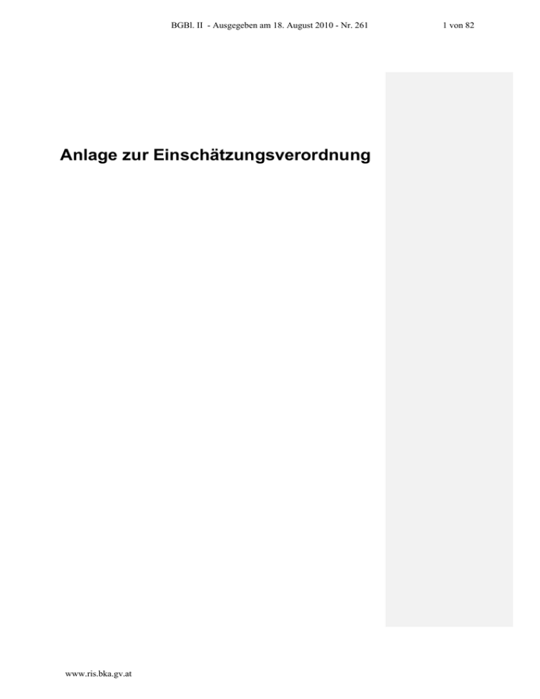 BGBl. II - Ausgegeben am 18. August 2010 - Nr. 261 Anlage zur Einschätzungsverordnung www.ris.bka.gv.at 1 von 82 BGBl. II - Ausgegeben am 18. August 2010 - Nr. 261 Inhaltsverzeichnis ---------------------------------------------------------------------- Seite 01 Haut-------------------------------------------------------------------------------------------------- 4 01.01 Hauterkrankungen ----------------------------------------------------------------------------------------- 4 02 Muskel- Skelett- u. Bindegewebssystem, Haltungs- u. Bew.apparat --------- 6 02.01 02.02 02.03 02.04 02.05 02.06 02.07 Wirbelsäule -------------------------------------------------------------------------------------------------- 6 Generalisierte Erkrankungen des Bewegungsapparates --------------------------------------- 8 Osteomyelitis ------------------------------------------------------------------------------------------------ 8 Beckenschäden--------------------------------------------------------------------------------------------- 9 Untere Extremitäten --------------------------------------------------------------------------------------- 9 Obere Extremitäten --------------------------------------------------------------------------------------- 13 Schädel ------------------------------------------------------------------------------------------------------ 17 03 Psychische Störungen---------------------------------------------------------------------- 18 03.01 03.02 03.03 03.04 03.05 Kognitive Leistungsstörungen ------------------------------------------------------------------------- 18 Entwicklungsstörungen bis zum vollendeten 18.LJ ---------------------------------------------- 19 Demenzformen -------------------------------------------------------------------------------------------- 20 Persönlichkeits- und Verhaltensstörungen --------------------------------------------------------- 21 Neurotische Belastungsreaktionen, somatoforme Störungen und posttraumatische Belastungsstörung PTSD (post traumatic stress disorder) ------ 23 / 26 03.06 Affektive Störungen --------------------------------------------------------------------------------------- 27 03 07 Schizophrene Störungen -------------------------------------------------------------------------------- 28 03.08 Suchterkrankungen --------------------------------------------------------------------------------------- 29 04 Nervensystem---------------------------------------------------------------------------------- 31 04.01 04.02 04.03 04.04 04.05 04.06 04.07 04.08 04.09 04.10 04.11 Cerebrale Lähmungen ----------------------------------------------------------------------------------- 31 Bulbärparalyse --------------------------------------------------------------------------------------------- 31 Spinlae Lähmungen – Querschnittsyndrom ------------------------------------------------------- 32 Lähmungen der Hirnnerven ---------------------------------------------------------------------------- 32 Lähmungen der peripheren Nerven ------------------------------------------------------------------ 33 Polyneuropathien und Polyneurotiden -------------------------------------------------------------- 34 Neuromuskuläre Erkrankungen ----------------------------------------------------------------------- 34 Demyelinisierende Erkrankungen -------------------------------------------------------------------- 35 Extrapyramidale Erkrankungen ----------------------------------------------------------------------- 35 Epilepsie ----------------------------------------------------------------------------------------------------- 37 Chronisches Schmerzsyndrom ------------------------------------------------------------------------ 37 05 Herz und Kreislauf --------------------------------------------------------------------------- 39 05.01 05.02 05.03 05.04 05.05 05.06 05.07 05.08 Hypertonie--------------------------------------------------------------------------------------------------- 39 Herzmuskelerkrankungen------------------------------------------------------------------------------- 39 Arterielles Gefäßsystem --------------------------------------------------------------------------------- 40 Niere ---------------------------------------------------------------------------------------------------------- 40 Koronare Herzkrankheit --------------------------------------------------------------------------------- 41 Vitien – Stenosen ----------------------------------------------------------------------------------------- 42 Herzklappeninsuffizienz --------------------------------------------------------------------------------- 44 Venöses und lymphatisches System ---------------------------------------------------------------- 45 06 Atmungssystem ------------------------------------------------------------------------------- 47 06.01 06.02 06.03 06.04 Defekte nach Brüchen oder operativen Eingriffen am Brustkorb ---------------------------- 47 Folgezustände nach operativen Eingriffen an der Lunge -------------------------------------- 48 Bronchiektasien -------------------------------------------------------------------------------------------- 48 Asthma bronchiale bei Kindern u. Jungendlichen bis zum vollendeten 18. LJ ----------- 49 Anlage zur Einschätzungsverordnung (21.05. 2010) www.ris.bka.gv.at Seite 2 2 von 82 BGBl. II - Ausgegeben am 18. August 2010 - Nr. 261 06.05 06.06 06.07 06.08 06.09 06.10 06.11 Asthma bronchiale ab dem vollendeten 18. Lebensjahr --------------------------------------- 50 Chronisch obstruktive Lungenerkrankung (COPD) ---------------------------------------------- 51 Interstitielle Lungenerkrankung, Alveolitis und Fibrosen --------------------------------------- 52 Primär pulmonale Hypertension ----------------------------------------------------------------------- 53 Lungentuberkulose --------------------------------------------------------------------------------------- 54 Cystische Fibrose -----------