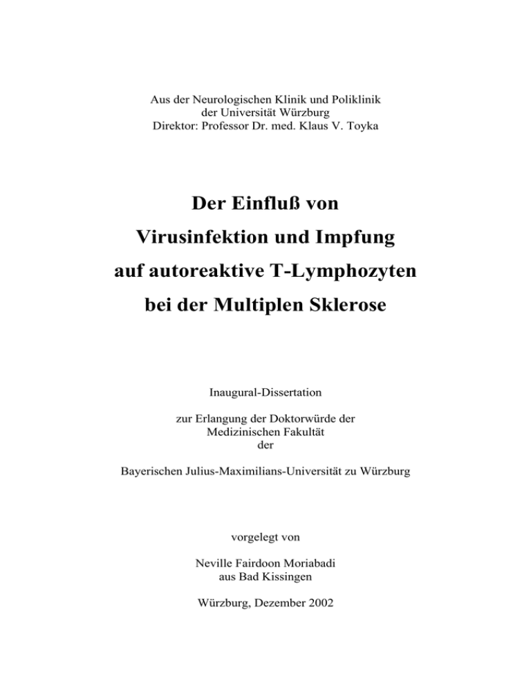 Aus der Neurologischen Klinik und Poliklinik der Universität Würzburg Direktor: Professor Dr. med. Klaus V. Toyka Der Einfluß von Virusinfektion und Impfung auf autoreaktive T-Lymphozyten bei der Multiplen Sklerose Inaugural-Dissertation zur Erlangung der Doktorwürde der Medizinischen Fakultät der Bayerischen Julius-Maximilians-Universität zu Würzburg vorgelegt von Neville Fairdoon Moriabadi aus Bad Kissingen Würzburg, Dezember 2002 Referent: Prof. Dr. med Peter Rieckmann Koreferent: Prof. Dr. med Volker ter Meulen Dekan: Prof. Dr. med Stefan Silbernagl Tag der mündlichen Prüfung: 11. Juni 2003 Der Promovend ist Arzt Dem Katerchen, der Toskana, meiner Frau, meinen Eltern und Brüdern gewidmet, sowie den tapferen Patienten, die uns zur aufrechten und unermüdlichen Suche nach Ursache und Behandlung ihrer Erkrankung verpflichten. „evidence of absence is not absence of evidence!“ i Inhaltsverzeichnis Inhaltsverzeichnis Verzeichnis der Abkürzungen i vi 1 Einleitung 1.1 Multiple Sklerose 1 1.2 Multiple Sklerose und T-Zellimmunologie 2 1.3 Virusinfektionen und Multiple Sklerose 3 1.3.1 Hinweise für eine Infektassoziation 1.3.1.1 Historische Vorbemerkungen 1.3.1.2 Epidemiologie 1.3.1.3 Experimentelle autoimmune Enzephalomyelitis 1.3.1.4 Demyelinisierende Virusinfektionen bei Tieren 1.3.1.5 (Para-/Post-)Infektiöse Entmarkung beim Menschen 1.3.1.6 Klinisch-immunologische Untersuchungen 1.3.1.6.1 1.3.1.6.2 1.3.1.6.3 Seite 4 5 6 7 Erhöhte Antikörpertiter bei MS-Patienten MS-Schübe nach IFNγ-Behandlung MS-Schübe bei Infektionen der oberen Luftwege 1.3.2 Mögliche Wirkmechanismen der Krankheitsentstehung 8 1.3.2.1 Direkte Schädigung durch Virusinfektion der Oligodendrozyten 1.3.2.2 Immunvermittelte Schädigung infizierter Oligodendrozyten 1.3.2.3 Indirekte Schädigung bei unspezifischer ZNS-Infektion 9 1.3.2.3.1 1.3.2.3.2 1.3.2.3.3 1.3.2.4 1.3.2.4.1 1.3.2.4.2 1.3.2.4.3 1.3.2.5 1.4 Erleichterte Zellmigration (Lymphocyte Homing) Kreuzreaktivität (Molecular Mimicry) und Epitope Spreading Lokale Begleitreaktion (Local Bystander Activation) 10 Aktivierung autoreaktiver Zellen bei systemischer Infektion Kreuzreaktivität (Molecular Mimicry) Unspezifische Begleitreaktivität (Systemic Bystander Effect) Mikrobielle Superantigene 12 Mehrfachinfektion / Pathogenwechselwirkungen Viren mit möglicher Relevanz 1.4.1 Humanes Herpesvirus 6 1.4.1.1 Taxonomie 1.4.1.2 Pathogenität 13 14 Inhaltsverzeichnis 1.4.2 Influenzavirus 1.4.2.1 Taxonomie 1.4.2.2 Virusstruktur und Antigenität (Shift/Drift) 1.4.2.3 Pathogenität und Krankheitsbild 1.5 Infektionsprophylaxe 1.5.1 1.5.2 ii 15 16 Impfung Influenzaschutzimpfung und Multiple Sklerose 1.6 Aufgabenstellung und Zielsetzung 2 Material und Methoden 2.1 Material 2.1.1 2.1.1.1 2.1.1.2 2.1.1.3 2.1.1.4 2.1.2 2.1.2.1 2.1.2.2 2.1.2.3 2.1.2.4 2.1.2.5 2.1.2.6 2.1.2.7 2.1.2.8 2.1.3 2.1.3.1 2.1.3.2 2.1.4 2.1.5 Materialien für Biochemie Reagenzien und Chemikalien Ansatz der Lösungen und Puffer Proteine und Antikörper Weitere Materialien, Glas- und Plastikware Material für Zellkultur Puffer, Zellkulturmedien und Lösungen Zellkulturantigene und Reagenzien Zellinien, Virusisolate und Impfstoff Antikörper, Puffer und Reagenzien für ELISA Puffer und Antikörper- / Substratkits für ELISPOT FACS-Puffer und Antikörper Antikörper und Lösungen für Virus-Serologie Materialien für Blutentnahme und Zellkultur Material für Molekularbiologie Chemikalien, Puffer und Reagenzien Zytokinstandards und Oligonukleotide Allgemeine Materialien und Geräte Oligonukleotid- und Peptidsequenzen 18 20 21 22 23 24 25 26 29 iii 2.2 Inhaltsverzeichnis Methoden 2.2.1 Methoden der ViMS-Studie 2.2.1.1 Patienten-/Probandenauswahl und Probengewinnung 2.2.1.2 Impfstoff 2.2.1.3 Klinische und virologische Verlaufsbeobachtungen 2.2.1.4 Allgemeines zum Umgang mit Zellkulturen 2.2.1.5 Blutentnahme und Lymphozytenisolierung 2.2.1.6 Zellzahlbestimmung und Vitalfärbung 2.2.1.7 Quantifizierung antigenspezifischer T-Zellen mit ELISPOT 2.2.1.8 Quantifizierung von Zytokin-mRNA mit RT-PCR 2.2.1.8.1 RNA-Isolation 2.2.1.8.2 2.2.1.8.3 2.2.1.8.4 Reverse Transkription (RT) Quantitative Polymerase-Ketten-Reaktion (PCR) Standardisierung der cDNA-Konzentration 31 32 33 34 35 37 38 39 2.2.2 Methoden des virologisch-immunologischen Teils 2.2.2.1 Humanes basisches Myelinprotein (hMBP) 2.2.2.1.1 2.2.2.1.2 2.2.2.1.3 2.2.2.1.4 2.2.2.1.5 2.2.2.1.6 2.2.2.2 Präparation von humanem basischen Myelinprotein (hMBP) Quantitative Proteinbestimmung SDS-Polyacrylamid-Gelelektrophorese (PAGE) Western-Immunoblot Hochdruckflüssigkeitschromatographie (HPLC) Ansequenzierung des humanen basischen Myelinproteins (hMBP) Autoreaktive T-Zellinien 2.2.2.2.1 2.2.2.2.2 2.2.2.2.3 2.2.2.2.4 Etablierung von autoreaktiven T-Zellinien Proliferationsmessung und Stimulationsindex (SI) Bestimmung der Peptidspezifität (Epitope Mapping) Phänotypisierung und FACS 2.2.2.2.5 2.2.2.2.6 Charakterisierung der Zytokinsekretion und ELISA Kryokonservierung und Rekultivierung 2.2.2.3 2.2.2.3.1 2.2.2.3.2 2.2.2.3.2.1 2.2.2.3.2.2 2.2.2.3.3 In vitro-Infektionsversuche Virusisolation und –konzentrierung Virustiterbestimmung Hämagglutinationstest (HAT) Zytofluorometrie (FACS) Virusinfektion von PBMC 41 42 43 45 46 47 48 49 Inhaltsverzeichnis 2.2.2.3.4 2.2.2.3.5 2.2.2.3.6 2.2.2.4 2.2.2.4.1 2.2.2.4.2 2.2.2.4.3 2.2.3 iv Koinkubationsmodelle Virusinfektion von antigenspezifischen T-Zellinien Virusinfektion von APC für die spezifische T-Zellstimulation Untersuchungen zu HHV-6-Reaktivierung im Serum Probenmaterial Virus-Serologie Virus-DNA-Isolation und semi-nested PCR 50 51 Auswertung und Statistik 3 Ergebnisse 3.1 Vakzinierung und Immunreaktion bei MS (ViMS-Studie) 3.1.1 Basisdemographische Daten 3.1.2 Immunreaktion nach Impfung und Infektion 3.1.2.1 T-Zellquantifizierung und ELISPOT 3.1.2.2 Quantifizierung von Zytokin-mRNA und RT-PCR 3.1.2.3 β-Aktin-cDNA-Konzentrationen 3.1.2.4 Methodenvergleich zwischen RT-PCR und ELISPOT 3.1.2.4.1 3.1.2.4.2 3.1.2.4.3