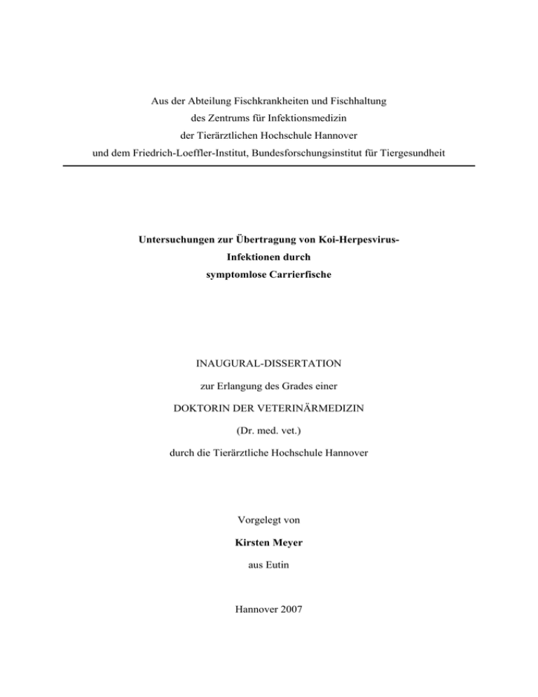 Aus der Abteilung Fischkrankheiten und Fischhaltung des Zentrums für Infektionsmedizin der Tierärztlichen Hochschule Hannover und dem Friedrich-Loeffler-Institut, Bundesforschungsinstitut für Tiergesundheit Untersuchungen zur Übertragung von Koi-HerpesvirusInfektionen durch symptomlose Carrierfische INAUGURAL-DISSERTATION zur Erlangung des Grades einer DOKTORIN DER VETERINÄRMEDIZIN (Dr. med. vet.) durch die Tierärztliche Hochschule Hannover Vorgelegt von Kirsten Meyer aus Eutin Hannover 2007 Wissenschaftliche Betreuung: A. pl .-Prof. Dr. Dieter Steinhagen Dr. Sven Michael Bergmann 1. Gutachter: A. pl.-Prof. Dr. Dieter Steinhagen 2. Gutachter: PD Dr. Martin Runge Tag der mündlichen Prüfung: 22.05.2007 Die Studie wurde durch die Wirtschaftsgemeinschaft des Zentralverbandes Zoologischer Fachbetriebe, Langen, finanziell unterstützt. Meiner Familie gewidmet Inhaltsverzeichnis 1 EINLEITUNG...................................................................................... 11 2 LITERATURÜBERSICHT................................................................ 13 2.1 Ätiologie................................................................................................................... 13 2.2 Vorkommen und Verbreitung des Koi Herpesvirus und anderer Herpesviren16 2.3 Wirtsspektrum........................................................................................................ 27 2.4 Epidemiologie ......................................................................................................... 29 2.5 Klinik ....................................................................................................................... 31 2.6 Pathogenese............................................................................................................. 33 2.7 Histologie................................................................................................................. 39 2.8 Immunologie ........................................................................................................... 41 2.9 Diagnose .................................................................................................................. 42 2.10 Differentialdiagnose ............................................................................................... 46 2.11 Bekämpfung und Impfung .................................................................................... 47 3 MATERIAL UND METHODEN....................................................... 51 3.1 Virus ........................................................................................................................ 51 3.1.1 Herkunft................................................................................................................... 51 3.1.2 Zellkultur ................................................................................................................. 51 3.1.3 Virusvermehrung ..................................................................................................... 51 3.1.4 Virustitration............................................................................................................ 52 3.1.5 Inaktivierung............................................................................................................ 52 3.1.6 Virusnachweis.......................................................................................................... 53 3.1.6.1 DNA-Extraktion ............................................................................................... 53 3.1.6.2 Spektroskopische Bestimmung der DNA-Konzentration ................................ 55 3.1.6.3 PCR .................................................................................................................. 56 3.1.6.4 Agarosegelelektrophorese der PCR-Produkte.................................................. 58 3.2 Trypanoplasma borreli ............................................................................................ 59 3.3 Versuchstiere .......................................................................................................... 60 3.3.1 Fische....................................................................................................................... 60 3.3.2 Aufzucht und Haltung.............................................................................................. 61 3.3.3 Handling .................................................................................................................. 61 3.3.4 Narkose und Töten................................................................................................... 61 3.3.5 Organentnahme........................................................................................................ 62 3.3.5.1 Entnahme von Gewebepoolproben .................................................................. 62 3.3.5.2 Entnahme von Kiemenbiopsien ....................................................................... 62 3.3.5.3 Entnahme und Separation von Leukozyten...................................................... 62 3.4 Stressversuche......................................................................................................... 63 3.4.1 Versuchsreihe 1 ....................................................................................................... 65 3.4.2 Versuchsreihe 2 ....................................................................................................... 65 3.4.3 Versuchsreihe 3 ....................................................................................................... 65 3.5 Untersuchung zum Wirtsspektrum des KHV ..................................................... 66 3.5.1 Untersuchung der Empfänglichkeit von Graskarpfen und Schleien für das KHV und der Rolle als Überträger........................................................................................... 66 3.5.2 Untersuchung der Rolle von Goldfischen und Silberkarpfen als symp
