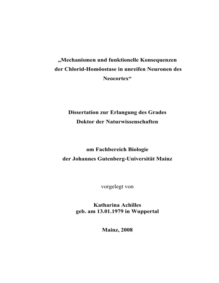 „Mechanismen und funktionelle Konsequenzen der Chlorid-Homöostase in unreifen Neuronen des Neocortex“ Dissertation zur Erlangung des Grades Doktor der Naturwissenschaften am Fachbereich Biologie der Johannes Gutenberg-Universität Mainz vorgelegt von Katharina Achilles geb. am 13.01.1979 in Wuppertal Mainz, 2008 Tag der mündlichen Prüfung: 18.12.2008 Inhaltsverzeichnis Inhaltsverzeichnis Inhaltsverzeichnis________________________________________________ I Abkürzungsverzeichnis _________________________________________ III 1 Einleitung _________________________________________________ 1 1.1 GABA und die Entwicklung des zentralen Nervensystems_____ 1 1.2 GABA: Inhibition oder Exzitation? _______________________ 2 1.3 Chloridhomöostase____________________________________ 5 1.4 Cajal-Retzius-Zellen___________________________________ 8 2 Zielsetzung der Arbeit ______________________________________ 12 3 Material und Methoden _____________________________________ 13 4 3.1 Präparation der Hirnschnitte____________________________ 13 3.2 Elektrophysiologische Messungen _______________________ 14 3.2.1 Patch-Clamp Technik_________________________________ 14 3.2.2 Gramicidin perforated patch Messungen__________________ 17 3.2.3 Das liquid junction Potential ___________________________ 18 3.2.4 Zellcharakterisierung _________________________________ 18 3.2.5 Berechnung des Ruhemembranpotentials _________________ 19 3.2.6 Bestimmung der intrazellulären Chloridkonzentration _______ 20 3.3 Histologie __________________________________________ 21 3.3.1 Biocytinfärbungen ___________________________________ 22 3.3.2 Immunohistochemische Färbungen ______________________ 23 3.4 Statistische Auswertung _______________________________ 24 3.5 Zusammensetzung der Lösungen ________________________ 25 Ergebnisse _______________________________________________ 28 4.1 Identifikation von Cajal-Retzius Zellen ___________________ 28 4.2 Validierung der Methode zur Bestimmung von [Cl-]i ________ 30 4.3 Cl- Homöostase in CR Zellen___________________________ 33 4.3.1 Bestimmung der nativen [Cl-]i in CR Zellen _______________ 33 4.3.2 NKCC1-Expression in CR Zellen _______________________ 35 I Inhaltsverzeichnis 4.3.3 Der Cl--Akkumulationsprozess _________________________ 36 4.3.3.1 Kinetik der Cl--Akkumulation _________________________ 37 4.3.3.2 Pharmakologie der Cl--Akkumulation ____________________ 39 4.3.4 Cl--Leitfähigkeiten in CR Zellen ________________________ 42 4.4 Effekte von GABA in CR Zellen ________________________ 45 4.4.1 GABAerge Exzitation ________________________________ 45 4.4.2 Unterschwellige GABAerge Membrandepolarisationen ______ 49 4.4.2.1 Effekte GABAerger Depolarisationen in Abhängigkeit von [Cl-]i __ 49 4.4.2.2 Zeitliche Auflösung der Effekte GABAerger Depolarisationen ____ 53 4.4.3 Mechanismen inhibitorischer GABAerger Membrandepolarisationen _____________________________________________ 55 4.4.3.2 Beitrag spannungsaktivierter Na+-Kanäle an der inhibitorischen Wirkung depolarisierender GABAerger Membranantworten _____________ 55 5 Diskussion _______________________________________________ 60 5.1 Die native [Cl-]i in CR Zellen___________________________ 60 5.2 Der Cl--Akkumulationsprozess in CR Zellen_______________ 61 5.3 Cl--Auswärtstransport in CR Zellen ______________________ 65 5.4 Effekte von GABA in CR Zellen ________________________ 66 5.5 Cl--Akkumulation und die Regulation von Netzwerkaktivität__ 69 5.6 Die Bedeutung elektrischer Aktivität in CR Zellen __________ 71 6 Zusammenfassung _________________________________________ 73 7 Literaturverzeichnis ________________________________________ 75 Danke _______________________________________________________ 89 II Abkürzungsverzeichnis Abkürzungsverzeichnis Abb. Abbildung 9-AC 9-Anthracencarbonsäure ACSF Artifizielle zerebrospinale Flüssigkeit Ca2+ Calcium-Ion Cl- Chlorid - Chloirdkonzentration - [Cl ]i intrazelluläre Chloirdkonzentration CR Zellen Cajal-Retzius Zellen Cm Membrankapazität DIDS 4,4’-Diisothiocynato-2,2’-Stilbendisulfonsäure EGABA Umkehrpotential GABAerger Ströme Em Membranpotential GABA γ-Aminobuttersäure GBZ Gabazin HCO3- Bicarbonat IGABA durch GABA induzierter Strom LJP liquid junctionpotential K+ K+-Ion KCC2 Kalium-Chlorid-Cotransporter, Isoform 2 Na+ Natrium-Ion NKCC2 Natrium-Kalium-Chlorid-Cotransporter, Isoform 1 NMDA N-Methyl-D-Aspartat PBS Phosphatgepufferte Salzlösung Rin Eingangswiderstand Rm Membranwiderstand RMP Ruhemembranpotential SEM Standardfehler des Stichproben-Mittelwertes [Cl ] III Abkürzungsverzeichnis TRIS Tris(hydroxymethyl)-aminomethan TTX Tetrodotoxin IV Einleitung 1 Einleitung 1.1 GABA und die Entwicklung des zentralen Nervensystems Die Entwicklung des Nervensystems ist ein komplexer und exakt regulierter Prozess. Die ersten Entwicklungsschritte - Induktion, Neurulation und Bläschenformation - sind genetisch reguliert. Die weitere Reifung des zentralen Nervensystems, einhergehend mit neuronaler Differenzierung, Schichtbildung des Kortex und neuronaler Netzwerkbildung, ist über die genetische Determination hinaus abhängig von der elektrischen Aktivität unreifer Nervenzellen (Khazipov & Luhmann, 2006). Dem Neurotransmitter γ-Aminobuttersäure (GABA) kommt dabei eine besondere Rolle zu. Schon vor der Bildung funktioneller Synapsen exprimieren Vorläuferzellen und reifende Neurone funktionelle GABA-Rezeptoren ((Demarque et al., 2002; Nguyen et al., 2001). Diese Rezeptoren werden durch extrazelluläres GABA aktiviert, das von Pionier-Neuronen, migrierenden Neuronen und Wachstumskegeln sezerniert wird (Represa & Ben Ari, 2005). In unreifen Neuronen bewirkt GABA eine Depolarisation der Zellmembran (Owens & Kriegstein, 2002; Ben-Ari et al., 1989; Yamada et al., 2004; Luhmann & Prince, 1991). Diese ist ausreichend, um spannungsaktivierte Calciumkanäle zu öffnen und so die intrazelluläre Ca2+-Konzentration ([Ca2+]i) zu erhöhen (Owens et al., 1996). Durch die Auf