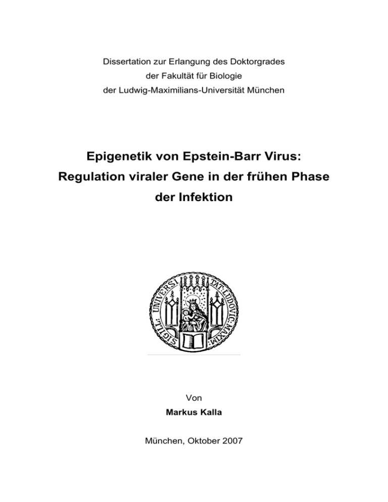Dissertation zur Erlangung des Doktorgrades der Fakultät für Biologie der Ludwig-Maximilians-Universität München Epigenetik von Epstein-Barr Virus: Regulation viraler Gene in der frühen Phase der Infektion Von Markus Kalla München, Oktober 2007 2 Erklärung Hiermit erkläre ich, dass die vorliegende Arbeit mit dem Titel „Epigenetik von Epstein-Barr Virus: Regulation viraler Gene in der frühen Phase der Infektion“ von mir ohne unerlaubte Hilfsmittel angefertigt wurde und ich mich dabei nur der ausdrücklich bezeichneten Quellen und Hilfsmittel bedient habe. Diese Arbeit wurde weder in der jetzigen noch in einer abgewandelten Form einer anderen Prüfungskommission vorgelegt. München, im Oktober 2007 Markus Kalla Dissertation eingereicht am 30.10.2007 1. Gutachter Prof. Dr. Dirk Eick 2. Gutachter Prof. Dr. Heinrich Leonhardt Tag der mündlichen Prüfung: 28.05.2008 Inhalt 3 Inhaltsverzeichnis 1. EINLEITUNG...........................................................................................................7 1.1 Das Epstein-Barr-Virus ..............................................................................................7 1.1.1 Biologische Relevanz ..................................................................................................................8 1.1.2 Vermehrungszyklus .....................................................................................................................9 1.1.2.1 Latenz ................................................................................................................................ 10 1.1.2.2 Der lytische Zyklus ............................................................................................................ 12 1.2 In vitro Systeme ........................................................................................................22 1.2.1 Epithel-Zell-Systeme ................................................................................................................ 22 1.2.2 B-Zell-Systeme.......................................................................................................................... 22 1.3 Reaktivierung des lytischen Zyklus in vitro............................................................23 1.3.1 Reaktivierung durch Stimuli der BCR-Signalkaskade ............................................................ 25 1.3.2 Reaktivierung durch Stimuli der TGF-! Signalkaskade ......................................................... 27 1.3.3 Induktion des lytischen Zyklus durch Chemikalien................................................................. 27 1.4 Inhibitoren des lytischen Zyklus .............................................................................28 1.5 Aufgabenstellung .....................................................................................................29 2. MATERIAL............................................................................................................31 2.1 Zelllinien und Bakterienstämme ..............................................................................31 2.1.1 Zelllinien .................................................................................................................................... 31 2.1.2 Bakterienstamm ........................................................................................................................ 31 2.2 Plasmide....................................................................................................................32 2.3 Antikörper, Enzyme und Proteine ...........................................................................33 2.4 Oligonukleotide ........................................................................................................34 2.5 Zellkulturmedien und Zusätze .................................................................................35 2.5.1 Medien für prokaryontische Zellen .......................................................................................... 35 2.5.2 Zellkulturmedium und Zusätze für die Kultivierung eukaryontischer Zellen ......................... 36 2.6 Kits und Standards...................................................................................................36 2.7 Chemikalien, Stammlösungen und sonstiges ........................................................37 2.7.1 Chemikalien, Geräte und Software.......................................................................................... 37 2.7.2 Stammlösungen und Puffer...................................................................................................... 39 3. METHODEN..........................................................................................................42 3.1 Bakterienkultur .........................................................................................................42 3.1.1 Vermehrung und Aufbewahrung von Bakterien...................................................................... 42 Inhalt 4 3.1.2 Transformation von E. coli ....................................................................................................... 42 3.2 Zellkultur und Analyse von Zellen ...........................................................................43 3.2.1 Zellkulturbedingungen .............................................................................................................. 43 3.2.2 Transiente Transfektion von Zellen und Generierung infektiöser Viruspartikel ................... 43 3.2.3 Bestimmung der Transformationseffizienz rekombinanter EBVs .......................................... 44 3.2.4 Immunfluoreszenzanalysen ..................................................................................................... 45 3.3 RNA-Arbeitstechniken..............................................................................................45 3.3.1 Isolierung gesamtzellulärer RNA ..........................................................................