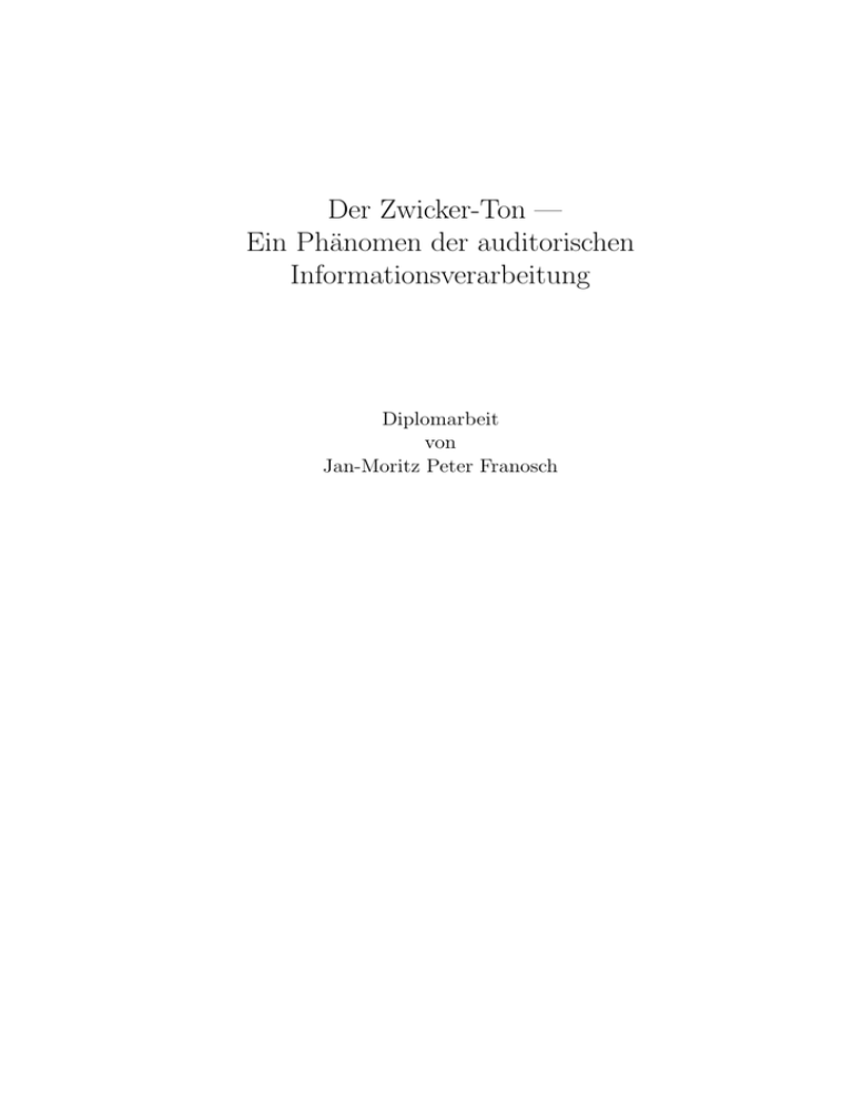 Vorliegende Arbeit soll solche Fragen angehen, indem über neuronale Verarbeitungsmechanismen nachgedacht wird, die mit den bekannten Beobachtungen verträglich sind und das psychoakustische Phänomen des ZwickerTons erklären. Der Zwicker-Ton kann folgendermaßen hervorgerufen werden: