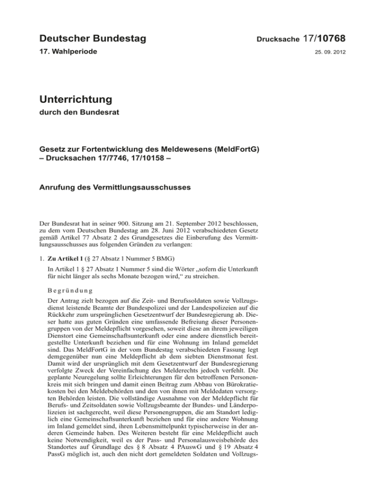 Deutscher Bundestag Drucksache 17. Wahlperiode Unterrichtung durch den Bundesrat Gesetz zur Fortentwicklung des Meldewesens (MeldFortG) – Drucksachen 17/7746, 17/10158 – Anrufung des Vermittlungsausschusses Der Bundesrat hat in seiner 900. Sitzung am 21. September 2012 beschlossen, zu dem vom Deutschen Bundestag am 28. Juni 2012 verabschiedeten Gesetz gemäß Artikel 77 Absatz 2 des Grundgesetzes die Einberufung des Vermittlungsausschusses aus folgenden Gründen zu verlangen: 1. Zu Artikel 1 (§ 27 Absatz 1 Nummer 5 BMG) In Artikel 1 § 27 Absatz 1 Nummer 5 sind die Wörter „sofern die Unterkunft für nicht länger als sechs Monate bezogen wird,“ zu streichen. Begründung Der Antrag zielt bezogen auf die Zeit- und Berufssoldaten sowie Vollzugsdienst leistende Beamte der Bundespolizei und der Landespolizeien auf die Rückkehr zum ursprünglichen Gesetzentwurf der Bundesregierung ab. Dieser hatte aus guten Gründen eine umfassende Befreiung dieser Personengruppen von der Meldepflicht vorgesehen, soweit diese an ihrem jeweiligen Dienstort eine Gemeinschaftsunterkunft oder eine andere dienstlich bereitgestellte Unterkunft beziehen und für eine Wohnung im Inland gemeldet sind. Das MeldFortG in der vom Bundestag verabschiedeten Fassung legt demgegenüber nun eine Meldepflicht ab dem siebten Dienstmonat fest. Damit wird der ursprünglich mit dem Gesetzentwurf der Bundesregierung verfolgte Zweck der Vereinfachung des Melderechts jedoch verfehlt. Die geplante Neuregelung sollte Erleichterungen für den betroffenen Personenkreis mit sich bringen und damit einen Beitrag zum Abbau von Bürokratiekosten bei den Meldebehörden und den von ihnen mit Meldedaten versorgten Behörden leisten. Die vollständige Ausnahme von der Meldepflicht für Berufs- und Zeitsoldaten sowie Vollzugsbeamte der Bundes- und Länderpolizeien ist sachgerecht, weil diese Personengruppen, die am Standort lediglich eine Gemeinschaftsunterkunft beziehen und für eine andere Wohnung im Inland gemeldet sind, ihren Lebensmittelpunkt typischerweise in der anderen Gemeinde haben. Des Weiteren besteht für eine Meldepflicht auch keine Notwendigkeit, weil es der Pass- und Personalausweisbehörde des Standortes auf Grundlage des § 8 Absatz 4 PAuswG und § 19 Absatz 4 PassG möglich ist, auch den nicht dort gemeldeten Soldaten und Vollzugs- 17/10768 25. 09. 2012 Drucksache 17/10768 –2– Deutscher Bundestag – 17. Wahlperiode beamten der Bundes- und Landespolizeien auf Antrag einen Personalausweis oder Pass auszustellen. Hinsichtlich Berufs- und Zeitsoldaten der Bundeswehr und Vollzugsbeamte der Bundespolizei erfolgt eine Angleichung an die in den meisten Ländern derzeit geltenden Regelungen für Vollzugsbeamte der Landespolizeien. Eine freiwillige Anmeldung am Standort bleibt den Soldaten und Vollzugsbeamten der Bundes- und Länderpolizeien zudem unbenommen. Die Beibehaltung der vom Bundestag beschlossenen Regelung würde zu einem erhöhten administrativen Aufwand für pendelnde Soldaten und Vollzugsbeamte der Bundes- und Länderpolizeien führen. Auch führt die Regelung in einer ganzen Reihe von Fällen zu finanziellen Mehrbelastungen aufgrund der in zahlreichen Kommunen zu entrichtenden Zweitwohnungssteuer. Für diejenigen Länder, die relativ viele Zeit- und Berufssoldaten stellen, aber selbst nur über wenig Standortgemeinden verfügen, besteht zudem die Gefahr erheblicher finanzieller Belastungen. Die vom Bundestag beschlossene Änderung würde letztlich eine Abwanderung suggerieren, womit negative finanzielle Auswirkungen im Länderfinanzausgleich verbunden wären. Gerade für eher kurz dienende Zeitsoldaten ist aber anzunehmen, dass sich ihr Lebensmittelpunkt weiter in ihrem Heimatland befindet und sie regelmäßig auch während der Dienstzeit dahin zurückkehren. Absatz 1 Satz 2 und 3, Absatz 3 Nummer 2, Absatz 4, 2. Zu Artikel 1 (§ 44 §§ 47, 54 Absatz 1 und 2 Nummer 12 und 12a – neu –, Absatz 3 BMG) Artikel 1 ist wie folgt zu ändern: a) § 44 ist wie folgt zu ändern: aa) Absatz 1 ist wie folgt zu ändern: aaa) In Satz 2 sind die Wörter „für Zwecke der Werbung oder des Adresshandels“ durch die Wörter „für gewerbliche Zwecke“ zu ersetzen. bbb) Satz 3 ist zu streichen. bb) Absatz 3 Nummer 2 ist wie folgt zu fassen: „2. die Auskunft verlangende Person oder Stelle erklärt, die Daten nicht zu verwenden für Zwecke a) der Werbung oder b) des Adresshandels, es sei denn die betreffende Person hat in die Übermittlung für jeweils diesen Zweck eingewilligt.“ cc) Absatz 4 ist wie folgt zu fassen: „(4) Es ist verboten, Daten aus einer Melderegisterauskunft 1. ohne dass ein Zweck gemäß Absatz 1 Satz 2 bei der Anfrage angegeben wurde gewerblich, oder 2. entgegen einer Erklärung gemäß Absatz 3 Nummer 2 für die dort genannten Zwecke zu verwenden.“ Deutscher Bundestag – 17. Wahlperiode –3– b) § 47 ist wie folgt zu fassen: „§ 47 Zweckbindung der Melderegisterauskunft „(1) Bei Melderegisterauskünften nach § 44 zu gewerblichen Zwecken und bei Melderegisterauskünften nach den §§ 45 und 46 sowie bei Vorliegen einer Auskunftssperre nach § 51 Absatz 1 darf der Empfänger die Daten nur für den Zweck verwenden, zu dessen Erfüllung sie ihm übermittelt wurden. Danach sind die Daten zu löschen. (2) Soweit Daten zum Zwecke der geschäftsmäßigen Anschriftenermittlung für Dritte erhoben werden, dürfen diese nicht wiederverwendet werden.“ c) § 54 ist wie folgt zu ändern: aa) Absatz 1 ist wie folgt zu fassen: „(1) Ordnungswidrig handelt, wer 1. entgegen § 19 Absatz 6 eine Wohnungsanschrift anbietet oder zur Verfügung stellt, 2. Auskunft für Zwecke nach § 44 Absatz 3 Nummer 2 verlangt, obwohl ihm die erforderliche Einwilligung nicht vorliegt.“ bb) Absatz 2 ist wie folgt zu ändern: aaa) Nummer 12 ist wie folgt zu fassen: „12. entgegen § 44 Absatz 4 Nummer 1 oder 2 Daten verwendet,“ bbb) Nach Nummer 12 ist folgende Nummer 12a einzufügen: „12a. entgegen § 47 Absatz 2 D