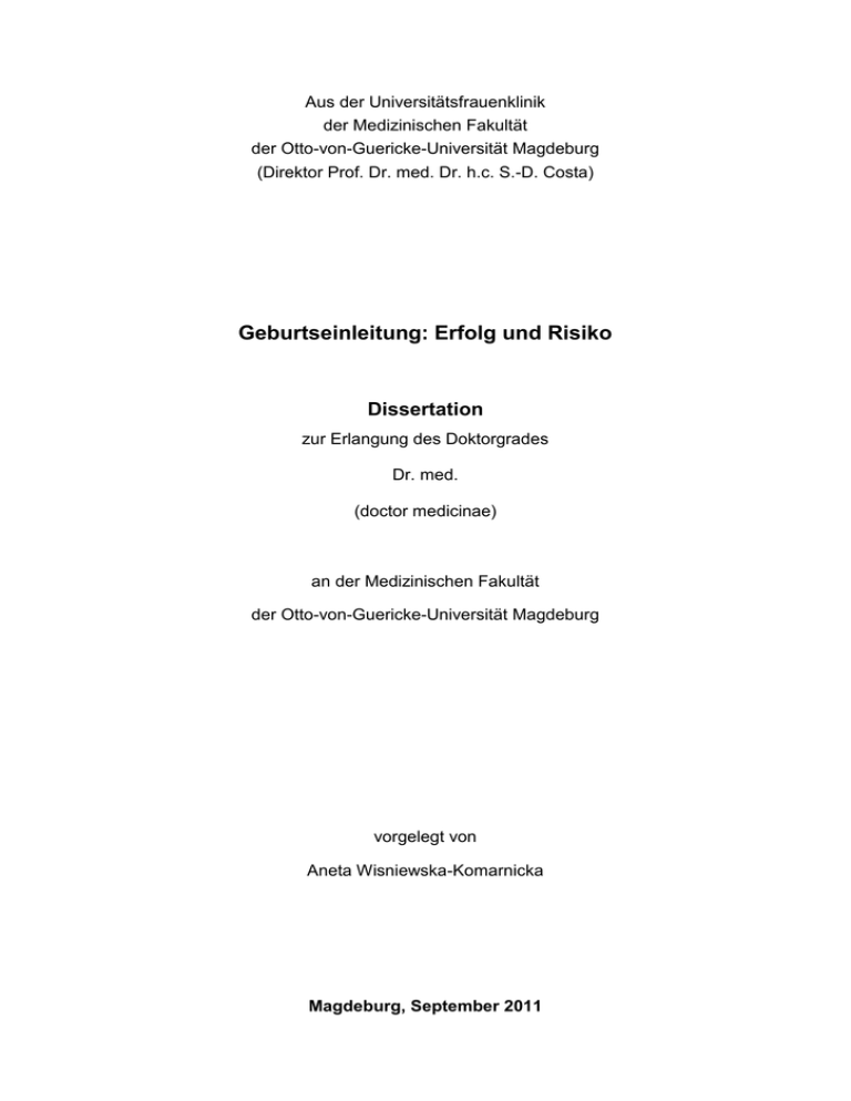 Aus der Universitätsfrauenklinik der Medizinischen Fakultät der Otto-von-Guericke-Universität Magdeburg (Direktor Prof. Dr. med. Dr. h.c. S.-D. Costa) Geburtseinleitung: Erfolg und Risiko Dissertation zur Erlangung des Doktorgrades Dr. med. (doctor medicinae) an der Medizinischen Fakultät der Otto-von-Guericke-Universität Magdeburg vorgelegt von Aneta Wisniewska-Komarnicka Magdeburg, September 2011 Bibliographische Angaben Bibliographische Beschreibung: Wisniewska-Komarnicka, - 76 Bl.: 8 Abb., 30 Tab. Aneta: Geburtseinleitung: Erfolg und Risiko. 2011 Kurzreferat: Die Geburtseinleitung ist heutzutage eine der wichtigsten Maßnahmen in der Geburtshilfe. Die elektive Geburtseinleitung scheint grundsätzlich die Sectiorate, im Vergleich zu einem abwartenden Vorgehen, zu senken. Allerdings wird noch sehr häufig über den richtigen Zeitpunkt der Einleitung, die notwendigen Indikationen sowie die Art der Geburtseinleitung am Termin diskutiert. Das Ziel unserer Untersuchung war es, die Risiken und den Erfolg der verschiedenen Geburtseinleitungsmethoden zu analysieren und zu vergleichen. Zwischen Januar 2006 und Dezember 2008 wurden an der Universitätsfrauenklinik Magdeburg 613 Geburtseinleitungen mittels Oxytocin, Prostaglandinen, Kombination von Oxytocin und Prostaglandinen sowie anderen Methoden, z.B. Amniotomie, aufgrund unterschiedlicher Indikationen durchgeführt. Die Einleitungsindikationen, der Entbindungsmodus, der Einleitungserfolg sowie die Komplikationen wurden retrospektiv analysiert. Schlüsselwörter: Geburtseinleitung, Geburtseinleitungsmethoden, Oxytocin, Prostaglandine, Sectiorate Inhaltsverzeichnis 1 EINLEITUNG ..................................................................................................... 1 1.1 GEBURTSEINLEITUNG ................................................................................................................................ 1 1.1.1 Definition und epidemiologische Daten .......................................................................................... 1 1.1.2 Indikationen und Kontraindikationen ............................................................................................. 2 1.2 METHODEN DER GEBURTSEINLEITUNG.................................................................................................... 10 1.2.1 Oxytocin ........................................................................................................................................ 10 1.2.1.1 1.2.1.2 1.2.1.3 1.2.1.4 1.2.2 Prostaglandine und Prostaglandin-Derivate ................................................................................ 19 1.2.2.1 1.2.2.2 1.2.2.3 1.2.2.4 1.3 2 Struktur und Funktionen ........................................................................................................................... 11 Pharmakokinetik und Pharmakodynamik ................................................................................................. 12 Anwendungsbereiche außerhalb der Gynäkologie und Geburtshilfe ........................................................ 13 Oxytocin in der Gynäkologie und Geburtshilfe ........................................................................................ 13 Struktur und Funktionen ........................................................................................................................... 19 Pharmakokinetik und Pharmakodynamik ................................................................................................. 20 Anwendungsbereiche außerhalb der Gynäkologie und Geburtshilfe ........................................................ 21 Prostaglandine in Gynäkologie und Geburtshilfe ..................................................................................... 21 ZIELE DER ARBEIT ................................................................................................................................... 28 MATERIAL UND METHODEN .........................................................................29 2.1 2.2 2.3 3 PATIENTENKOLLEKTIV ............................................................................................................................ 29 UNTERSUCHUNGSPARAMETER................................................................................................................. 29 STATISTIK ................................................................................................................................................ 32 ERGEBNISSE...................................................................................................33 3.1 AUSGANGSSITUATION ............................................................................................................................. 33 3.2 ANAMNESE .............................................................................................................................................. 33 3.3 METHODEN.............................................................................................................................................. 35 3.3.1 Zeit bis zum Einleitungserfolg ....................................................................................................... 38 3.3.2 Medikamentendosierung ............................................................................................................... 40 3.3.2.1 3.3.2.2 3.4 3.5 3.6 3.7 3.8 Oxytocin ................................................................................................................................................... 40 Prostaglandine .......................................................................................................................................... 40 INDIKATIONEN ZUR GEBURTSEINLEITUNG ............................................................................................... 41 ANALGESIE UNTER DER GEBURT ............................................................................................................. 44 ENTBINDUNGSMODUS