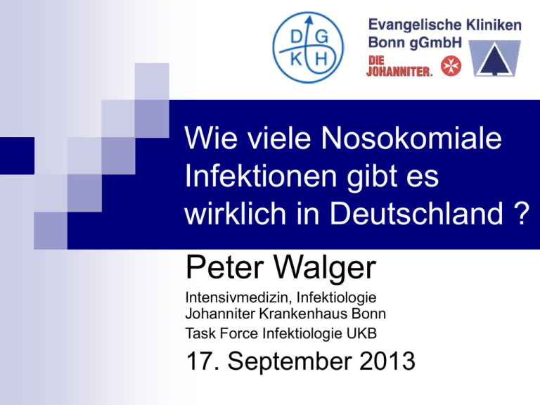 Wie viele Nosokomiale Infektionen gibt es wirklich in Deutschland ? Peter Walger Intensivmedizin, Infektiologie Johanniter Krankenhaus Bonn Task Force Infektiologie UKB 17. September 2013 Warum will Wer Was wissen? Das Messen von Krankenhausinfektionen Der Patient: Welches Risiko habe ich bei meinem Krankenhausaufenthalt / Eingriff ? Der Klinikarzt: Welche Risiken hat mein Patient? Welche Qualität hat meine Arbeit? Wo liegt Potential zur Verbesserung? Die Klinik: Was schadet der Ökonomie? Was schadet dem Ruf des Hauses? Wo steht das Haus im Qualitätsvergleich? •Ermittlung von Benchmarks (25-50-75% Quantil) Überschreiten induziert Handlungsbedarf Unterschreiten beruhigt •Die Erfassungssysteme sind nicht geeignet, die Gesamtzahl der nosokomialen Infektionen Festzustellen (Inzidenz – Prävalenz) Ausschuß für Gesundheit, 116. Sitzung, 25. 03. 2009 Zastrow (DGKH): 500.000 – 800.000 NI in Deutschland* 8% Sepsis = 40.000 Fälle,40% Letalität = 16.000 Tote (Bezug: SepNet) Juditzki (DKG) 400.000 – 600.000 NI** 10.000 – 15.000 Tote, eher weniger Beispiel ECDC: In Europa 37.000 Tote /a, auf Deutschland berechnet: 7.500 Tote (?) *Geffers, Gastmeier, Rüden (RKI 2002): 500.000 – 800.000 NI ** Gastmeier, Geffers (DMW 2008): 400.000 – 600.000 NI Wieviele nosokomiale Infektionen gibt es ? Stichproben als Basis für Hochrechnungen* Erfassungszeitraum Inzidenz * USA CDC – 2002 NNIS Daten 1992 10% USA Public Health Report 2007 2002 4,5% UK 42nd Report House of Commons 2000 1995 9% UK 52nd Report House of Commons 2009 2007 9% sind Circulaire DGS/VS 1995 Keine konkreten Angaben (Schätzungen) Frankreich Unterschätzung 3 – 6% *in % der Gesamtzahl vollstationärer Patienten pro Jahr Wieviele nosokomiale Infektionen gibt es ? Stichproben als Basis für Hochrechnungen* Erfassungszeitraum Inzidenzrate (% pro Jahr) 1980 – 1994 2011/12 (ECDC) 6,1 – 9,3% 7,1% Europa Diverse Studien WHO 14 Länder 1983 – 1985 Deutschland NIDEP 1 1994 Deutschland DKG 1990 (DTI Daten 1987) 6,3% Deutschland NIDEP 2 1995 – 1998 6,9% Deutschland KISS seit 1996 500.000 – 800.000 NI* 8,4% (median) 3,5% (mean) *aus: Gesundheitsberichterstattung des Bundes, Heft 8 Nosokomiale Infektionen, RKI 2002 Wieviele nosokomiale Infektionen gibt es ? Stichproben als Basis für Hochrechnungen* Erfassungszeitraum Inzidenzrate (% pro Jahr) 1980 – 1994 2011/12 (ECDC) 6,1 – 9,3% 7,1% Europa Diverse Studien WHO 14 Länder 1983 – 1985 Deutschland NIDEP 1 1994 Deutschland DKG 1990 (DTI Daten 1987) 6,3% Deutschland NIDEP 2 1995 – 1998 6,9% Deutschland KISS seit 1996 500.000 – 800.000 NI* 8,4% (median) 3,5% (mean) *aus: Gesundheitsberichterstattung des Bundes, Heft 8 Nosokomiale Infektionen, RKI 2002 NIDEP-1 (3,5%): Zentrale Kritikpunkte Auswahl der Krankenhäuser mit geringer Rate Schwerkranker Niedrige Beatmungsrate (26,7%) Methode der Datenerhebung durch „travelling surveillants“ Fehlende mikrobiologische Daten, Verlust von Fällen C. Ruef. Prevalence of Nosocomila infections – Who Knows the true Rate? Infection 1997;25(4):203-5 Stellungnahme führender Krankenhaushygieniker, Mikrobiologen, Vertreter wiss. Fachgesellschaften und ärztlicher Standesorganisationen 1996 in Hyg Med 21(6):313-322 „….muß aufgrund der Verwendung der Prävalenzstudie und der dargestellten Mängel in der gesamten Durchführung dieser Studie festgestellt werden, daß die erhobenen Daten für eine Aussage zur Häufigkeit des Vorkommens von NI in deutschen Krankenhäusern und deren Bewertung ungeeignet sind….. Vielmehr sind die Daten der NIDEP-Studie geeignet, die dringend erforderlichen Qualitätsmassnahmen im Rahmen der Krankenhaushygiene in deutschen Krankenhäusern zu gefährden“ Hochrechnungen auf der Basis publizierter NI-Raten (% pro Jahr) Zahl der vollstationären Patienten 2011: 18.774.027 NIDEP 1* (1994) 3,5% KH mit eigenem MiBi-Labor 5,08% Labor in anderer Stadt 2,88% 657.091 953.720 540.692 DKG 1990 6,3% 1.182.763 NIDEP 2 (1995 – 1998) 6,9% 1.295.407 *Nosokomiale Infektionen in Deutschland – Erfassung und Prävention. Daschner F et al. Band 56, BMG 1995 Hochrechnungen auf der Basis publizierter NI-Raten (% pro Jahr) Zahl der vollstationären Patienten 2011: 18.774.027 NIDEP 1* (1994) 3,5% KH mit eigenem MiBi-Labor 5,08% Labor in anderer Stadt 2,88% 657.091 953.720 540.692 DKG 1990 6,3% 1.182.763 NIDEP 2 (1995 – 1998) 6,9% 1.295.407 *Nosokomiale Infektionen in Deutschland – Erfassung und Prävention. Daschner F et al. Band 56, BMG 1995 Weniger Blutkulturen – weniger Infektionen ? Gastmeier P et al. Anaesthesist 2011;60:902-907 223 Intensivstationen Mediane Anzahl der BK-Paare im Jahr 2006: 60 Variationsbreite 3,2–680/1000 Patiententage Ein Anstieg der BK-Frequenz um 100 BK/1000 Patiententage führte zu einem 1,27-fachen Anstieg der Inzidenzdichte der ZVK-Sepsis (95%-Konfidenzintervall, 95%-KI 1,01–1,26). Weniger Blutkulturen – weniger Infektionen ? Gastmeier P et al. Anaesthesist 2011;60:902-907 223 Intensivstationen „…Sofern ein externes Benchmarking der ist, muss eine Intensivstationen Mediane Anzahlbeabsichtigt der BK-Paare im Jahr 2006: 60 Adjustierung der ZVK-assoziierten Variationsbreite 3,2–680/1000 Sepsisraten Patiententage entsprechend der BK-Frequenz erfolgen. Eine Ein Anstieg der BK-Frequenz um 100 BK/1000 Patiententage ausreichende Blutkultivierungsfrequenz sollte sich führte zu einem 1,27-fachen Anstieg der Inzidenzdichte derals Qualitätsparameter in der Intensivmedizin ZVK-Sepsis (95%-Konfidenzintervall, 95%-KI 1,01–1,26). etablieren…“. European Antimicrobial Resistance Surveillance Network (EARS) 2010 DOI 10.1055/s-0033-1349481, Dtsch Med Wochenschr 02013; 1380: 1717–1722 · © GeorgThieme Verlag KG · Stuttgart · New York · ISSN 0012-04721439 DOI 10.1055/s-0033-1349481, Dtsch Med Wochenschr 02013; 1380: 1717–1722 · © GeorgThieme Verlag KG · Stuttgart · New York · ISSN 0012-04721439 09/2011–08/2012: 30 631 Patienten: 1637 nosokomiale Infektionen nach CDC-Krit